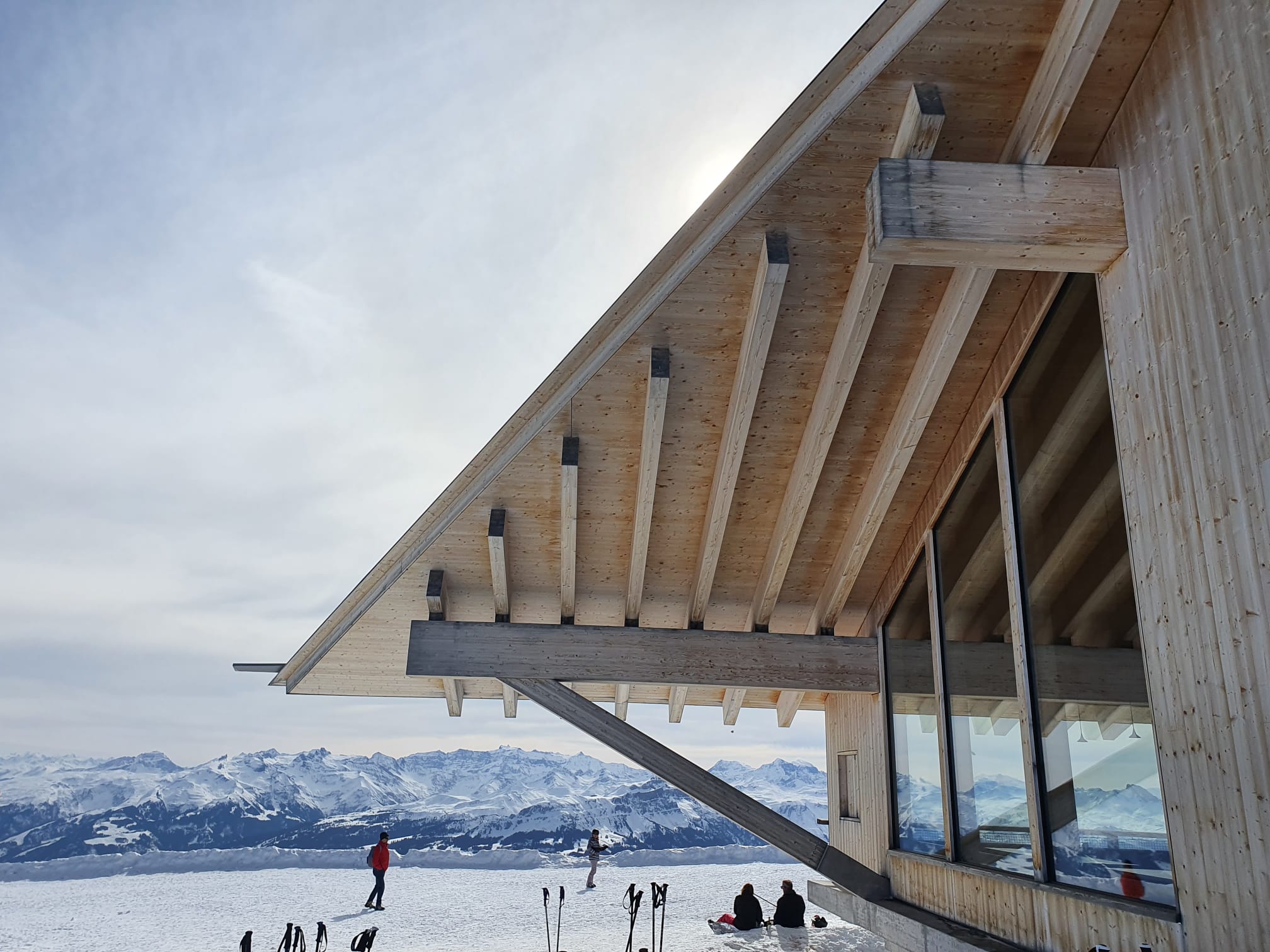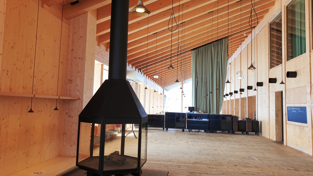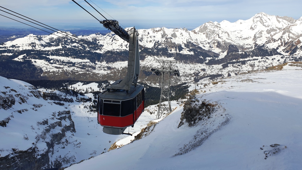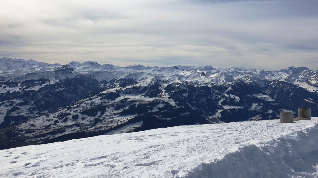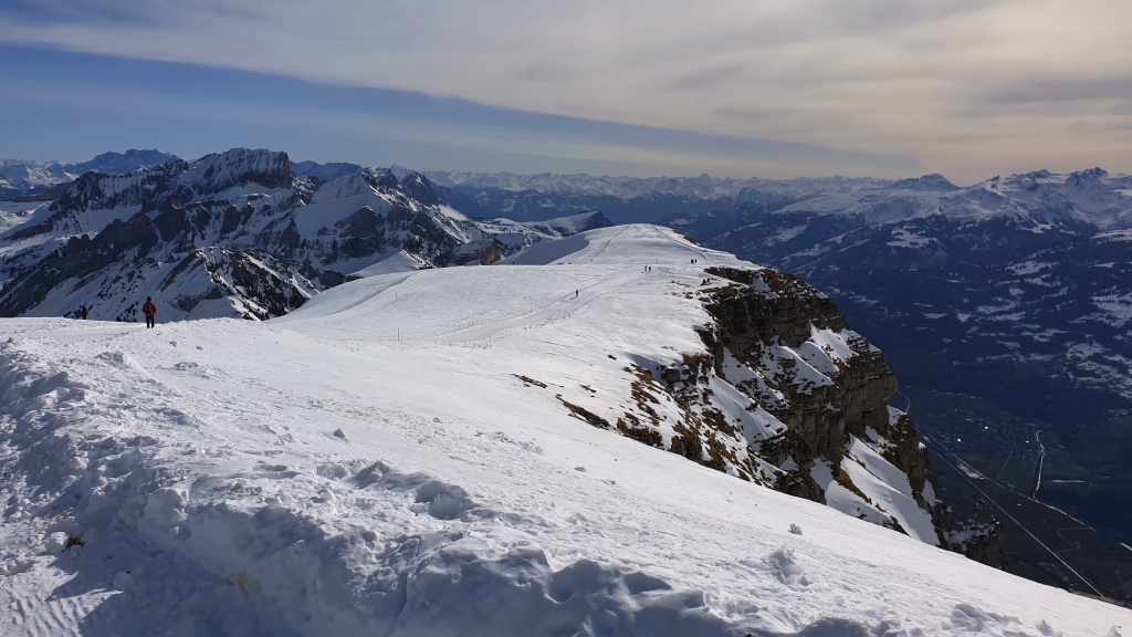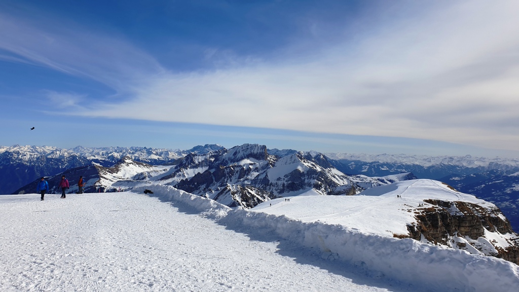 Auf dem Iltios steigen wir um in die Seilbahn zum Chäserrugg. Oben angekommen, auf 2262 m. ü. M. steigen wir aus und werden von einem frischen Wind überrascht. Wir sehen uns das von Gipfelgebäude an, welches von den Architekten Herzog & de Meuron entworfen wurde. Sieht toll aus, leider sind die Restaurants wegen Corona geschlossen und auch die Terrassen. Es gibt nur Take-away und im Schnee sitzen.