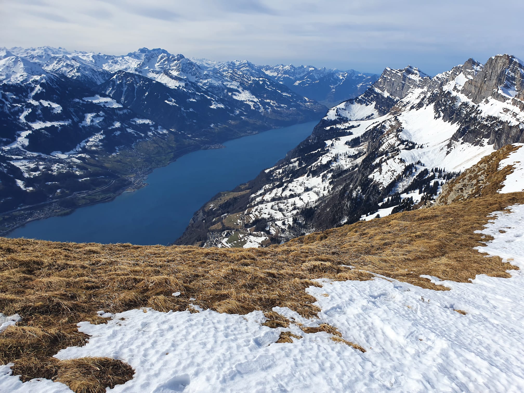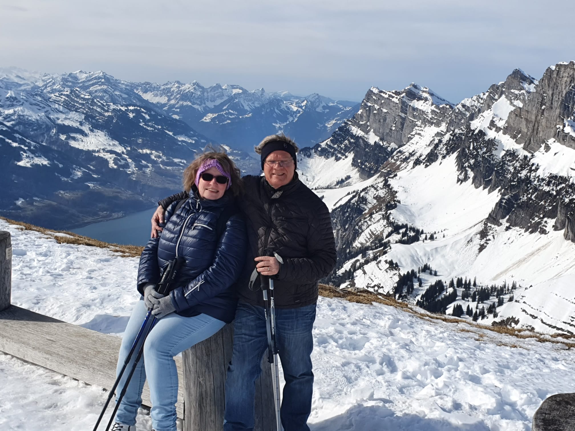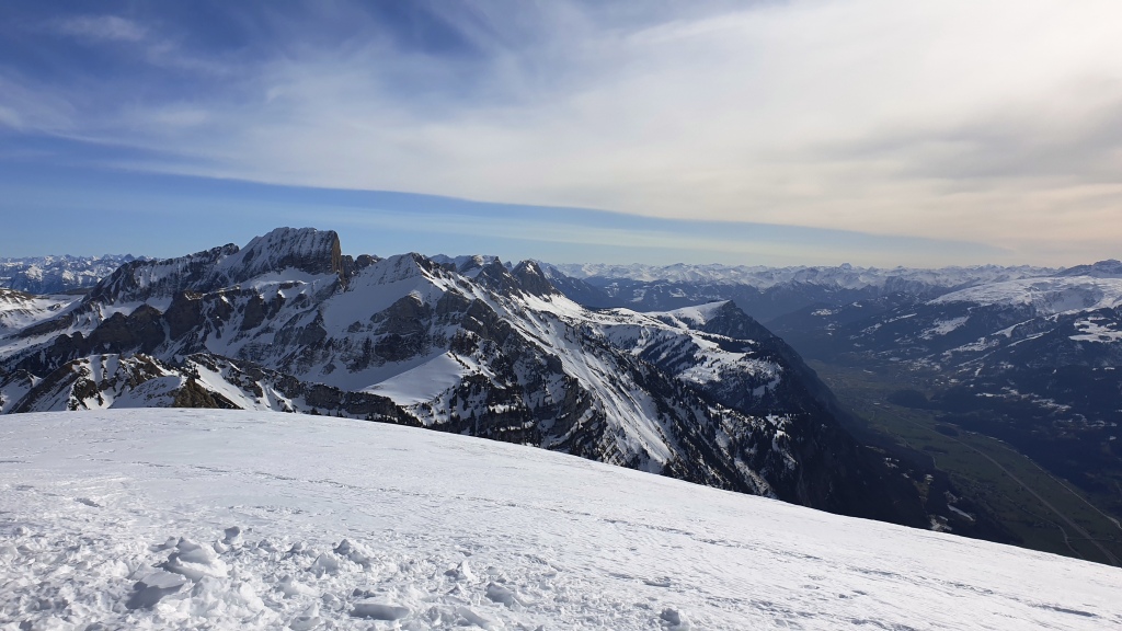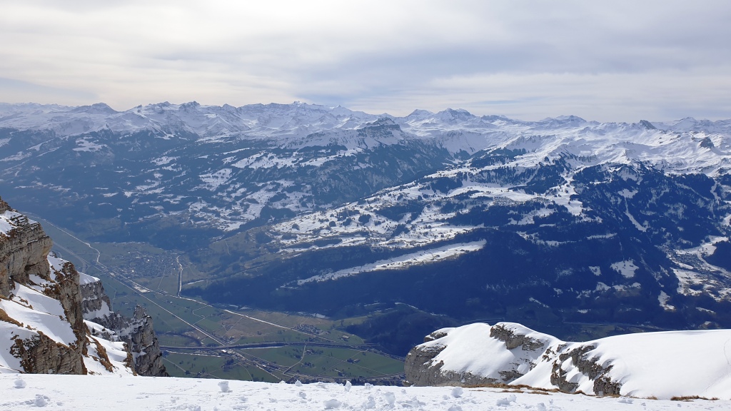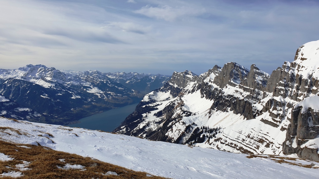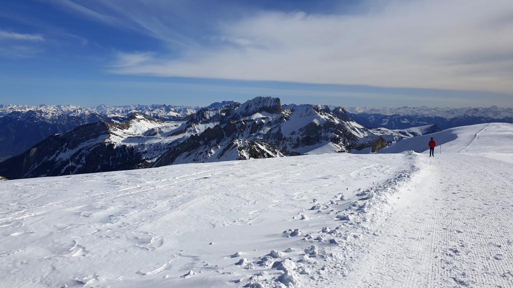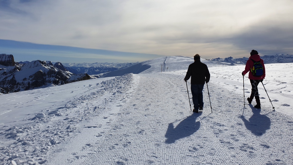Wir sehen sogar den Walensee und auf der anderen Seite den Säntis. Es macht mega Spass auf dem gut präparierten Weg auf dem Schnee zu laufen. Das Wetter trägt natürlich auch noch dazu bei, dass es ein toller Ausflug ist.