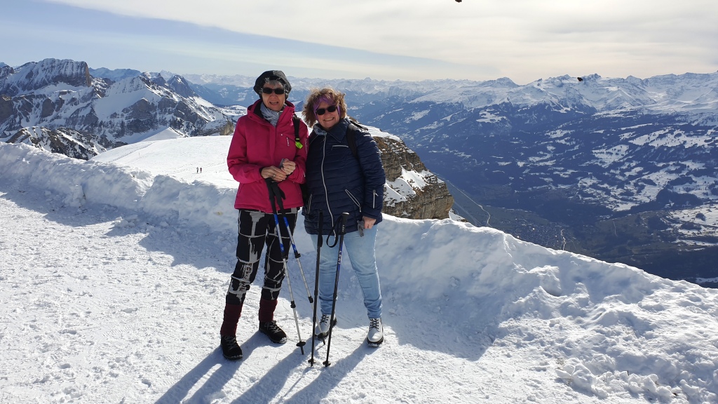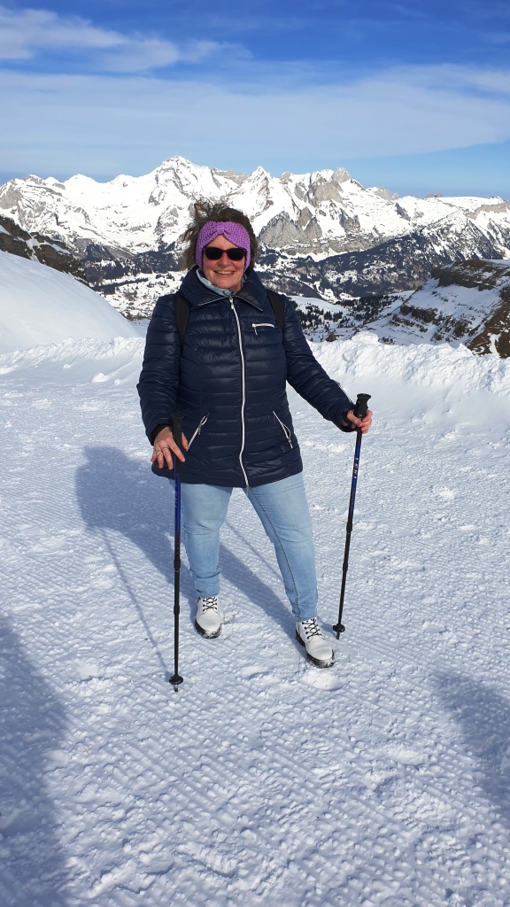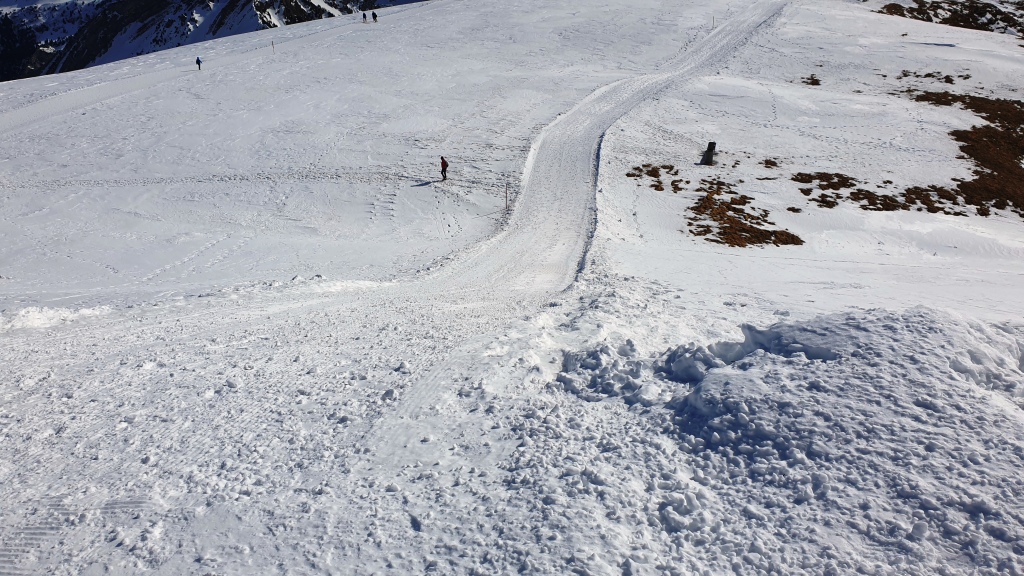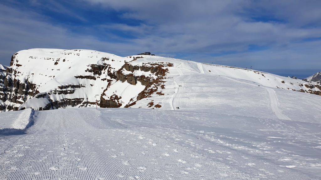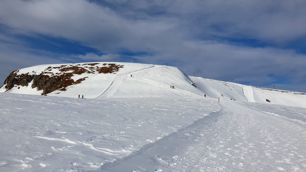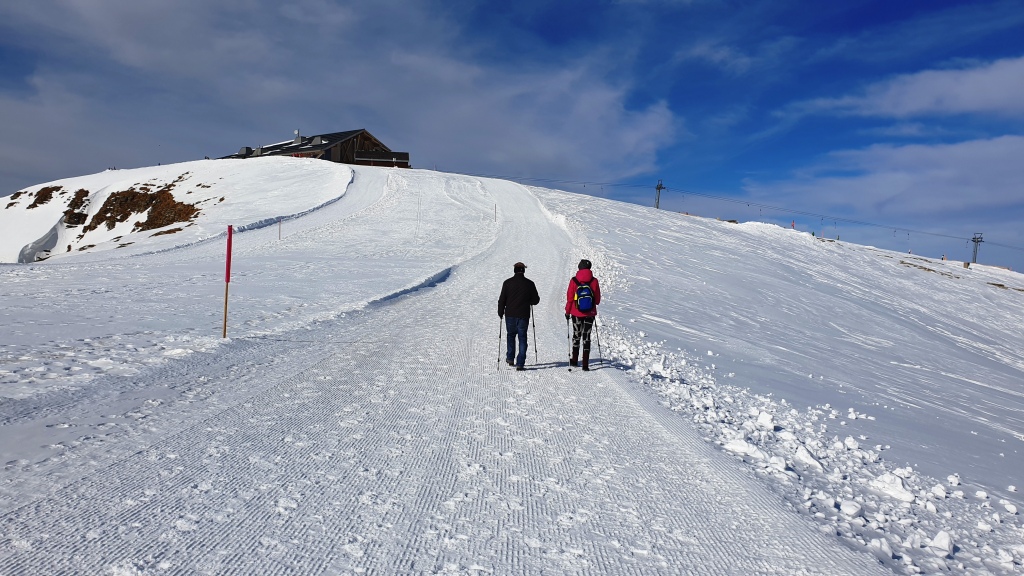 Zuerst geniessen wir noch die Aussicht und den Blick auf die Skipiste. Dann geht es aber los. Gut haben wir noch die Handschuhe und Mütze oder Stirnband eingepackt, der Wind ist recht zügig.