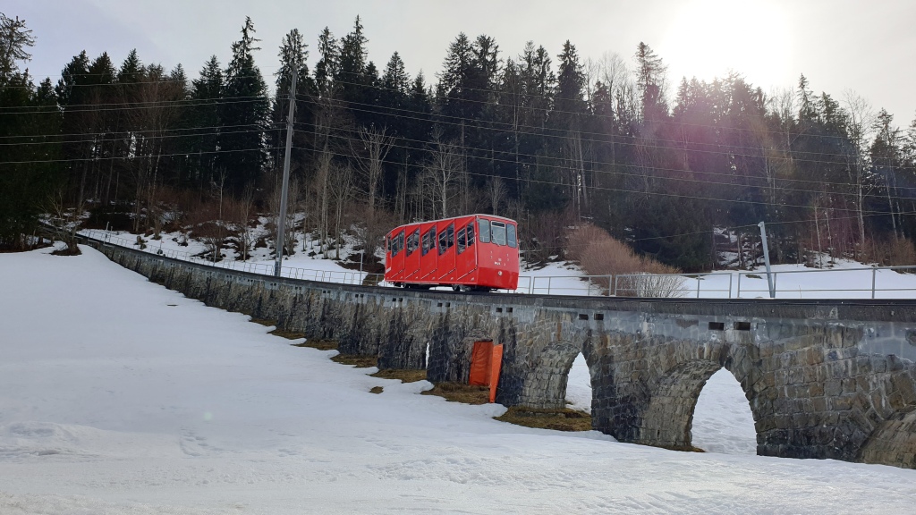 Einen steilen Aufstieg meistern wir dank der Stöcke sehr gut, alternativ hätte man auch auf dem weniger steilen Hinweg zurücklaufen können. Nach ca. 1 1/2 Stunden sind wir wieder zurück am Ausgangspunkt. Da das Restaurant nur Take-away anbietet, entschliessen wir uns direkt mit der Bahn wieder hinunterzufahren und den Zvieri zu Hause zu nehmen.