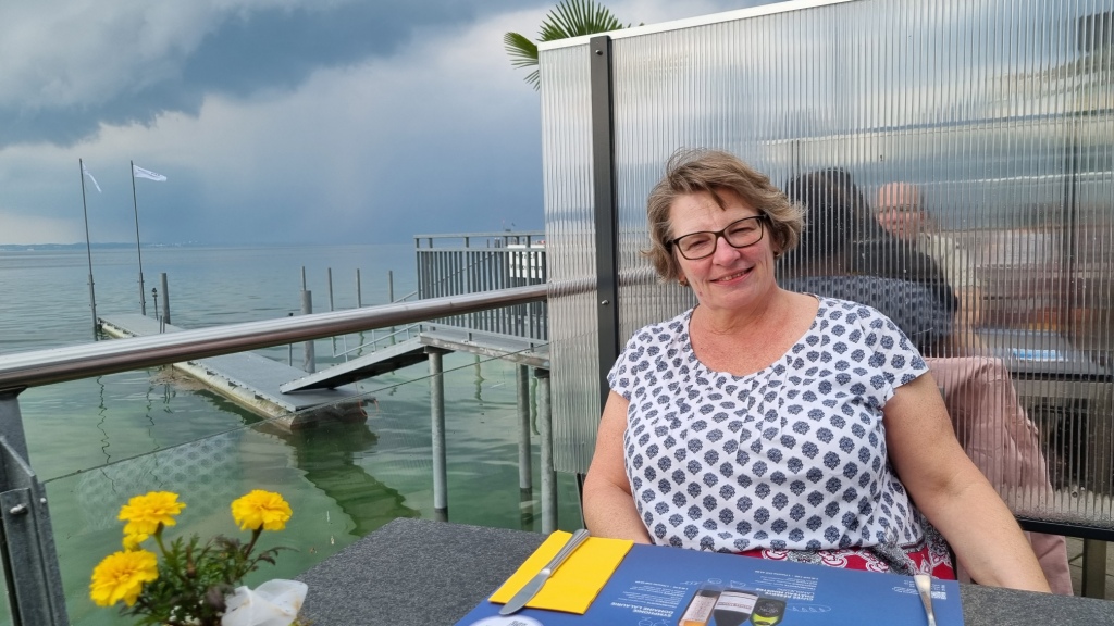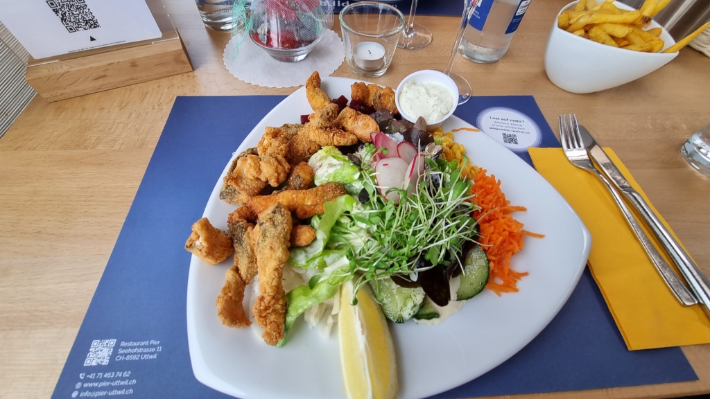 Wir machen uns etwas frisch, ruhen uns ein bisschen aus und genehmigen uns einen Aperol Spritz im Garten des Hotels. Für das Abendessen haben wir am See im Restaurant Pier einen Tisch reserviert. Wir spazieren hinunter durch das kleine Dorf Uttwil, doch es braut sich ein Gewitter zusammen. 5 Minuten können wir draussen am See sitzen, dann beginnt es leider zu regnen und wir müssen ins Restaurant hinein. Aber auch drinnen sitzt es sich schön, nah am Wasser und wir beobachten das Gewitter aus dem Trockenen. Wir essen feine Knusperli vom Bodensee und geniessen den ersten Abend unserer Rundreise am See.