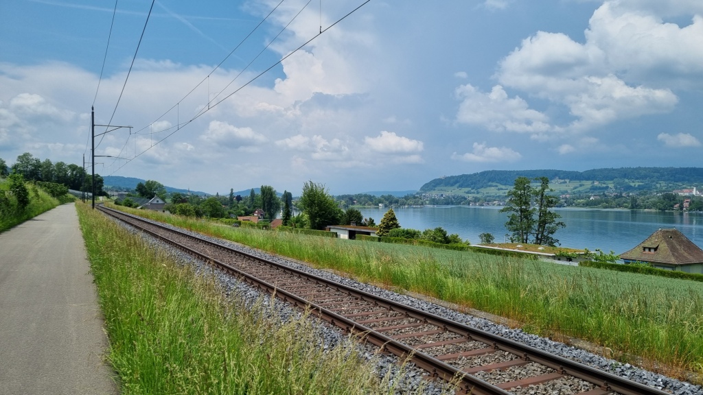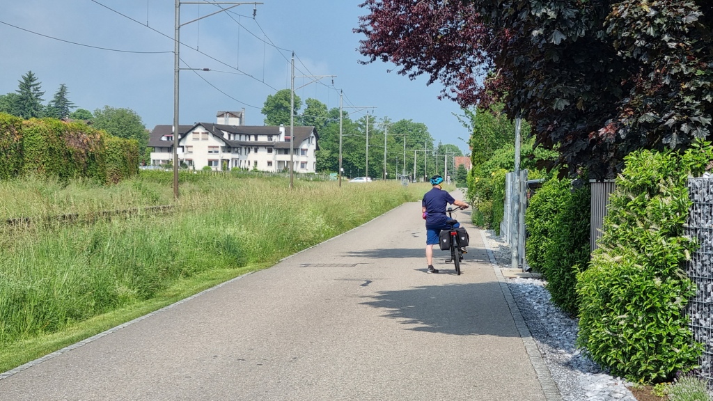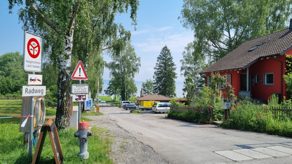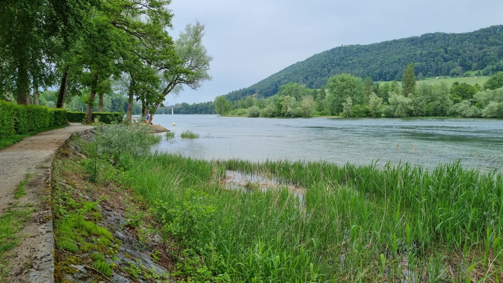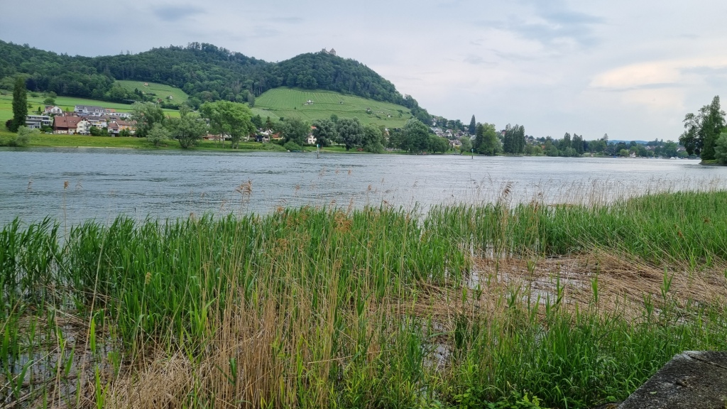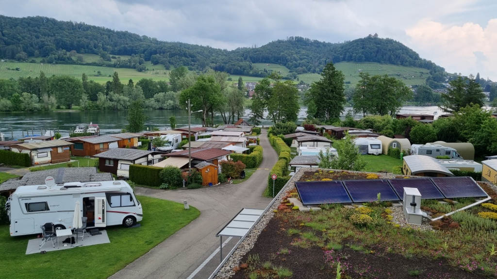 Der Weg führt dann sehr nah am Untersee vorbei durch Berlingen und Steckborn, dann dem Bahngleis entlang etwas weg vom See mit ein paar Steigungen bis Stein am Rhein. Von dort aus fahren wir zum Campingplatz Wagenhausen, wo wir im Landgasthof ein Zimmer reserviert haben. Das Zimmer ist riesig mit Nespresso Kaffeemaschine, separater Sitzecke und mit toller Aussicht auf den Rhein. Das Bad ist auch gross bemessen, etwas 80er Jahre Style aber ist o.k. Die Fahrräder können wir in einem abgeschlossenen Abstellraum einstellen. Auf dem Campingplatz hat es ein neues Schwimmbad, das sehr schön aussieht. Aus Zeitmangel konnten wir es nicht testen. Wir haben Bekannte auf dem Zeltplatz, die hier ein Wochenendhäuschen besitzen und wir haben uns mit ihnen getroffen und den Nachmittag im Garten verbracht. Am Abend haben wir zusammen im Landgasthof gegessen. Die Küche ist gutbürgerlich, wir haben fein gegessen und den Abend auf dem Campingplatz genossen.