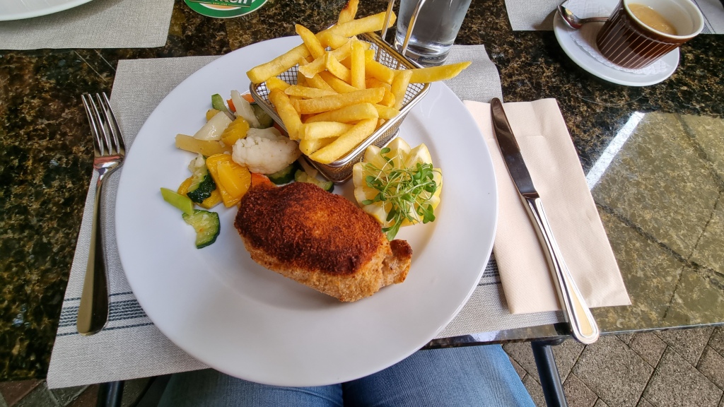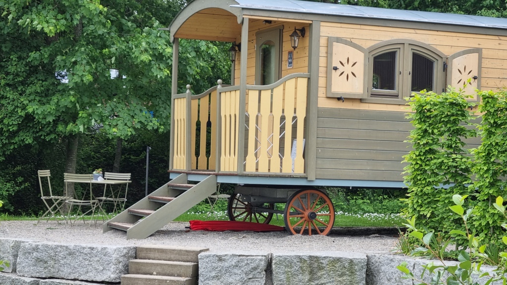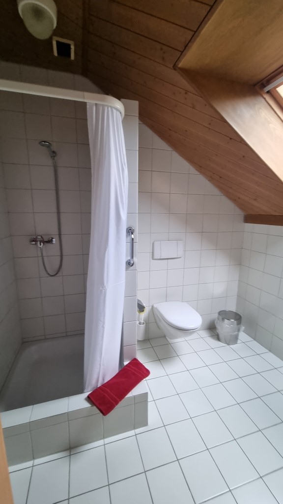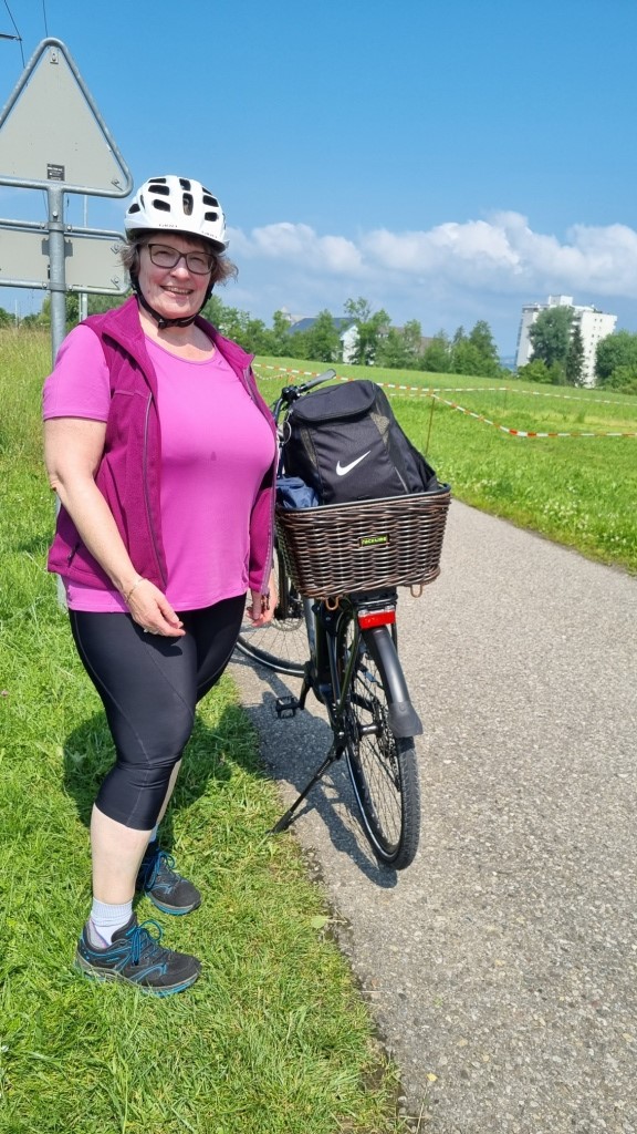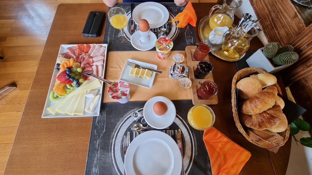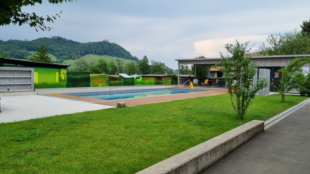 Der Weg führt dann sehr nah am Untersee vorbei durch Berlingen und Steckborn, dann dem Bahngleis entlang etwas weg vom See mit ein paar Steigungen bis Stein am Rhein. Von dort aus fahren wir zum Campingplatz Wagenhausen, wo wir im Landgasthof ein Zimmer reserviert haben. Das Zimmer ist riesig mit Nespresso Kaffeemaschine, separater Sitzecke und mit toller Aussicht auf den Rhein. Das Bad ist auch gross bemessen, etwas 80er Jahre Style aber ist o.k. Die Fahrräder können wir in einem abgeschlossenen Abstellraum einstellen. Auf dem Campingplatz hat es ein neues Schwimmbad, das sehr schön aussieht. Aus Zeitmangel konnten wir es nicht testen. Wir haben Bekannte auf dem Zeltplatz, die hier ein Wochenendhäuschen besitzen und wir haben uns mit ihnen getroffen und den Nachmittag im Garten verbracht. Am Abend haben wir zusammen im Landgasthof gegessen. Die Küche ist gutbürgerlich, wir haben fein gegessen und den Abend auf dem Campingplatz genossen.