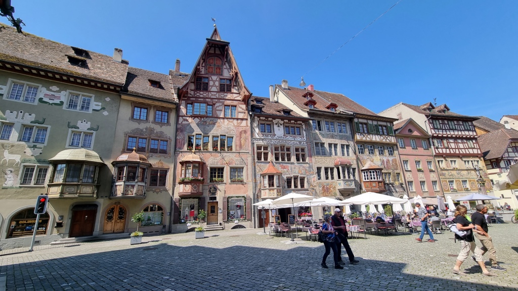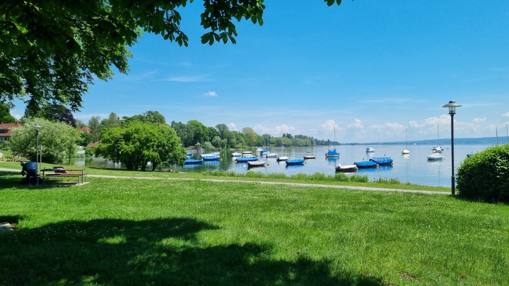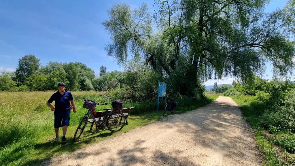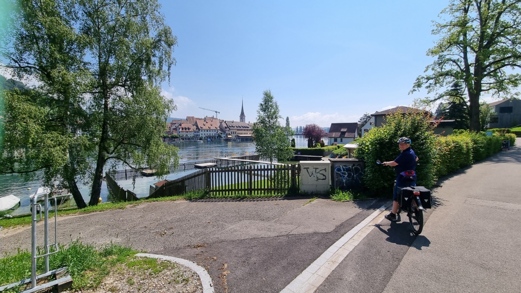 Wir haben sehr gut geschlafen und nach dem feinen Frühstück machen wir uns wieder langsam auf dem Weg nach Kreuzlingen. Wir wollen über Radolfzell nach Konstanz radeln. Ursprünglich planten wir in Radolfzell zu übernachten aber da unsere Impfung erst 13 Tage her ist müssen wir wohl oder übel noch eine Nacht in der Schweiz verbringen. Wir sehen uns ganz kurz Stein am Rhein an, da wir dieses ja schon kennen, es ist aber immer wieder schön anzusehen. Dann geht es weiter über Wangen und Hemmenhofen nach Gaienhofen. Es geht immer ein weinig hinauf und hinunter, also sind wir doch froh, haben wir ein E-Bike. Der Radweg ist meist separat neben der Hauptstrasse, in den Ortschaften allerdings fährt man auf der Hauptstrasse oder einer Nebenstrasse durch Wohngebiete und dann nach Gaienhofen führt der Radweg durch ein sehr schönes Naturschutzgebiet bis er dann kurz vor Radolfzell wieder neben der Hauptstrasse einer schönen Pappelallee entlang führt.