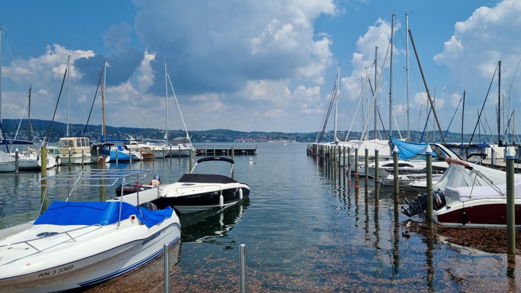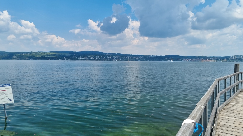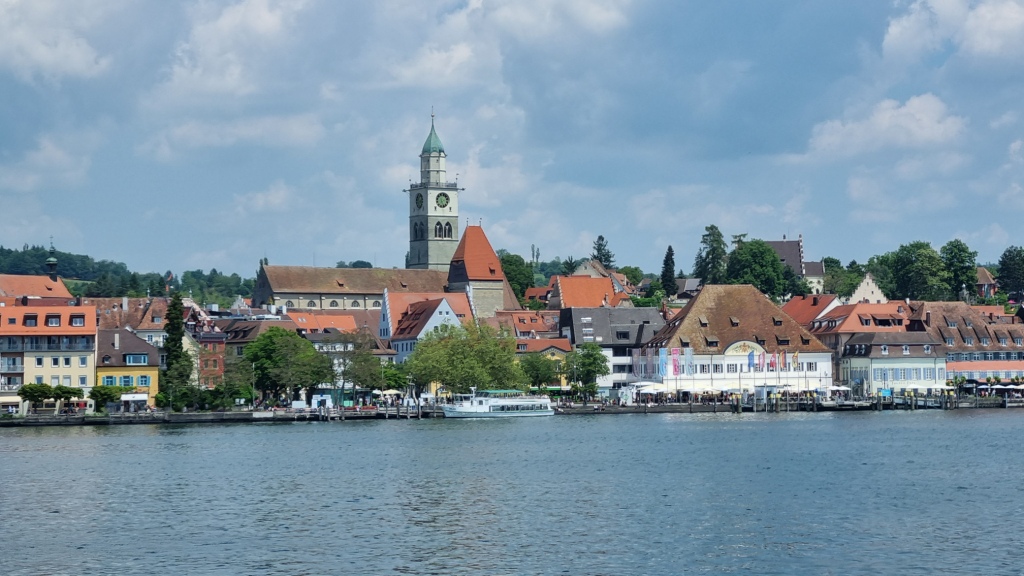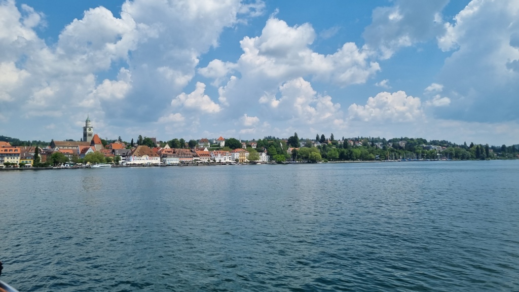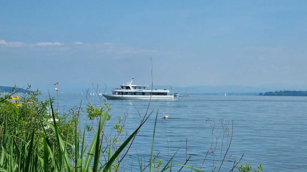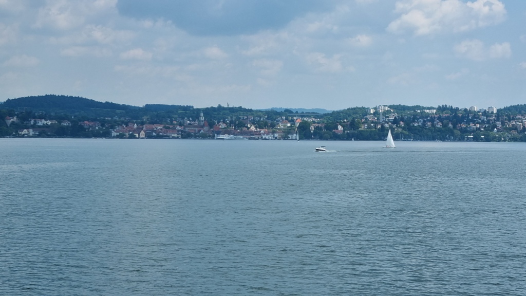 Auch das Frühstück, das zwar in Buffetform angeboten wird, ist nicht sehr vielfältig. Da haben wir schon Bessere auf der Reise erhalten. Wir machen uns dann auf den Weg nach Wallhausen. Wir werden nämlich heute ein Stück mit der Fähre fahren. Bis Wallhausen geht es zuerst am See bei Konstanz entlang, dann stetig auf und ab durch schöne Wohngegenden, am Fähranleger nach Meersburg vorbei und dann an der Insel Mainau vorbei. Wir brauchen nicht sehr lange für die paar Km und so können wir in Wallhausen noch etwas Trinken bevor wir mit der Fähre übersetzen. Die Fahrt auf dem See ist sehr schön und bietet tolle Ausblicke auf Überlingen.