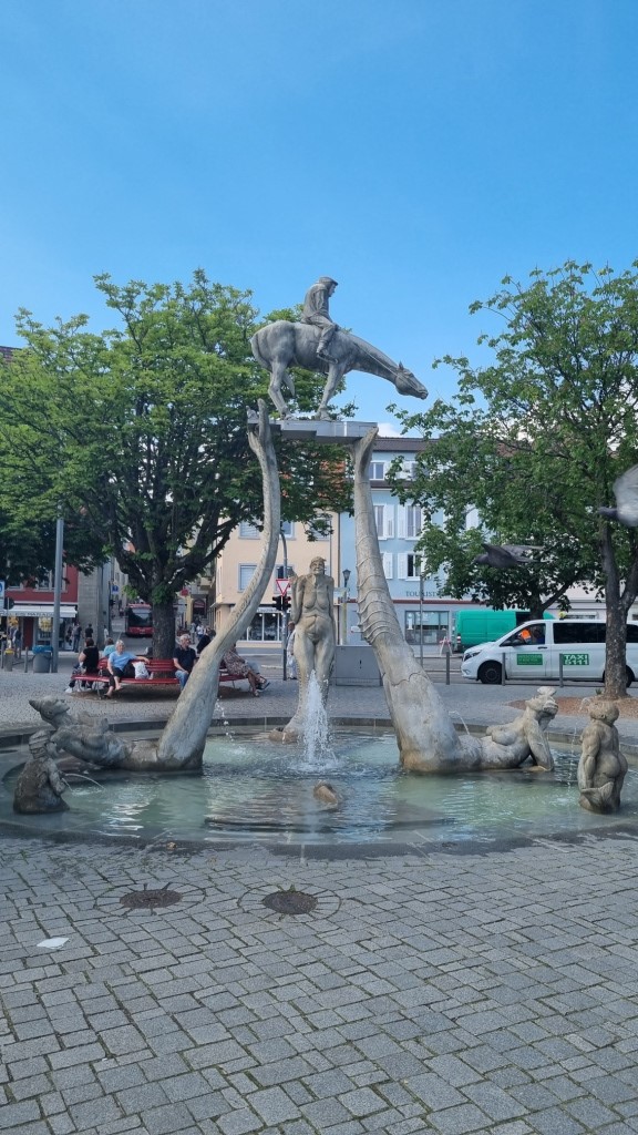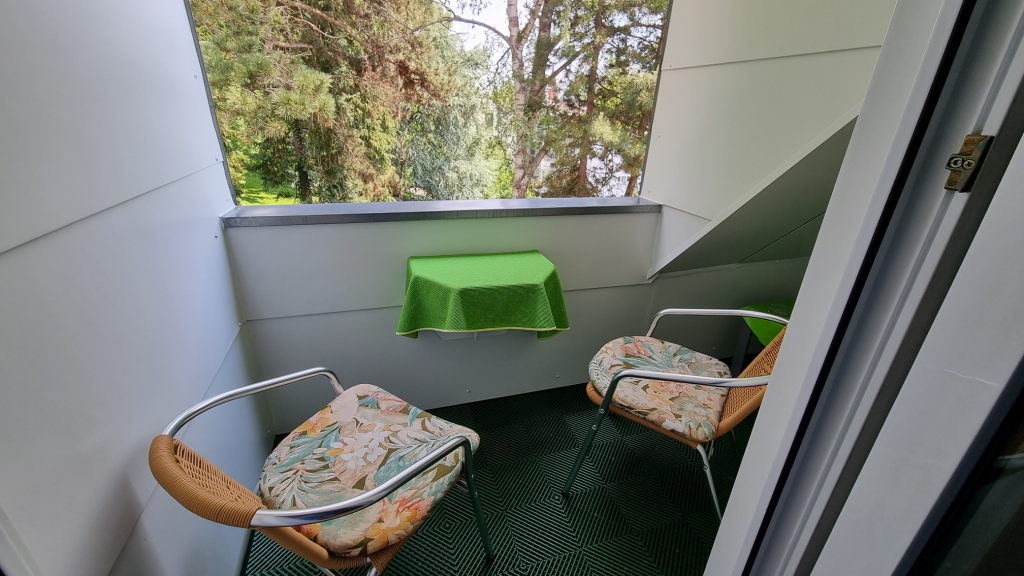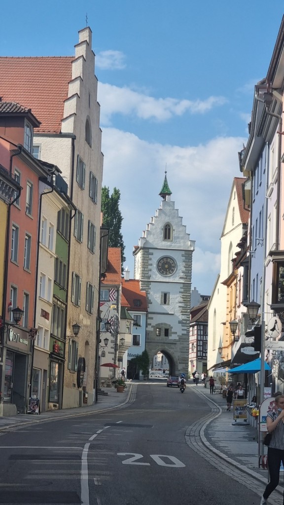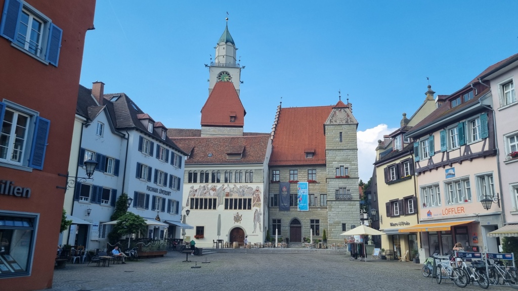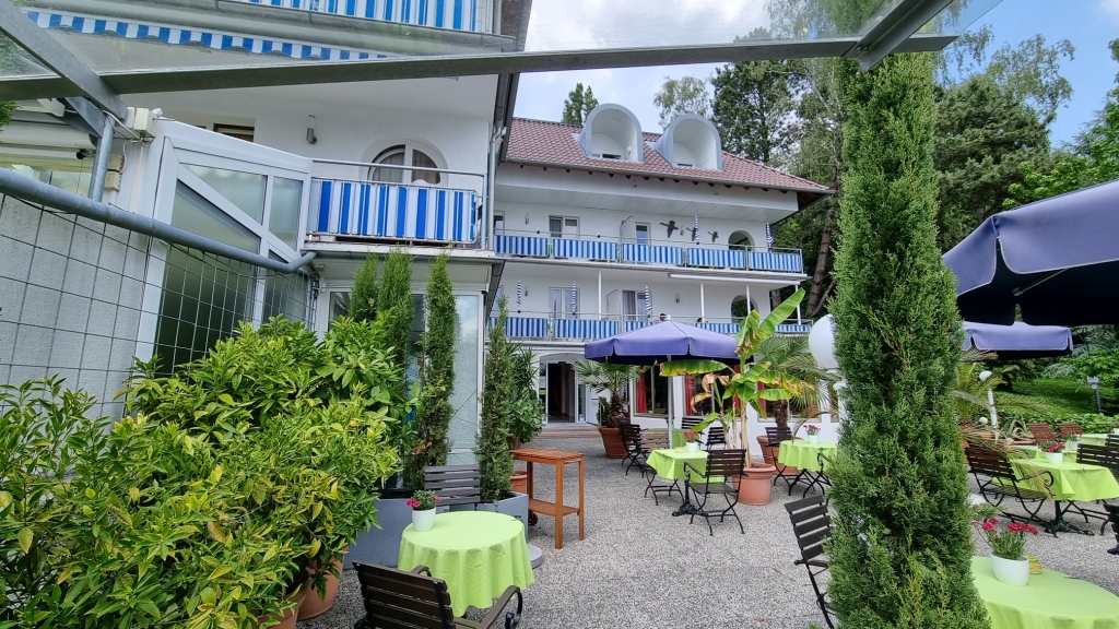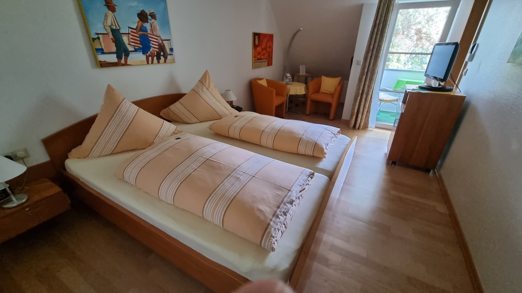 In Überlingen angekommen fahren wir zuerst zu unserer heutigen Unterkunft dem Apart Hotel Stadtgarten . Es liegt am Stadtrand nahe dem See und hat einen sehr schönen Garten. Wir werden nett empfangen und müssen hier beim Einchecken unsere schweizer Impfbestätigung vorweisen, die auch akzeptiert wird. Unser Zimmer, mit kleinem Balkon zum Stadtgarten ist ganz nett, das Bad winzig klein, aber für eine Nacht passt es schon. Die Betten sind allerding sehr hart und quitschen bei jeder Bewegung. Die Fahrräder können wir in der Garage abstellen und es gibt sogar die Möglichkeit die Batterien in der Garage in einem Kästchen mit Schlüssel aufzuladen, damit man sie nicht ins Zimmer nehmen muss wegen Brandgefahr. Die Garage ist noch speziell mit einem Autolift, wo immer 2 Autos übereinander parkieren können, gut sind wir nicht mit dem Auto da.