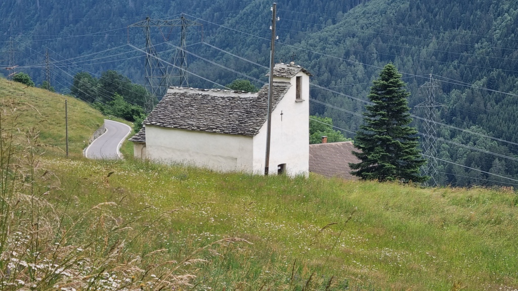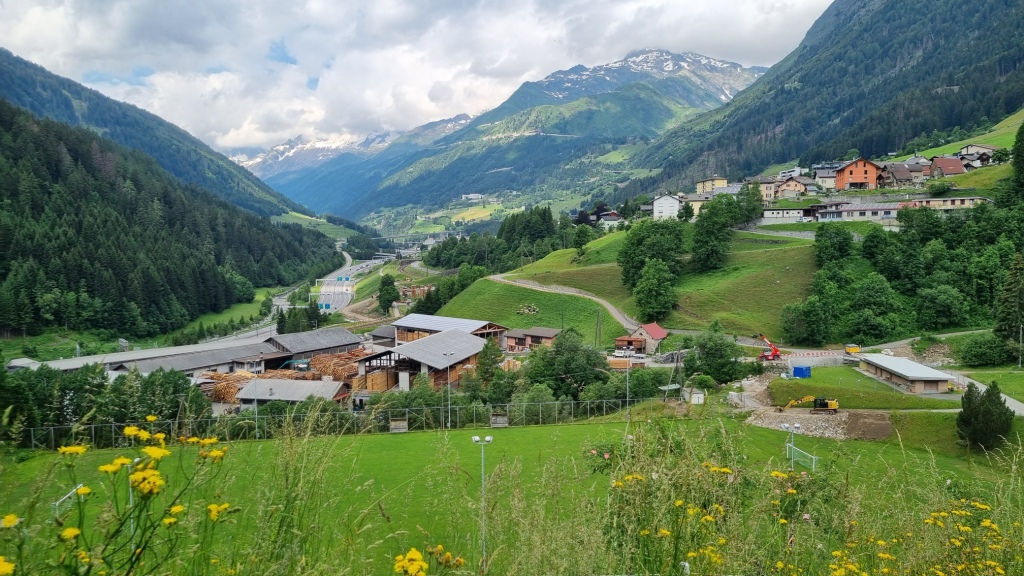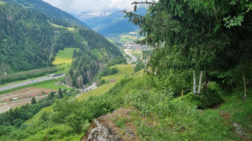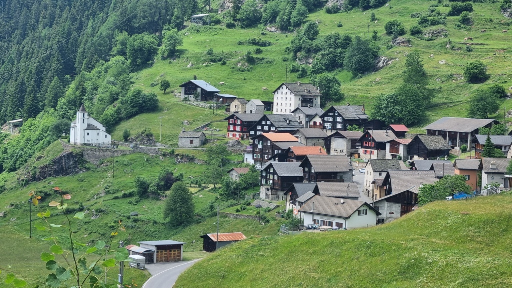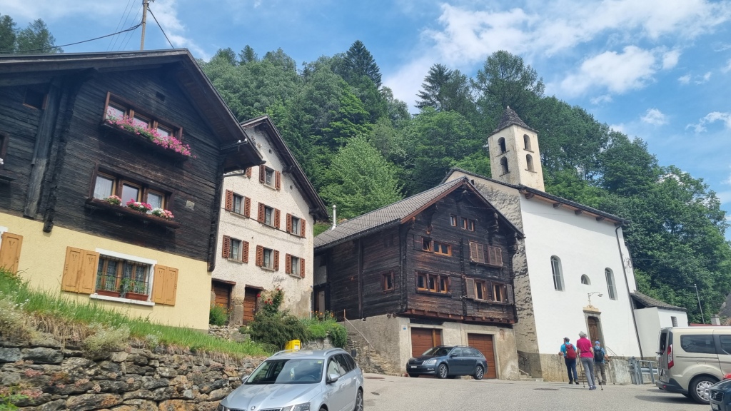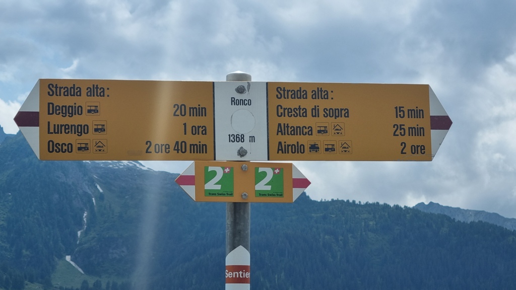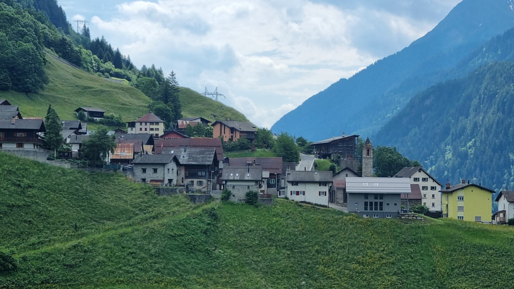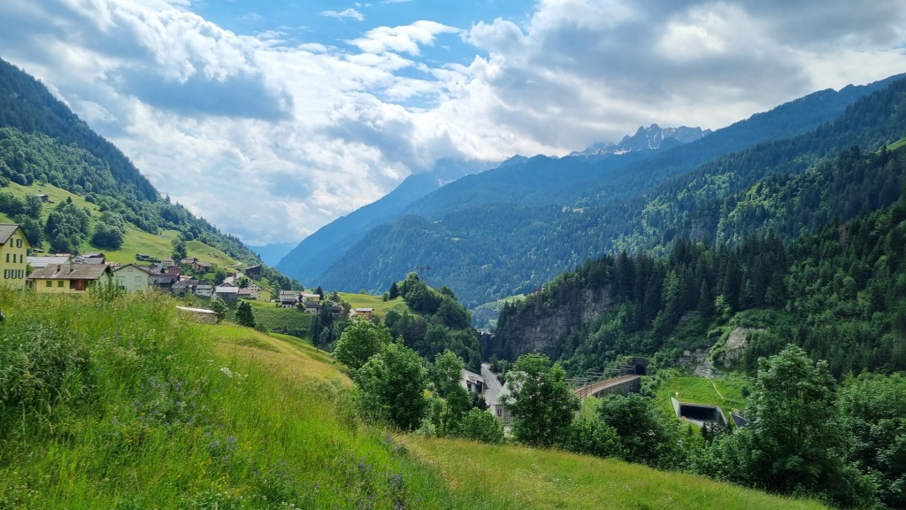 Am ersten Tag fahren wir von Locarno aus mit dem Auto nach Airolo. Das Auto können wir auf dem Hotelparkplatz kostenfrei stehen lassen. Sogleich machen wir uns auf den Weg unserer 1. Etappe. Der Wanderweg, der zum Trans Swiss Trail Nr. 2 gehört, führt uns von Airolo, das 1160 m.ü.M liegt, zuerst zum Weiler Valle und dann über einen Bach und durch Wiesen hinauf nach Madrano. Von hier aus können wir zurück nach Airolo blicken, weiter geht es aufwärts durch hohes Gras und dann einer schmalen Strasse entlang nach Brugnasco, das schon auf 1384 m.ü.M. liegt.