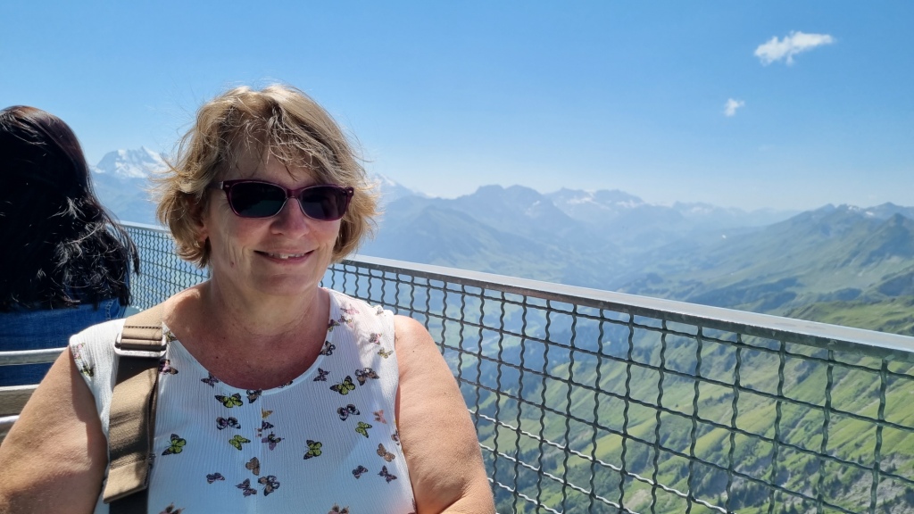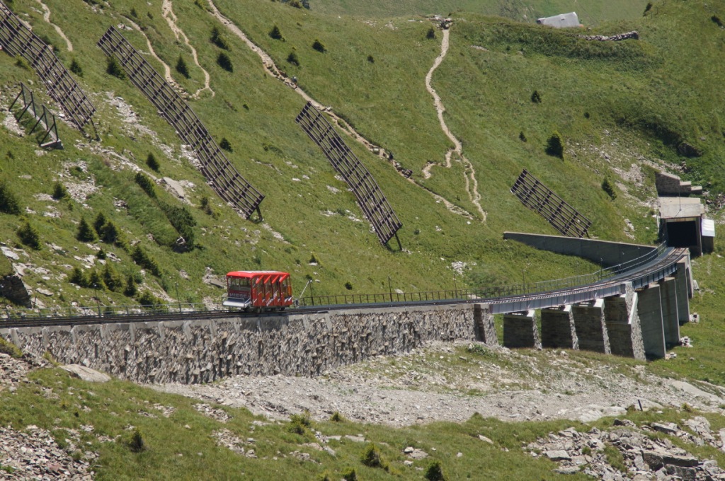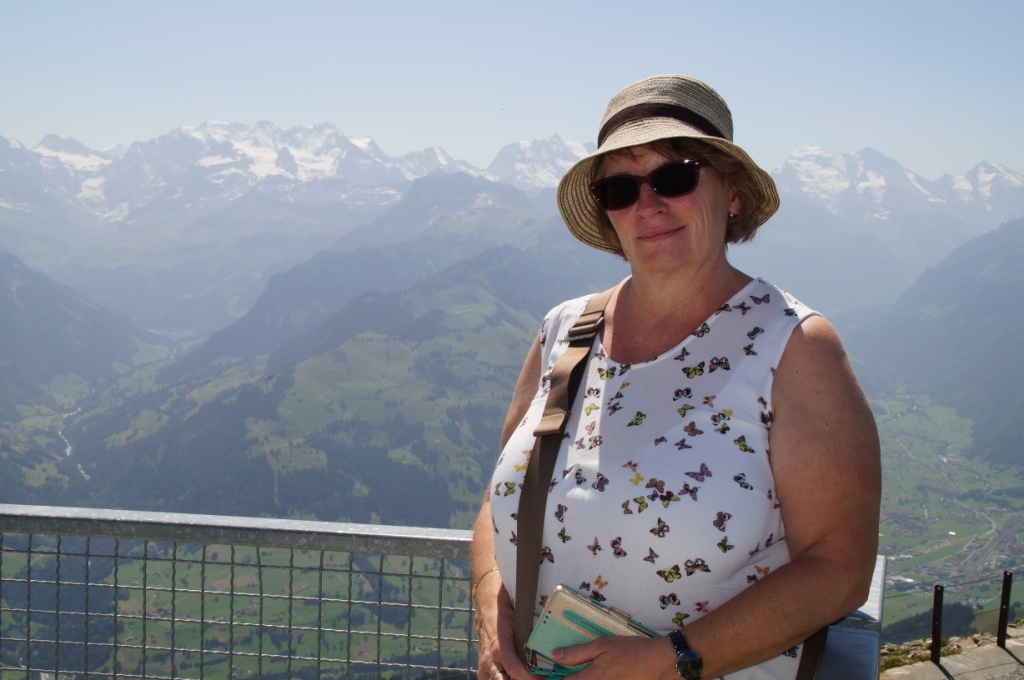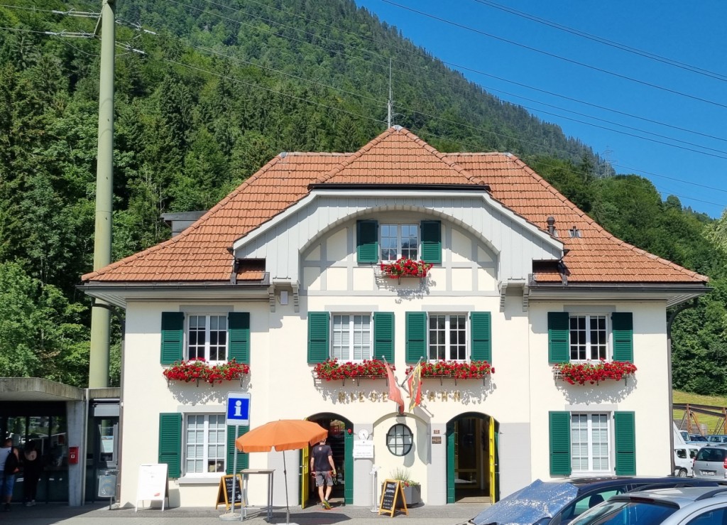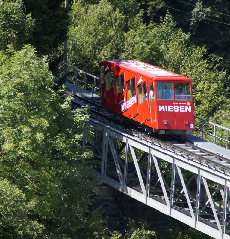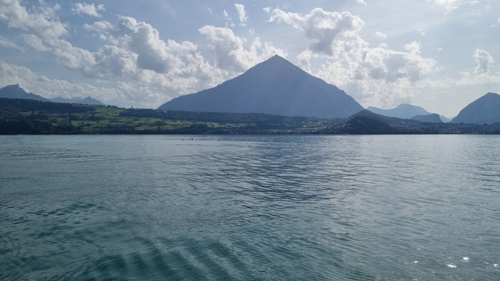 Am nächsten Morgen ist wieder schönes Wetter, ein bisschen bewölkt. Nach dem Frühstück machen wir uns auf den Weg zur Schifflände in Hilterfingen. Mit dem Schiff fahren wir nach Spiez. Von dort laufen wir hinauf zum Bahnhof und nehmen den Zug nach Mülenen. Von dort aus fährt die Niesen Standseilbahn auf diese Pyramide hinauf. Wir haben uns vorab erkundigt, heute fährt die Bahn wieder, es ist wieder alles repariert.