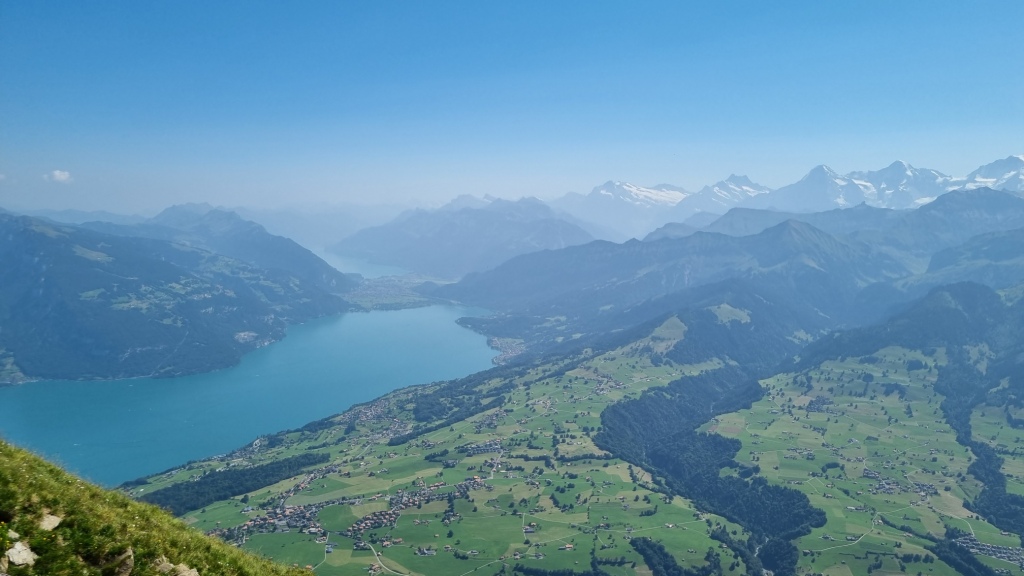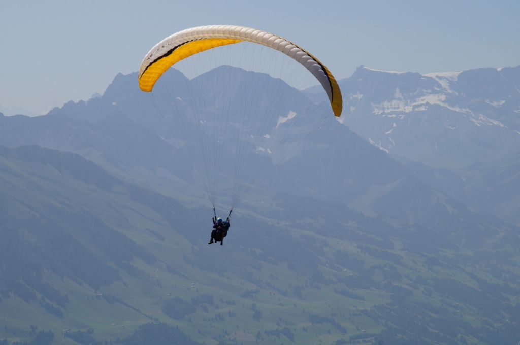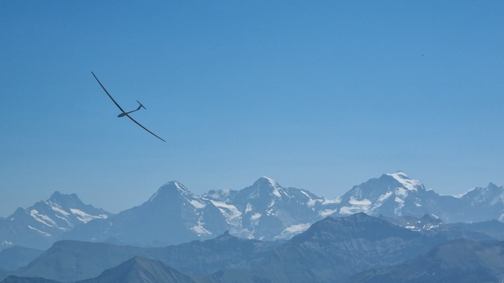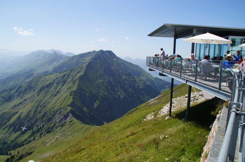 Oben angekommen bietet sich eine fantastische Rundumsicht. Wir laufen bis zum höchsten Aussichtspunkt hinauf und geniessen die Sicht sowie die Segelflieger und Paraglider. Auf der spektakulären Restaurantterrasse nehmen wir noch einen kleinen Lunch in luftiger Höhe. Zufällig treffen wir noch unseren Garagisten am Berg. Die Welt ist doch klein. Nach der Stärkung fahren wir mit der Standseilbahn wieder hinunter.