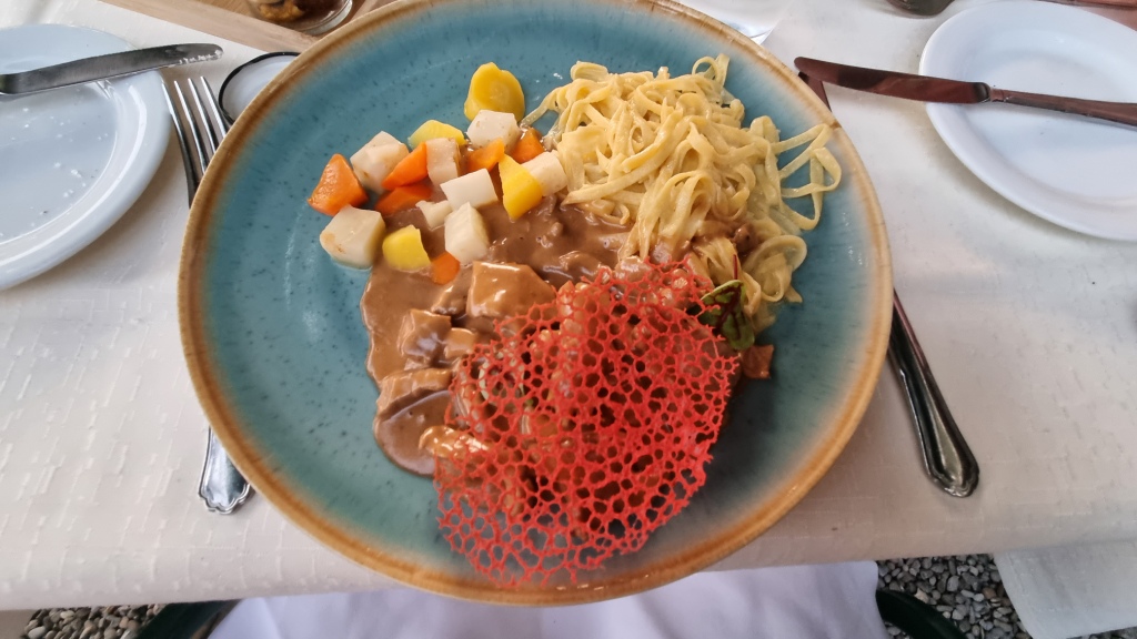 Da wir für heute genug gelaufen sind, entscheiden wir uns im Hotel auf der schönen Gartenterrasse zu essen. Das Ambiente ist einzigartig, vom Essen hatten wir etwas mehr erwartet. Es war nicht schlecht aber auch nichts Besonderes.
