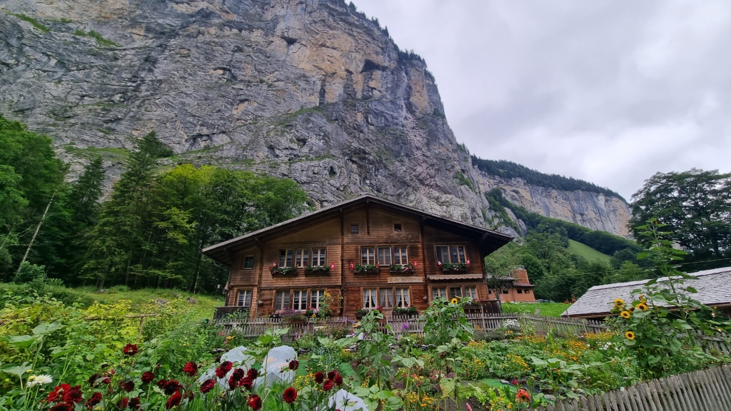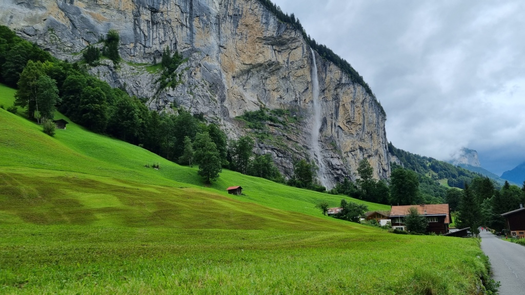 Nach dem Frühstück packen wir unsere Sachen zusammen und fahren Richtung Interlaken und von dort ins Lauterbrunnental. Pascal möchte diese steilen Felswände ansehen wo die Basejumper starten. Also fahren wir nach Lauterbrunnen. Leider ist heute das Wetter nicht mehr so schön. Der Himmel ist wolkenverhangen, es sieht nach Regen aus und die Sicht ist auch nicht gut.