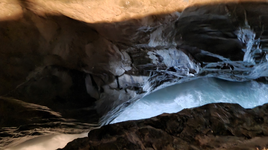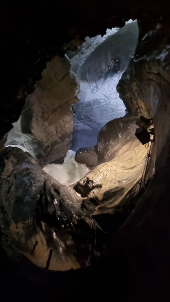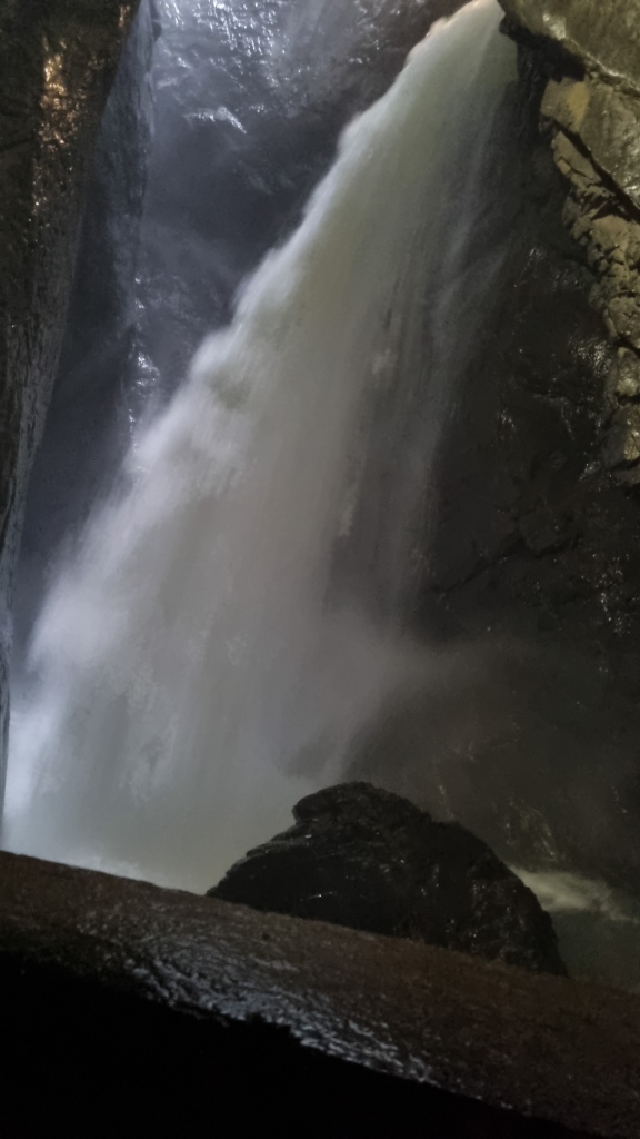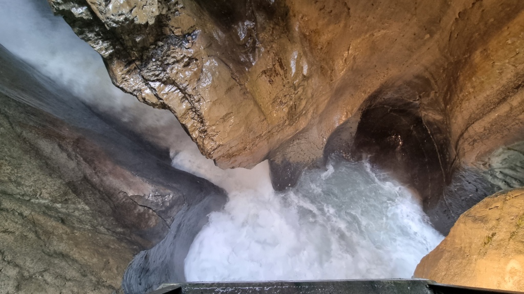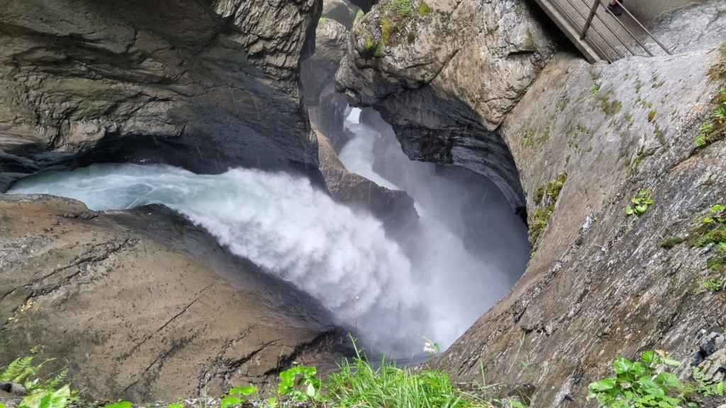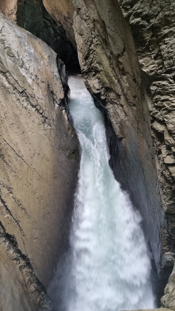 Wir beschliessen die Trümmelbachfälle zu besichtigen und laufen der weissen Lütschine entlang bis zum Eingang der Trümmelbachfälle. Der Eintritt kostet Fr. 12.–. Man fährt dann mit einem Lift ein Stück weit hinauf und kann dann im Berg und auf Brücken alle 10 Wasserfälle begutachten. Ein gewaltiges Schauspiel wie sich die Wassermassen hinunterstürzen. Leider beginnt es zu regnen, jedoch spielt dies keine Rolle, jetzt wird man halt von oben und von unten nass. Nach diesem eindrücklichen Erlebnis fahren wir mit dem Bus zurück nach Lauterbrunnen und gehen dort noch einen Snack essen. Ich bekomme allerdings etwas anderes als ich bestellt habe, naja vielleicht ist man hier eher auf englischsprechende Gäste eingestellt und versteht nicht so gut Schweizerdeutsch. Geschmeckt hat es trotzdem.
