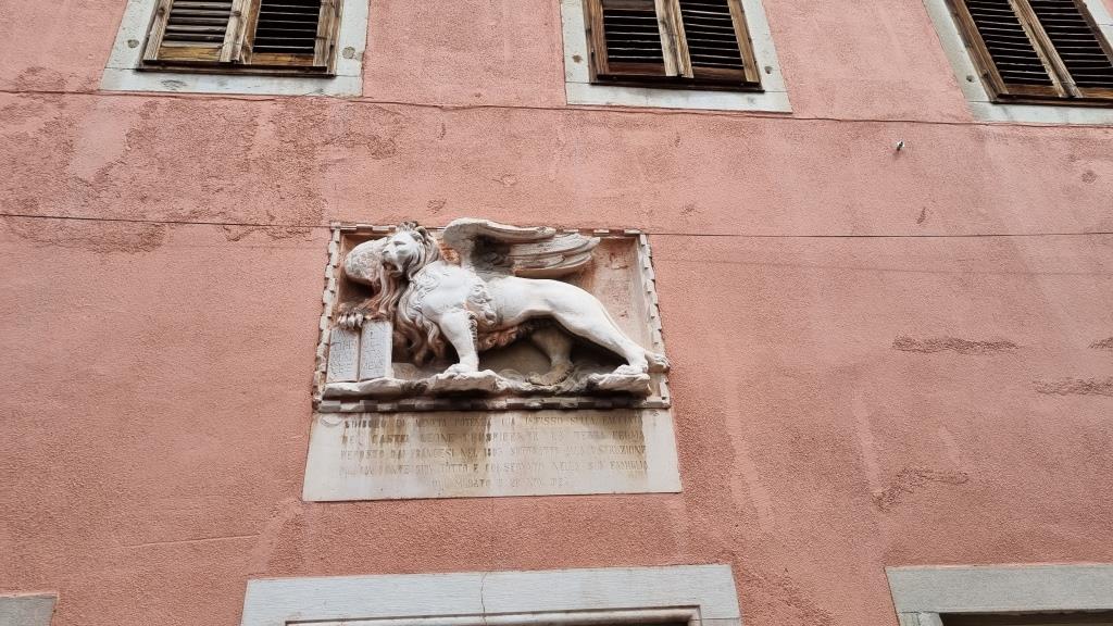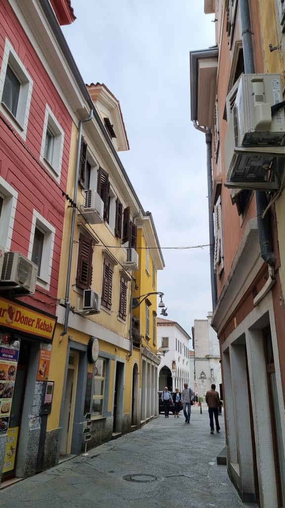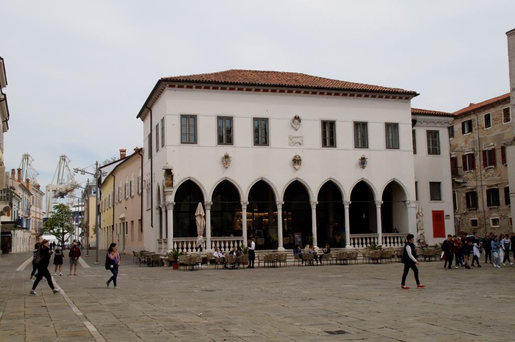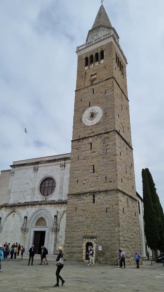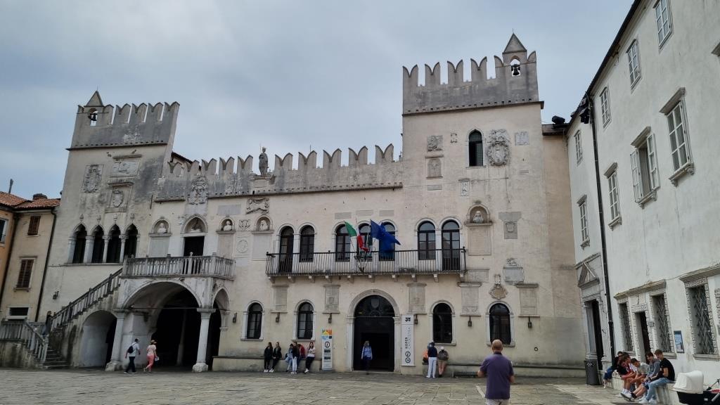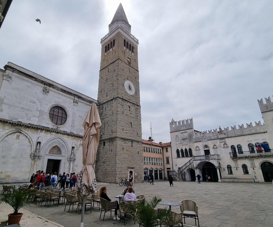 Der Hauptplatz Titov trg mit der Kirche mit dem venezianischen Turm, der Loggia, Prätorenpalast (Rathaus) und den schönen Gebäuden ringsum liegt etwas erhöht und ist schnell erreicht. Hier wird deutlich, dass Koper einst unter venezianischer Herrschaft stand. Wir spazieren durch die Gassen und sehen auf den Kreuzfahrthafen hinunter. Ein Kreuzfahrtschiff macht hier Halt, deshalb sind auch einige Gruppen unterwegs, die durch die Altstadt laufen.