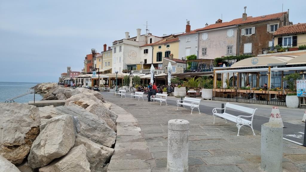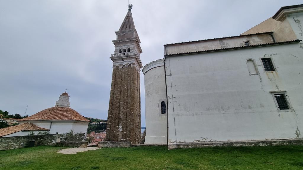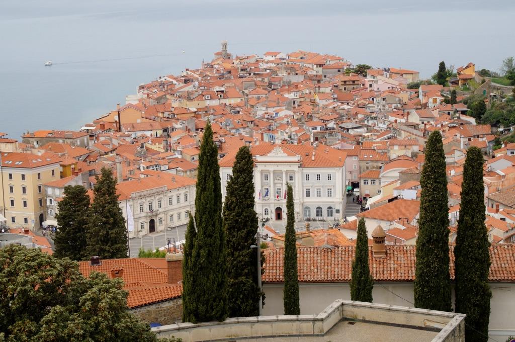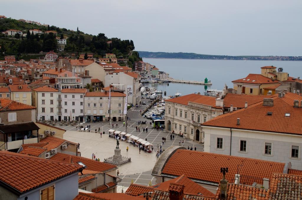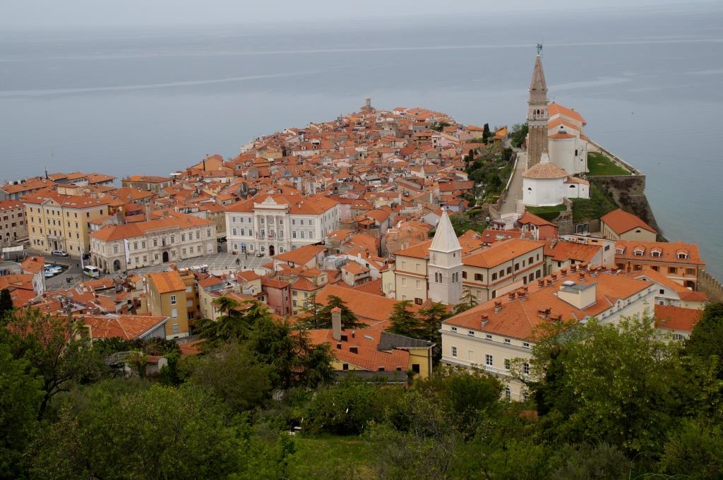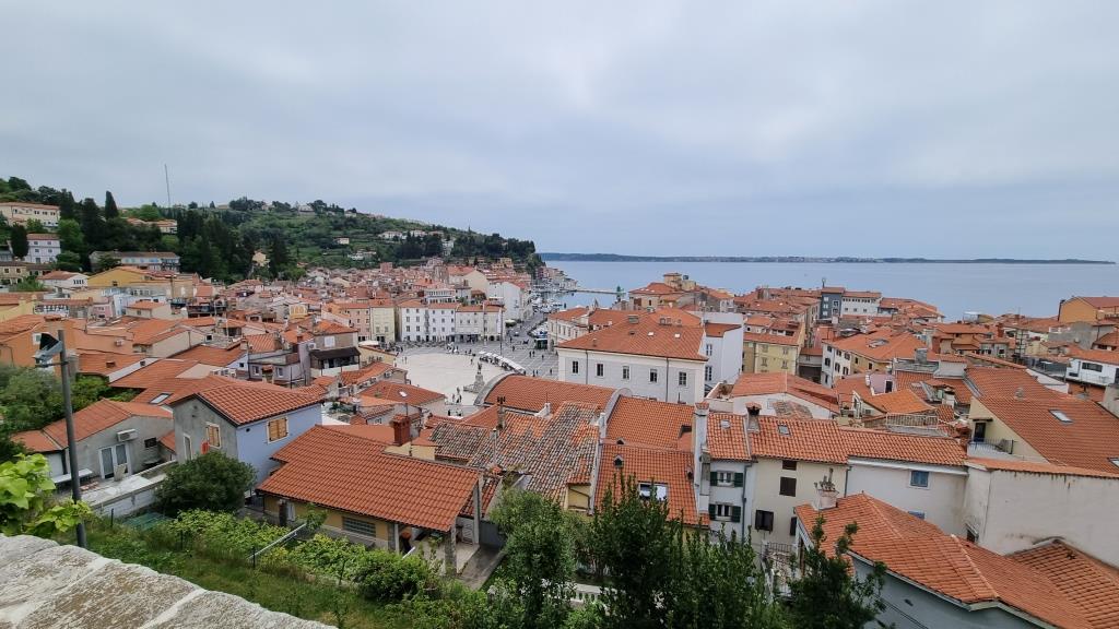 Von Koper aus erreichen wir Piran über die Autobahn in ca. 20 Minuten. Wir parkieren unser Auto in einer Tiefgarage oben in der Nähe der Stadtmauer. Als erstes besichtigen wir die Stadttore und die Stadtmauer von wo aus man einen herrlichen Blick auf die Halbinsel und das Städtchen Piran hat.