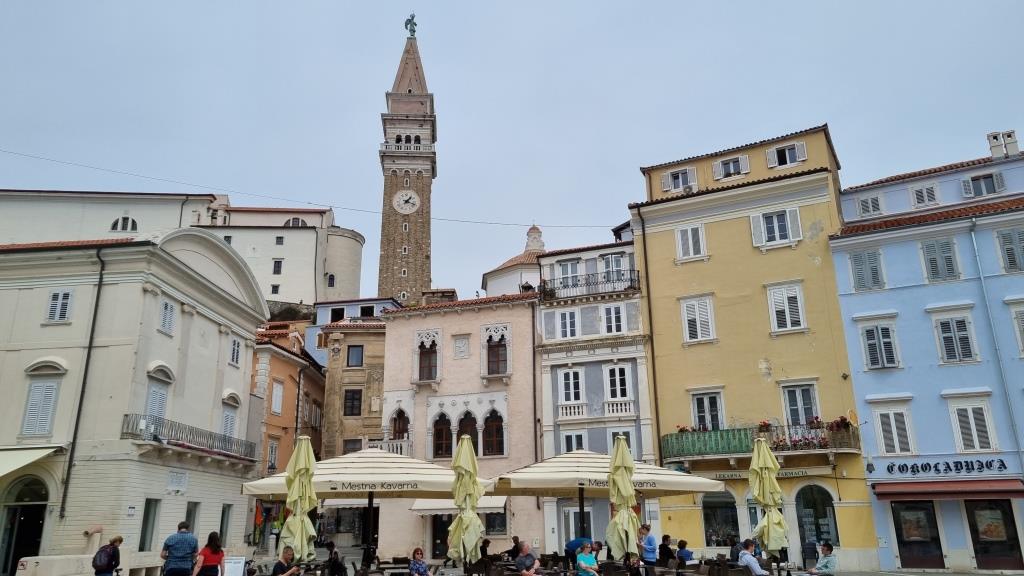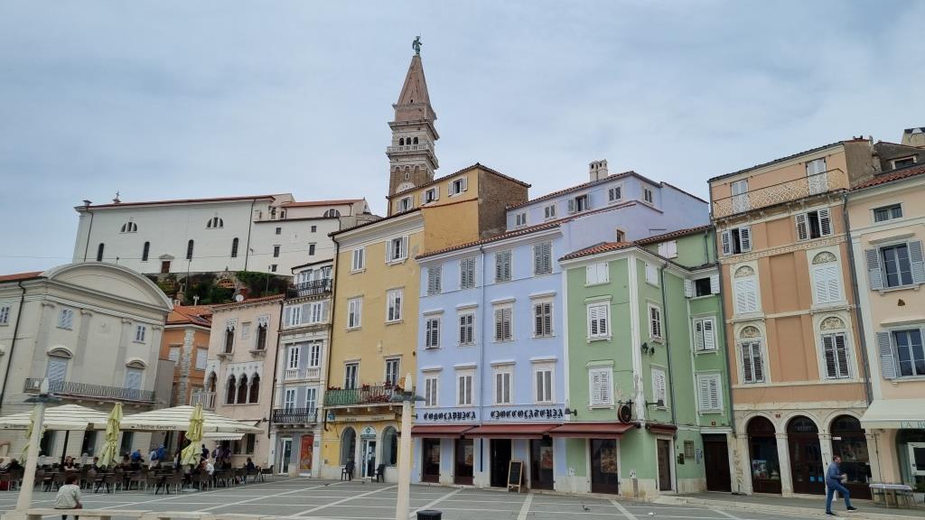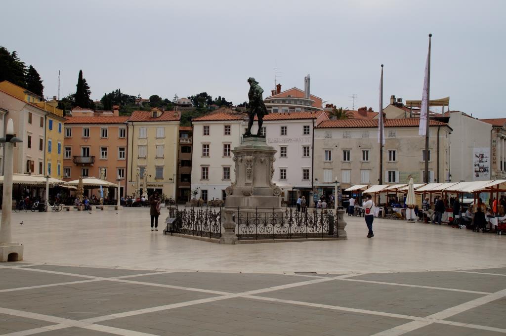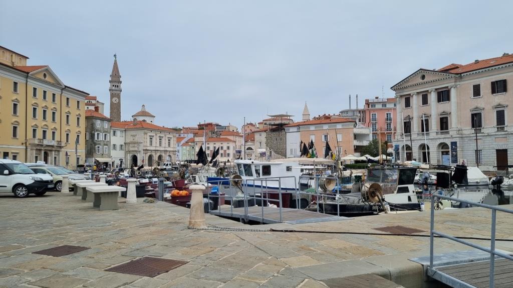 Nachdem wir einen Blick in die Kirche geworfen haben laufen wir ganz hinunter in die Stadt zum grossen Tartini Platz. Rund um den Platz befinden sich viele Restaurants und Cafés sowie der Gemeindepalast. Gleich im Anschluss befindet sich der Hafen von Piran.