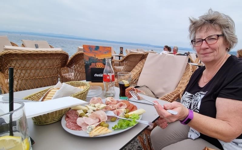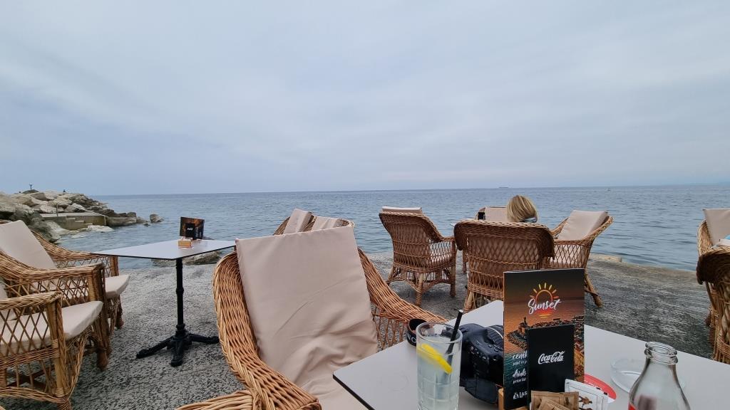 Vom Hafen aus laufen wir der Promenade entlang und entdecken ein Restaurant, wo die Tische ganz nah am Meer stehen. Hier genehmigen wir uns etwas zu Trinken und einen kleinen Lunch. Herrlich, hier so am Meer zu sein und bis jetzt macht das Wetter mit.