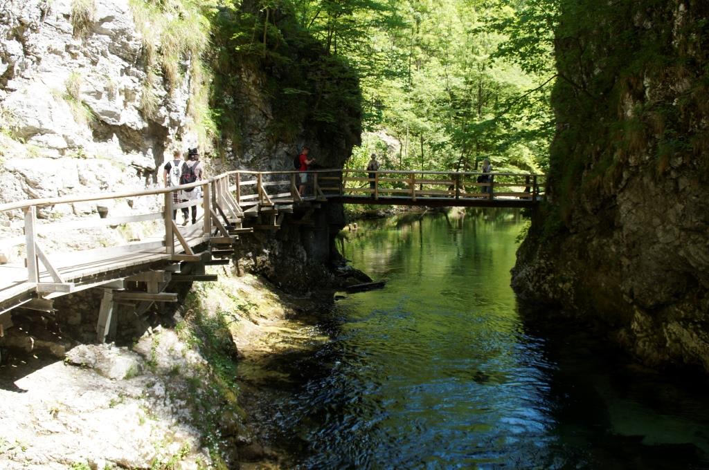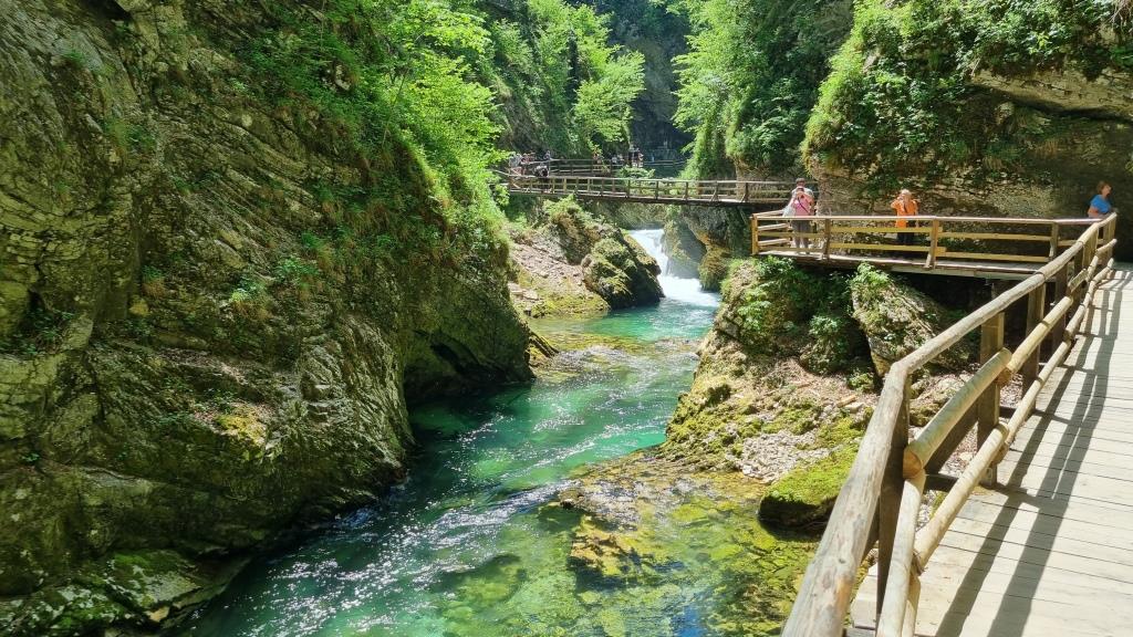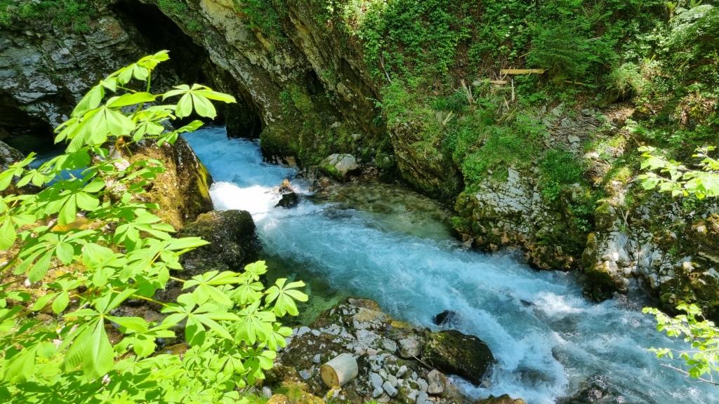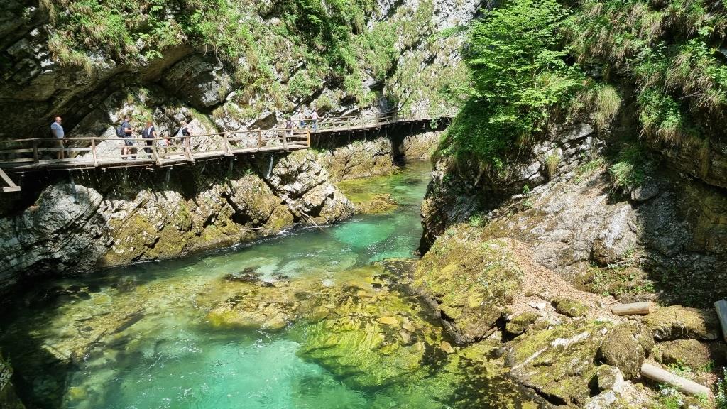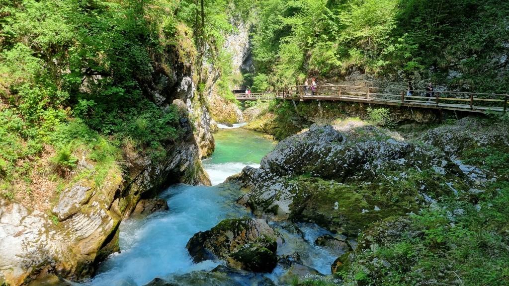 Bei unserer Rückreise aus Kroatien verbringen wir noch 2 Tage in Slowenien. Einen Tag sind wir in Ljubljana und einen Tag in Bled. Aber bevor wir Bled besuchen, sehen wir uns noch den Vintgar Klamm in der Nähe von Bled an. Wir parkieren unser Auto am Parkplatz am Ende der Schlucht und laufen zuerst durch den Wald zum Eingang. So sind wir nach der Schluchtenwanderung direkt beim Auto. Die Schlucht ist in etwa 1,6 km lang und es geht nur in eine Richtung. Also laufen wir zuerst einen einfachen Wanderweg zum Eingang der Schlucht. Hier zahlt man 10 E Eintritt. Dann folgt man dem spektakulären Weg über Brücken und in den Fels gehauenen Stegen dem sprudelnden Wasser entlang bis zum Ausgang der Schlucht. Das Wasser der Radovna schimmert smaragdgrün, herrlich. Wir können uns gar nicht sattsehen.