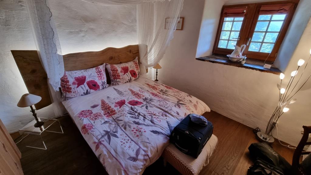 Das Zimmer befindet sich in einem Haus aus dem 18. Jahrhundert und ist mitten im Dorf. Es ist alles neu renoviert und sehr schön eingerichtet. Anhand der dicken Mauern und des kleinen Fensters merkt man, dass es aus einer anderen Zeit stammt. Frühstück ist hier nicht dabei, das können wir aber bei meinem Cousin einnehmen, der gleich um die Ecke wohnt mit seiner Freundin.