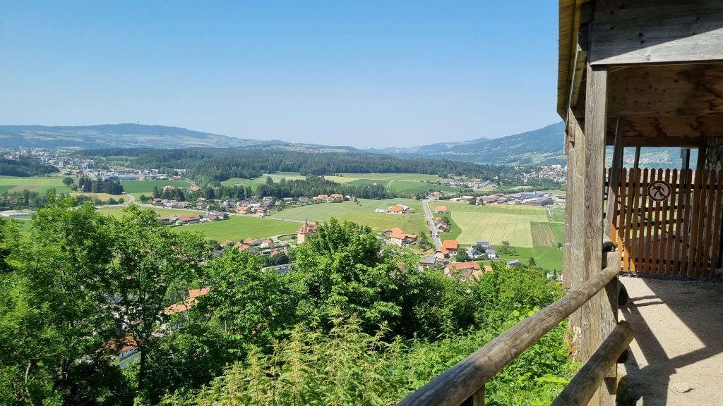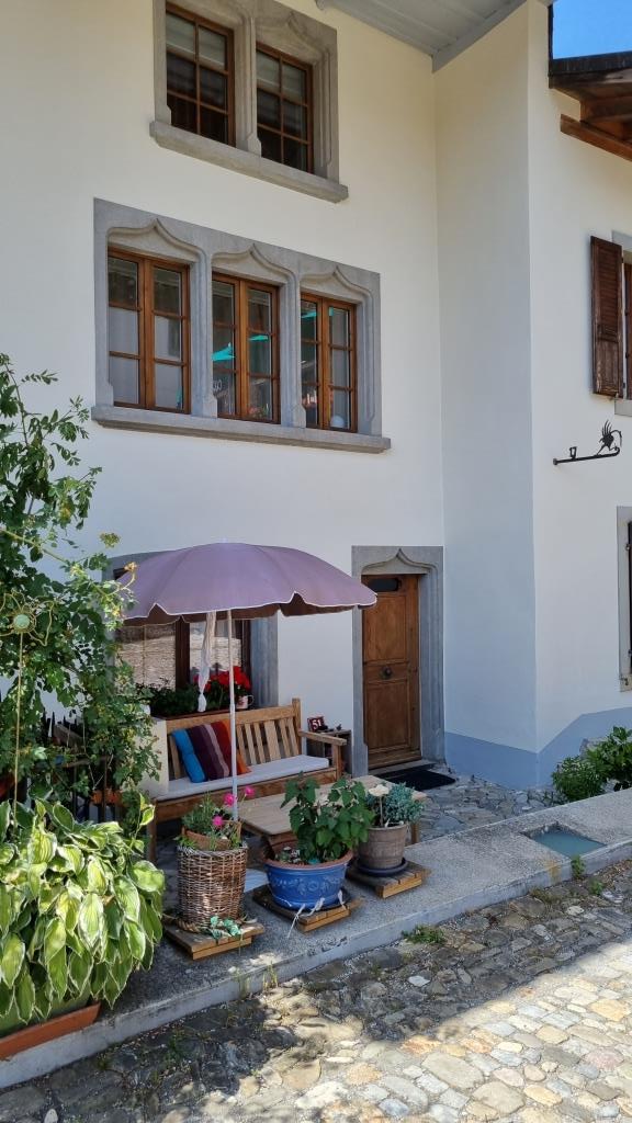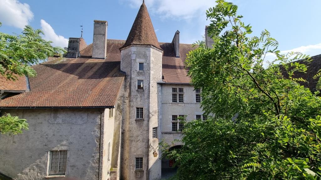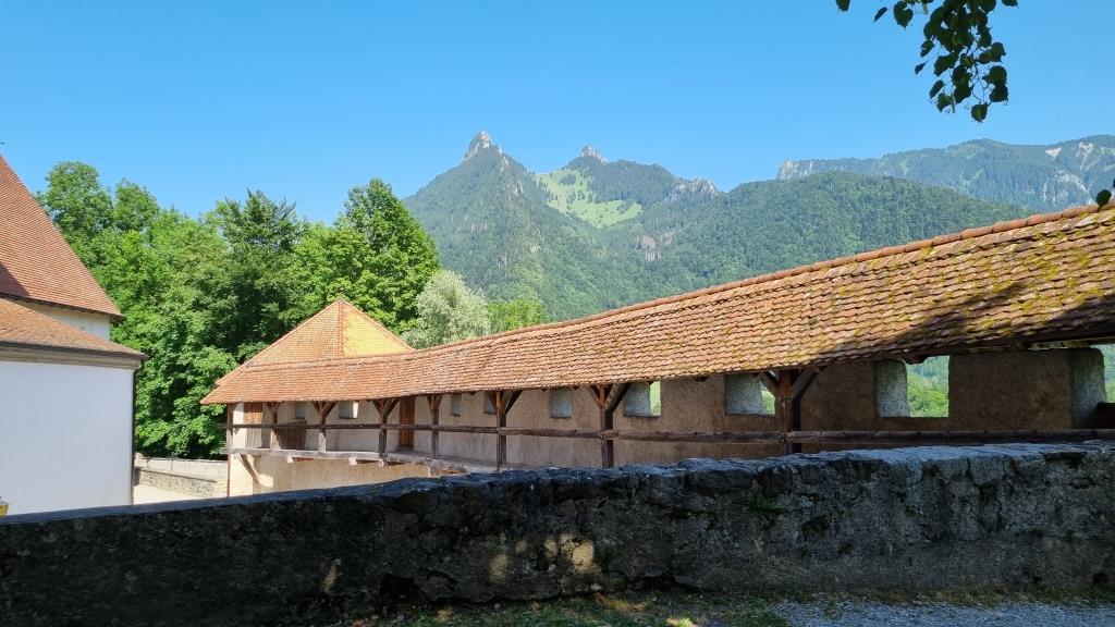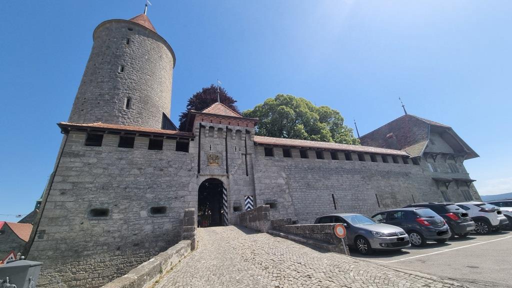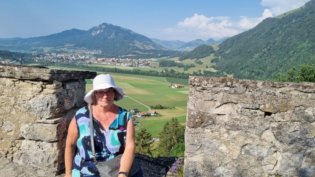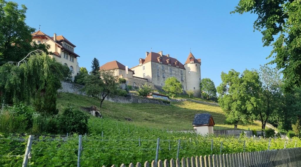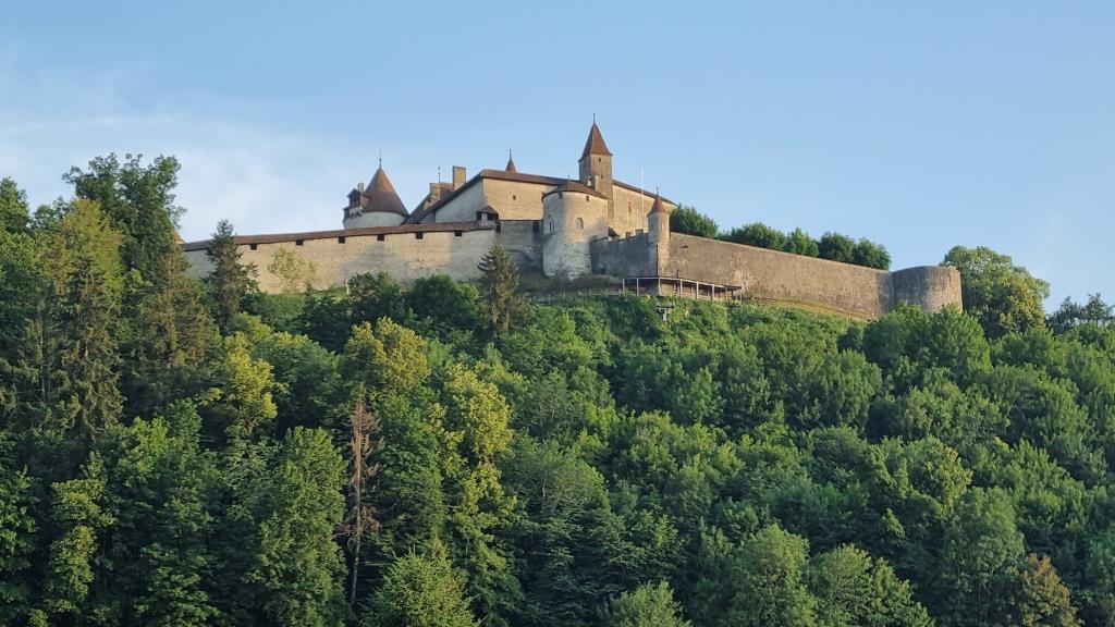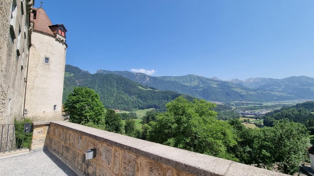 Es ist gerade Mittagszeit als wir ankommen und wir sind bei meinem Cousin zum grillieren auf der Terrasse mit herrlicher Aussicht aufs Tal hinunter eingeladen. Er wohnt gleich unter dem Schloss innerhalb der Burgmauern. Wir sind hier in der welschen Schweiz und müssen unsere französisch Kenntnisse hervorgraben. Nach anfänglichen Startschwierigkeiten klappt es doch ganz gut mit der Verständigung.