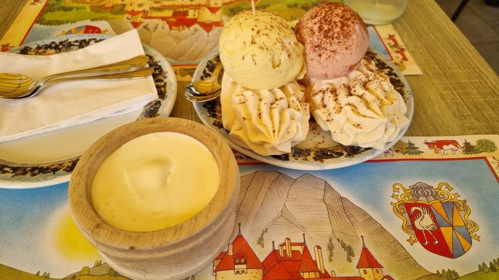 Nach der Schlossbesichtigung müssen wir im Chalet Gruyères die typischen Meringues mit Crème Double probieren. Sie schmecken sündhaft gut. Das Chalet ist übrigens ein paar Wochen nach unserem Besuch abgebrannt. Aber die gute Nachricht – es wird wieder aufgebaut.