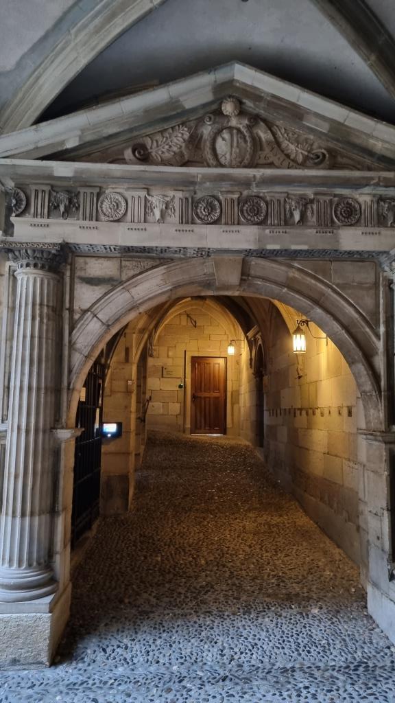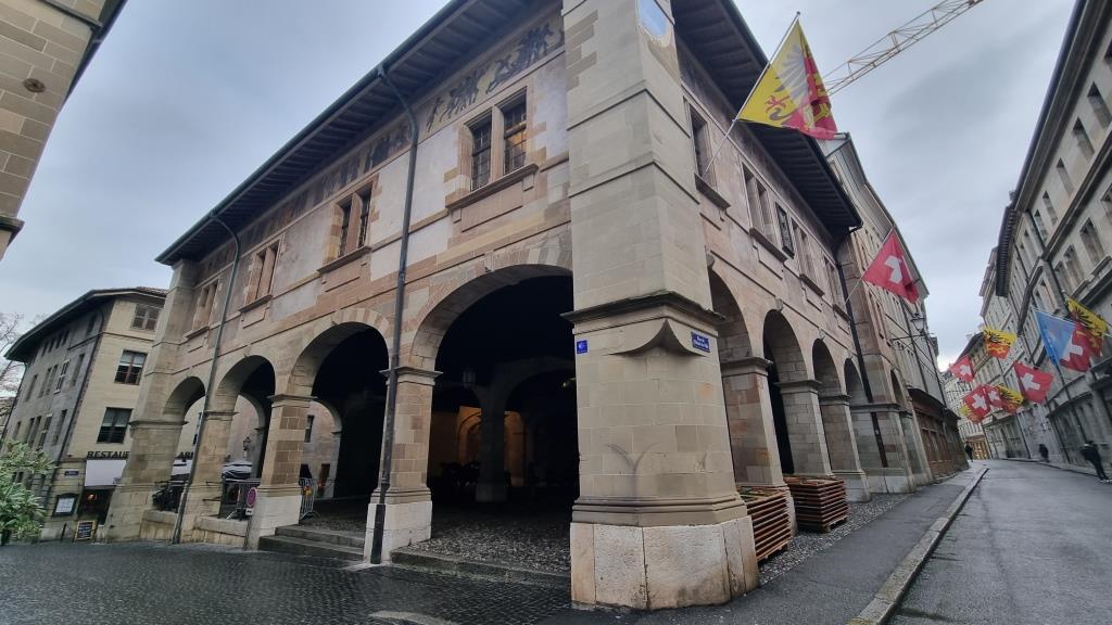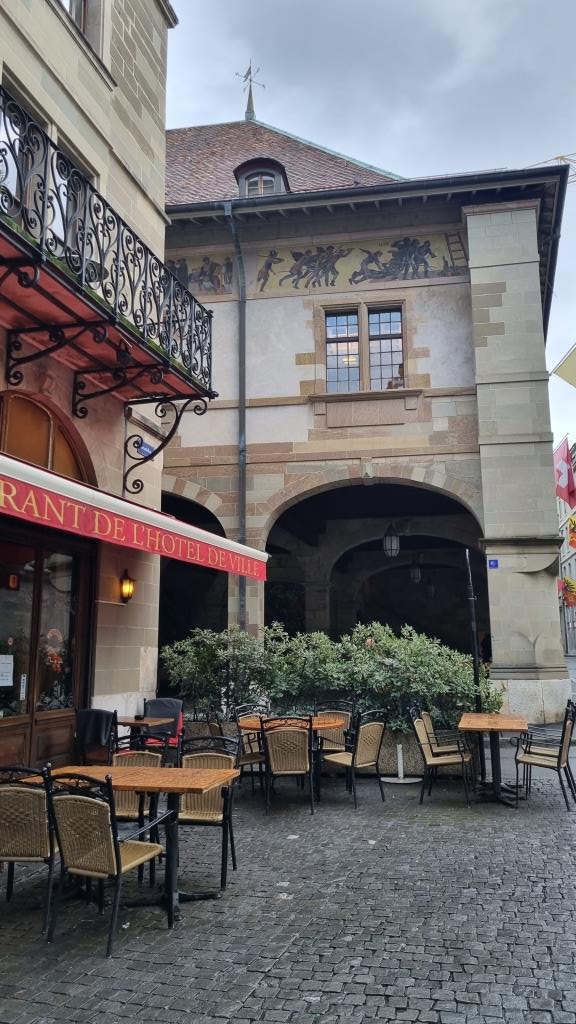 Nachdem wir das Museum besichtigt und l’ancien Arsenal gesehen haben laufen wir weiter zur Promenade de la Treille. Dort soll die längste Parkbank der Welt stehen. Die Aussicht ist sehr schön, leider sitzt niemand auf der Bank, denn sie ist nass vom Regen. Wir geniessen die Aussicht auf die umliegenden Berge und laufen zurück in die Altstadt.