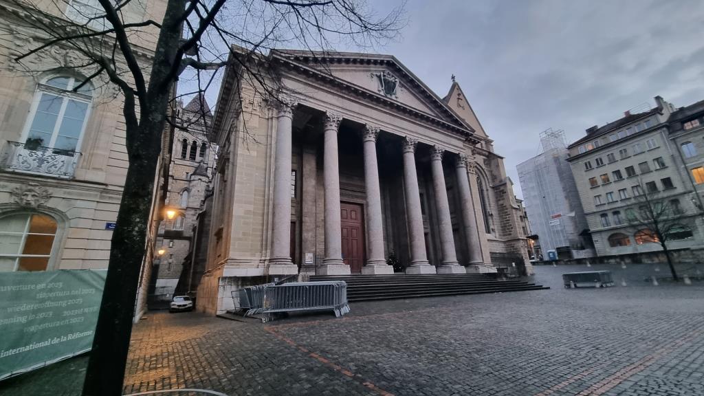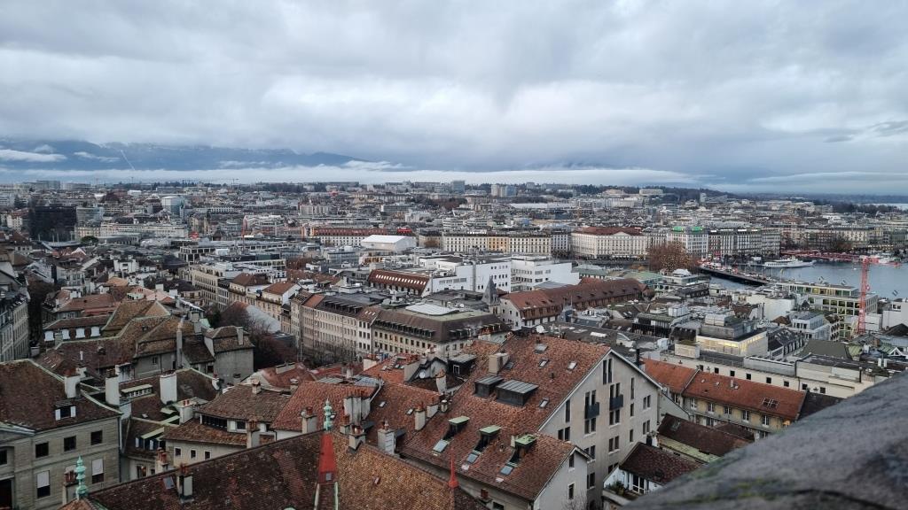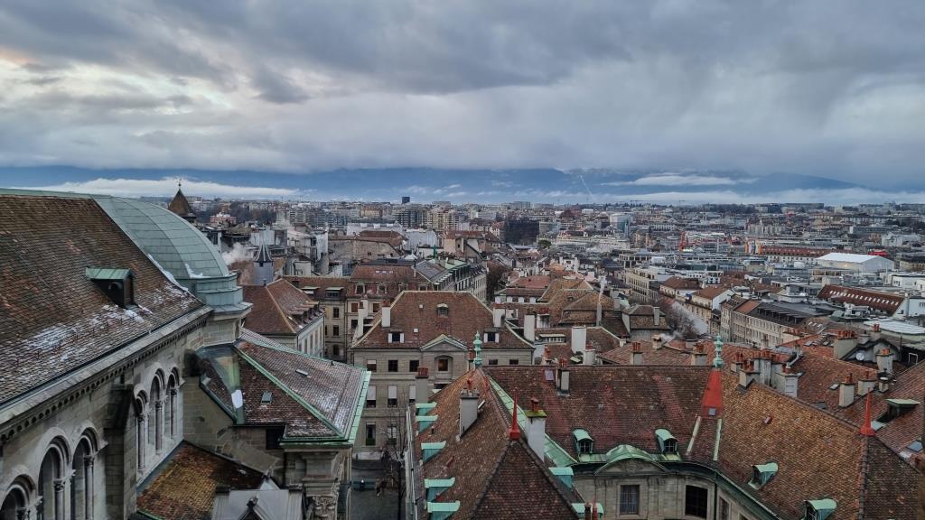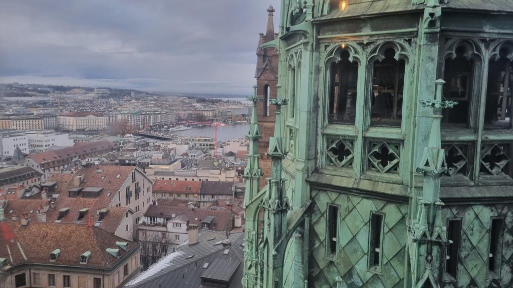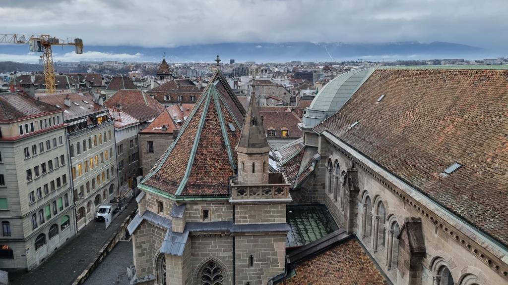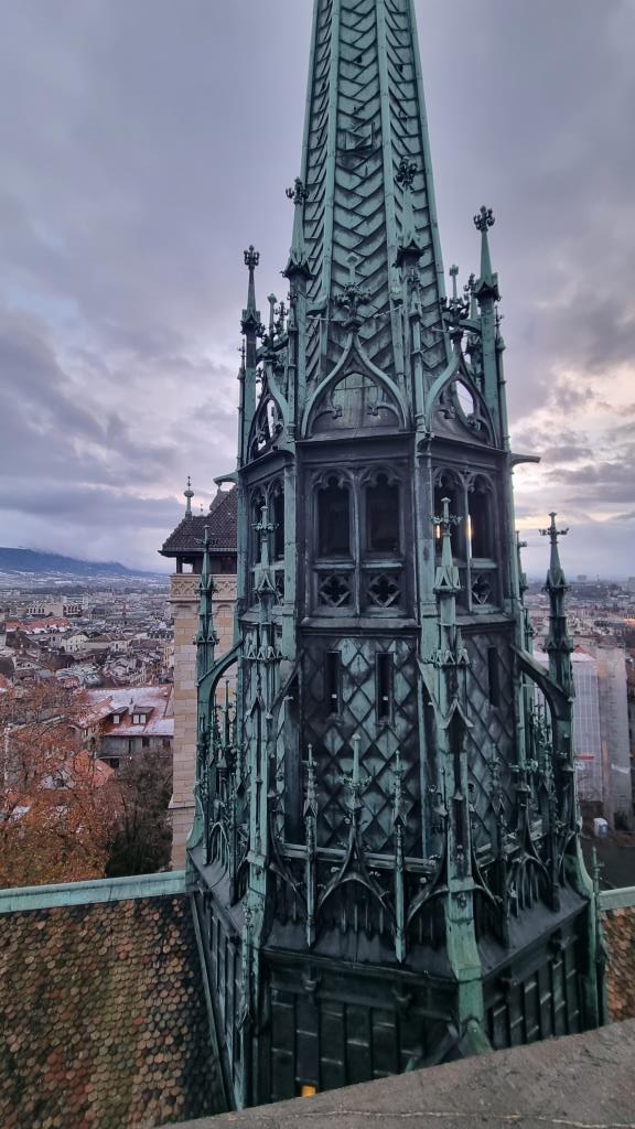 Wir kommen bei der protestantischen Kathedrale Saint Pierre vorbei und sehen uns diese noch an. Innen ist sie karg, wie reformierte Kirchen halt sind. Wir besteigen den Turm, da die Aussicht von hier oben sehr empfehlenswert ist. Über eine enge Wendeltreppe mit 157 Stufen gelangt man auf die 2 Türme, die eine tolle Rundumsicht bieten. Das kostet 5 Fr., die sich aber lohnen, da man eine tolle Sicht auf die Stadt hat.