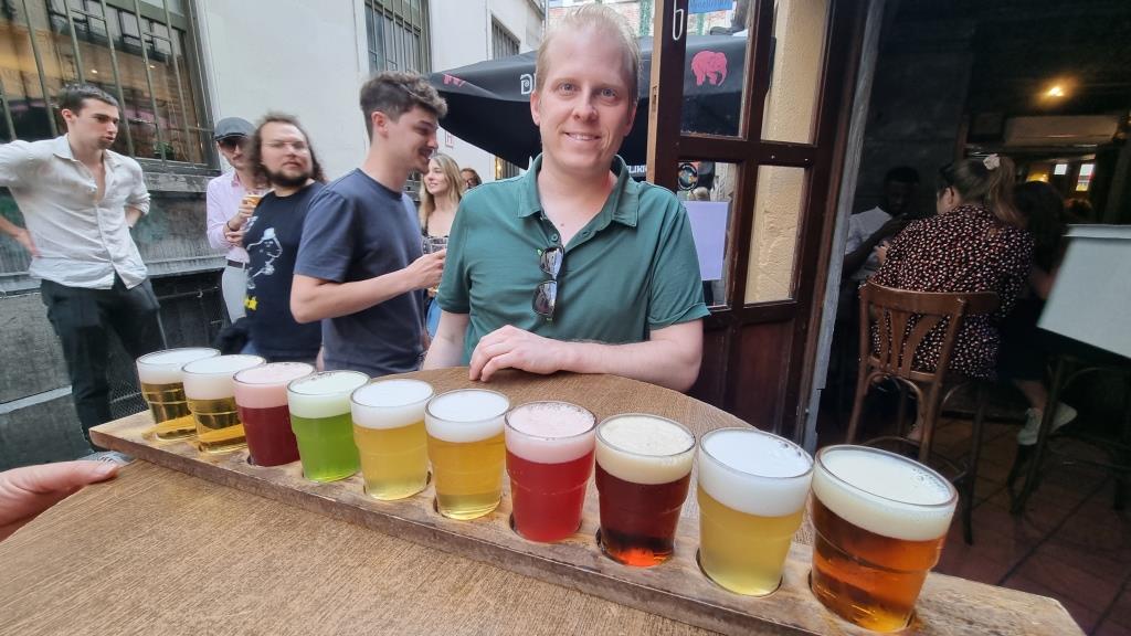 Am Abend machen wir nochmal eine Runde durch Brüssel, kommen an verschiedenen Plätzen vorbei, überall sind die Leute draussen in den Restaurants und es herrscht ein reges Treiben. Eine Bierdegustation im Delirium muss sein, wobei wir nur 1 Brettchen für uns 3 bestellen. Beim pissenden Hund, Zinneke Pis, kommen wir auch noch vorbei und bei der neu renovierten Oper. Bei sommerlichen Temperaturen gönnen wir uns heute einen Gyros beim Griechen und zum Ausklang am Grote Markt ein Mort subite, na hoffentlich trifft das nicht ein.