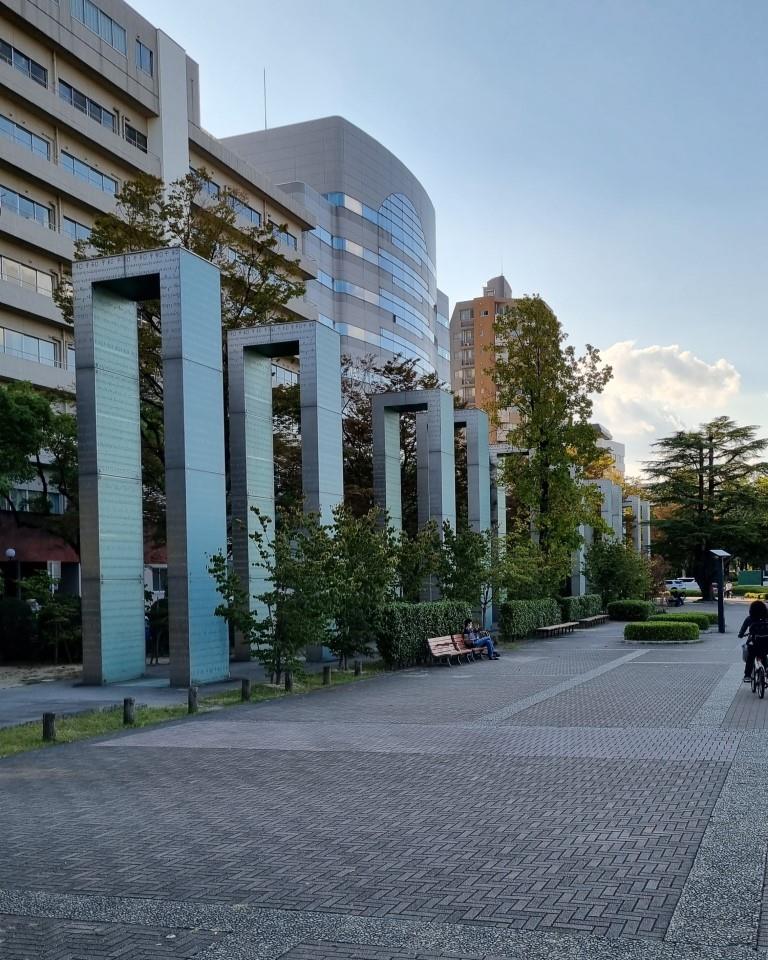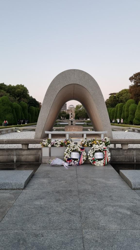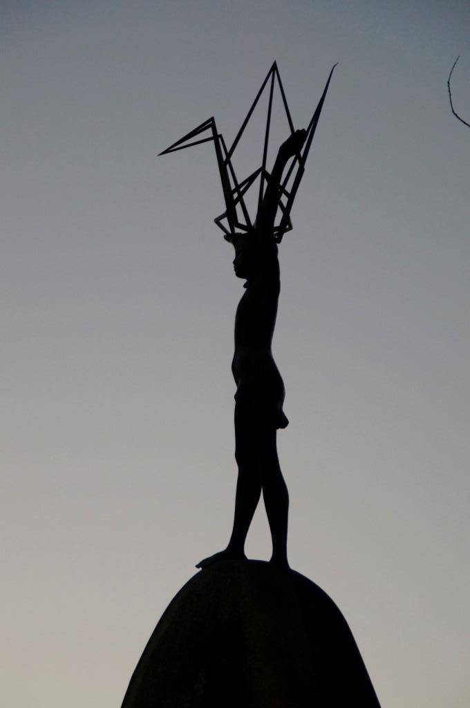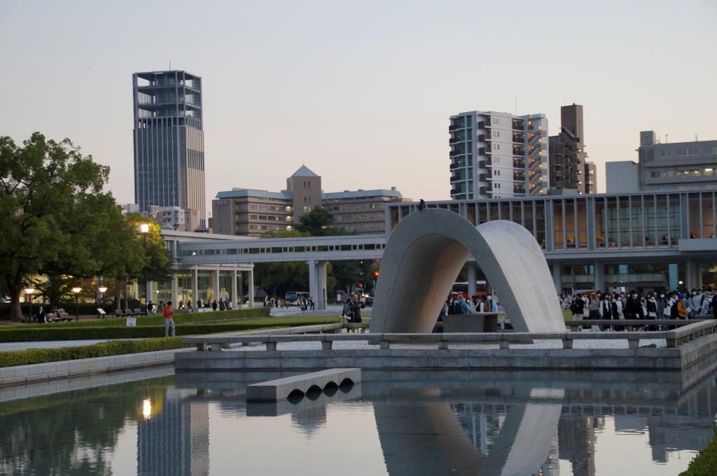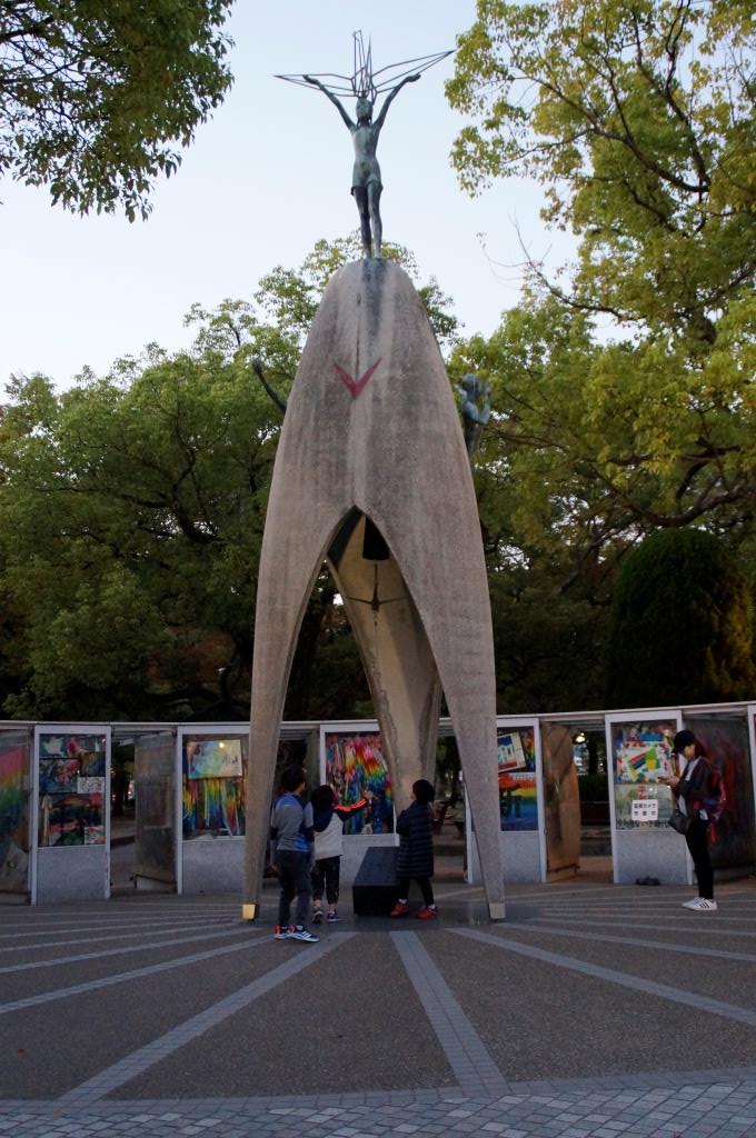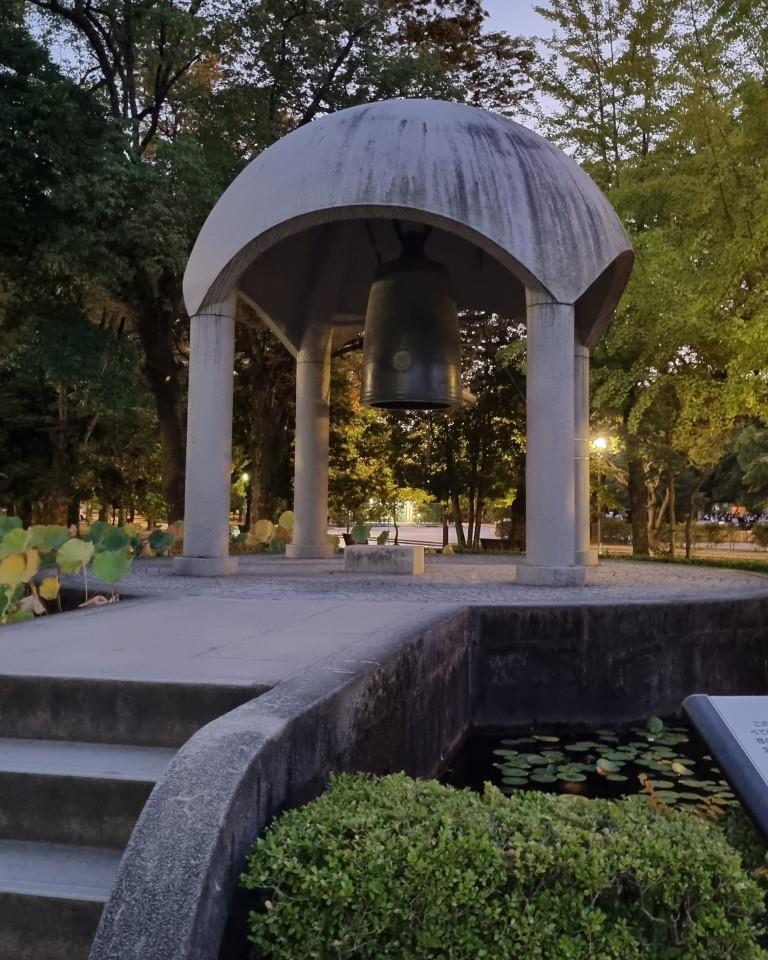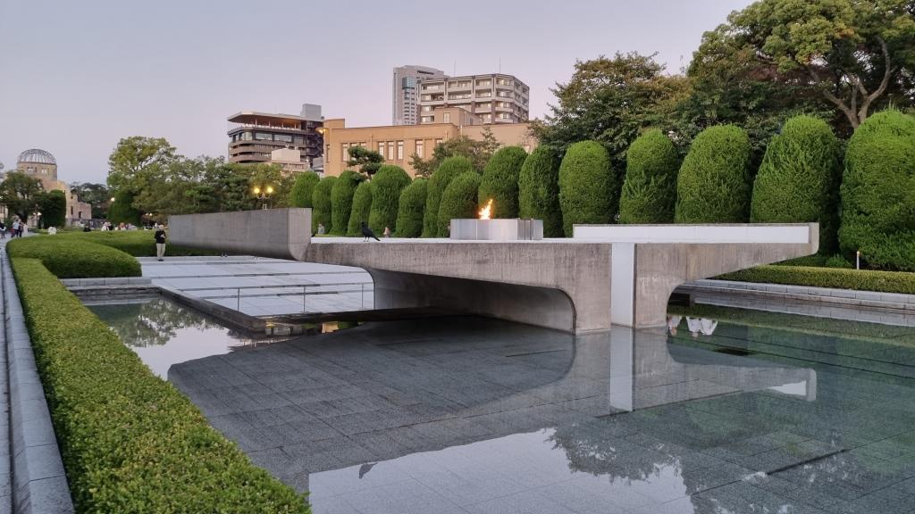 Nach diesem aufwühlenden Besuch spazierten wir noch durch den Friedenspark und sahen uns die verschiedenen Gedenkstätten an, den Cenotaph – die Gedenkstätte für die Opfer der Atombombe, die Überreste der Handelkammer, die Flamme des Friedens, die Friedensglocke und das Kinder-Friedensmonument mit den Kranichen.