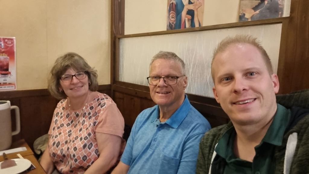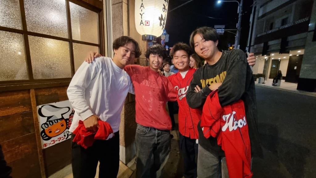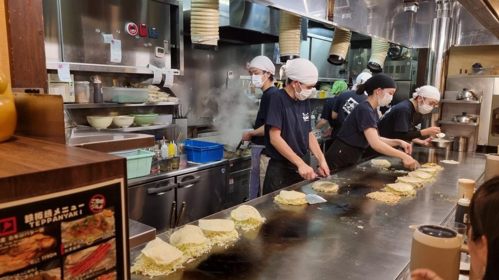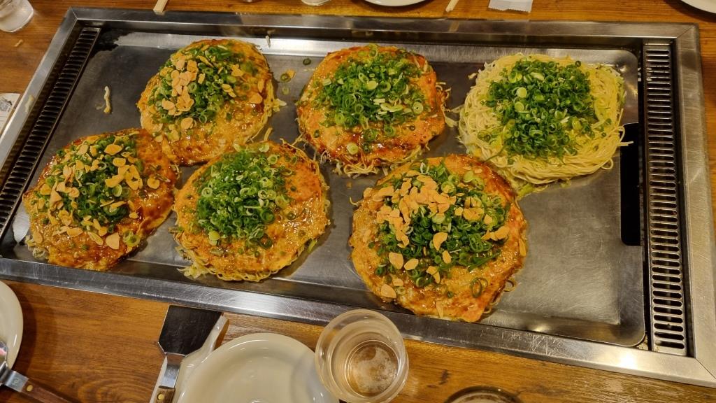 Es ist bereits Abend geworden und wir wollten heute die Spezialität von Hiroshima probieren – Okonomiyaki. Unser Reiseleiter kennt ganz in der Nähe ein sehr beliebtes Restaurant, wo wir diese Art japanischen Pfannkuchen essen können. Allerdings ist das Restaurant so beliebt, dass wir, typisch japanisch, für einen Tisch recht lange anstehen mussten. Wir warteten also ca. 1 Stunde vor dem Restaurant und unterhielten uns mit ein paar jungen Burschen, die im nahegelegenen Fussballstation ein Spiel besucht hatten. Irgendwie verging die Zeit, trotz langem Anstehen und wir konnten jeweils zu sechst an einen Tisch sitzen. Zuerst schauten wir am Tresen zu, wie die Okonomiyaki gemacht wurden, dann bestellte jeder am Tisch seine Version und nach einer Weile kamen die leckeren Pfannkuchen. Im Tisch ist eine heisse Platte eingebaut und so konnten wir die heissen Pfannkuchen vom Tisch „kratzen“ mit einem Spatel und verspeisen. Eine echt super leckere Pfannkuchen-Version. Wir waren begeistert.
