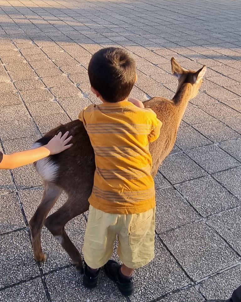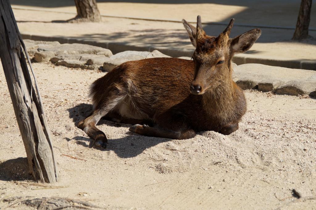 Danach ging es den Weg wieder hinunter und mit den Seilbahnen zum Ausgangspunkt zurück. Als wir beim Itsukushima Schrein vorbeikamen staunten wir nicht schlecht. Das ganze Wasser hatte sich zurückgezogen und der Tempel und Schrein standen jetzt im Trockenen. Ebbe und Flut sind hier gut sichtbar. Wir machten noch ein paar Bilder und spazierten zurück zum Bootsanleger. Dort bekamen wir vom Reiseleiter noch eine Spezialität der Insel, Momiji Manju, ein mit Bohnenpaste gefülltes Kleingebäck, sehr lecker. Auch die Rehe schienen Interesse daran zu haben. Mit dem Schnellboot ging es dann wieder flott zurück nach Hiroshima.
