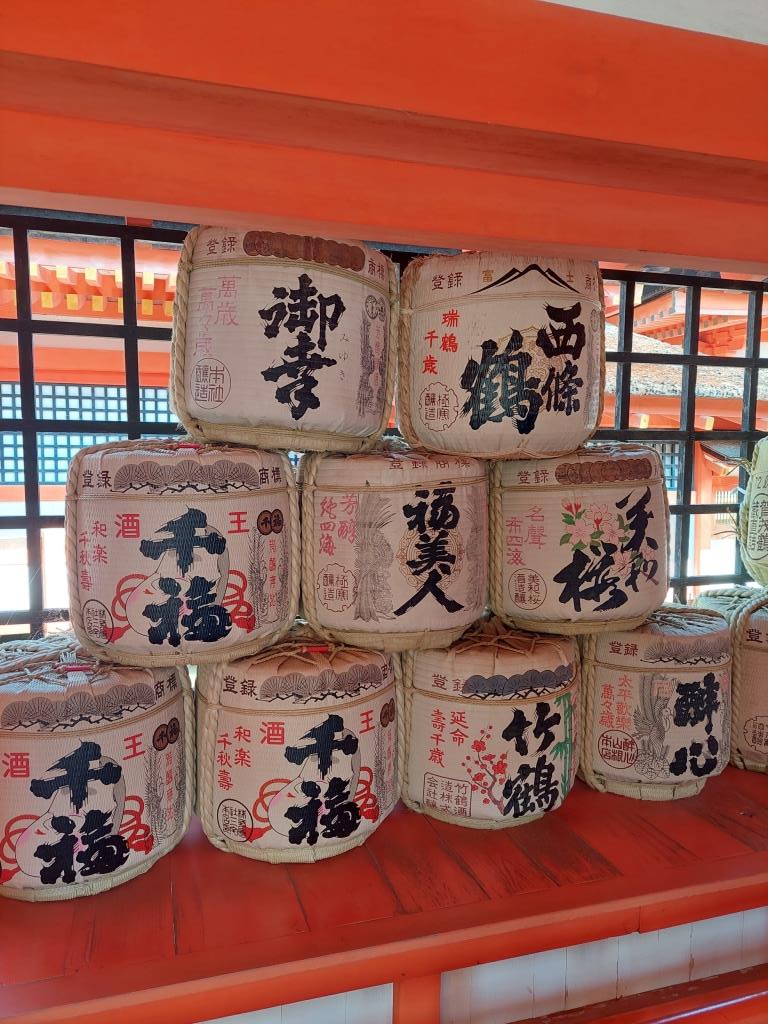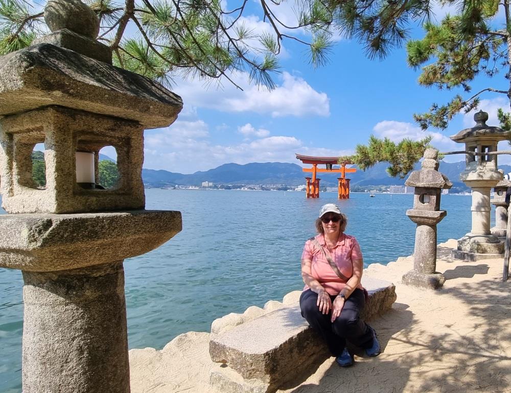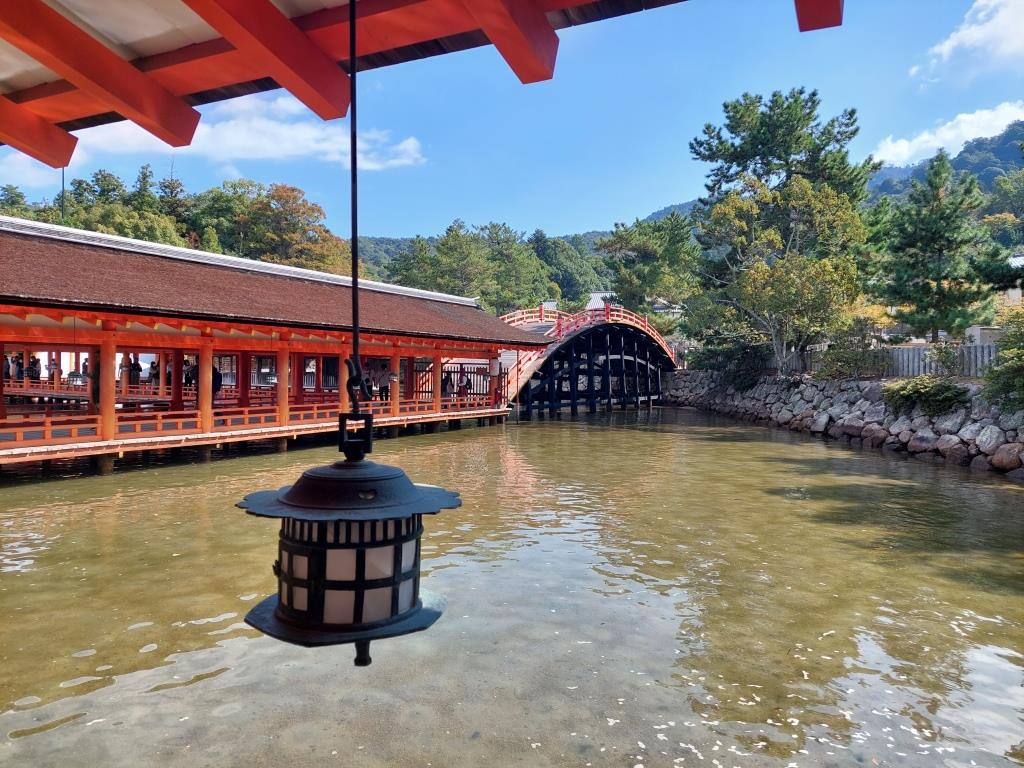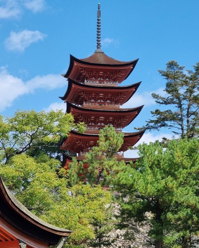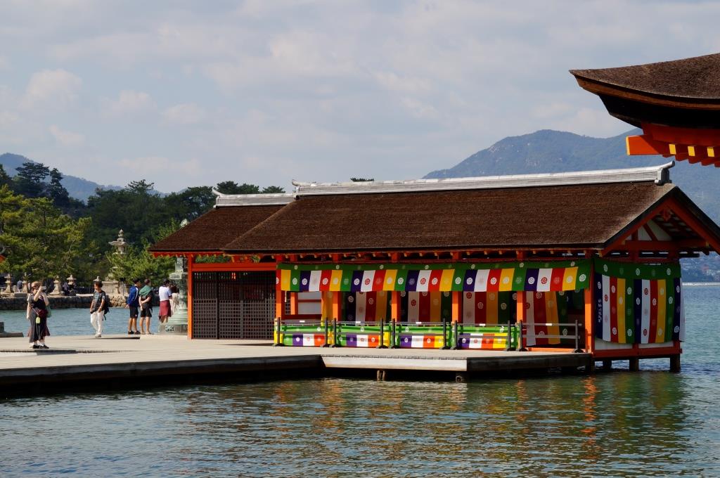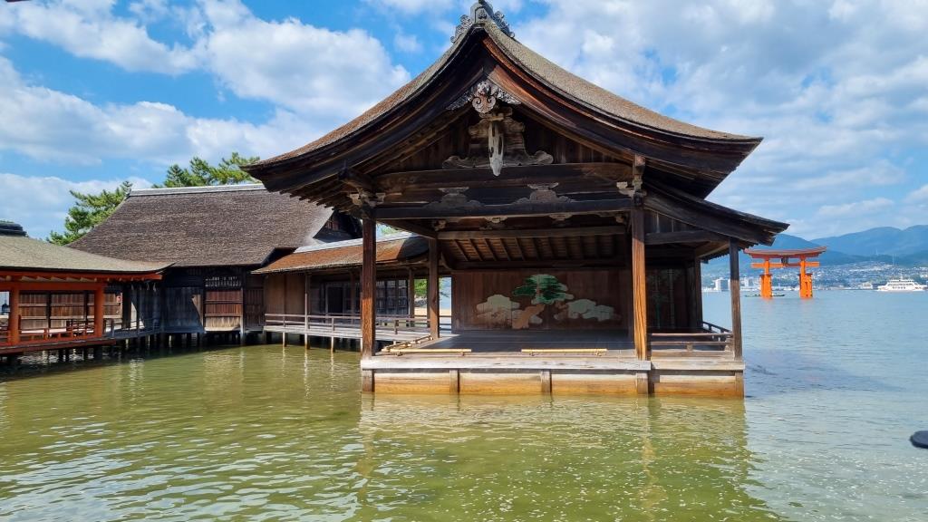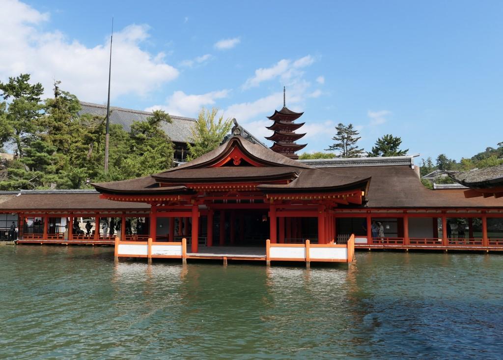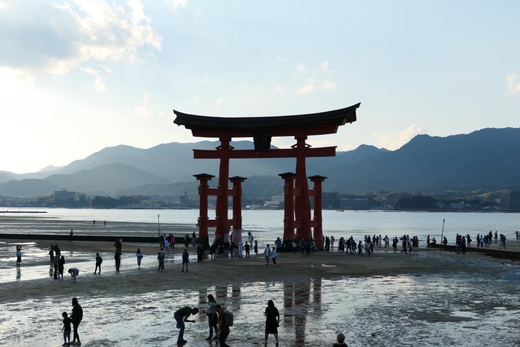 Nach dem Frühstück mit Aussicht auf den Friedenspark machten wir uns auf den Weg zu einem Schnellboot, das uns in 45 Minuten auf die Insel Miyajima brachte. Dort warteten auch schon die Rehe auf uns. Wir spazierten durch das Gelände mit dem imposanten Itsukushima Schrein mit seinem roten Tori sowie der ganzen Tempelanlage umgeben von Wasser.