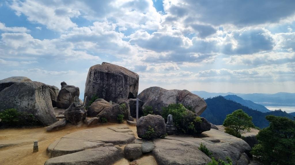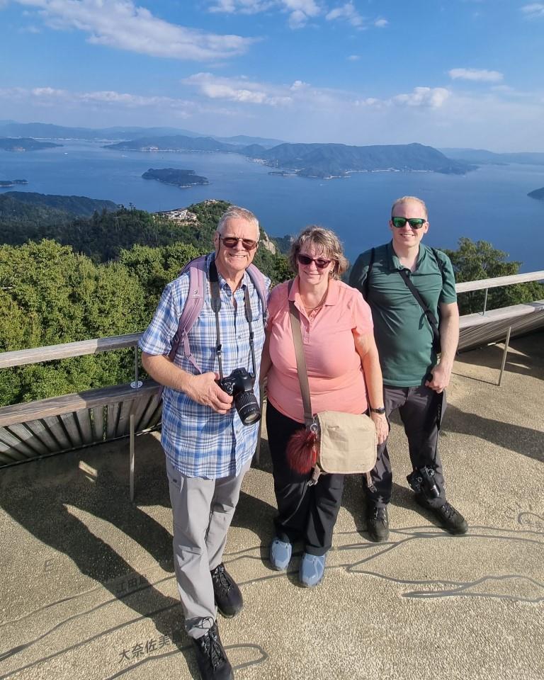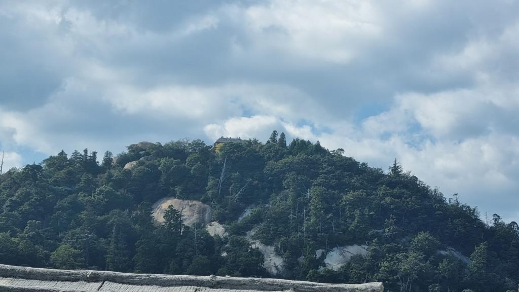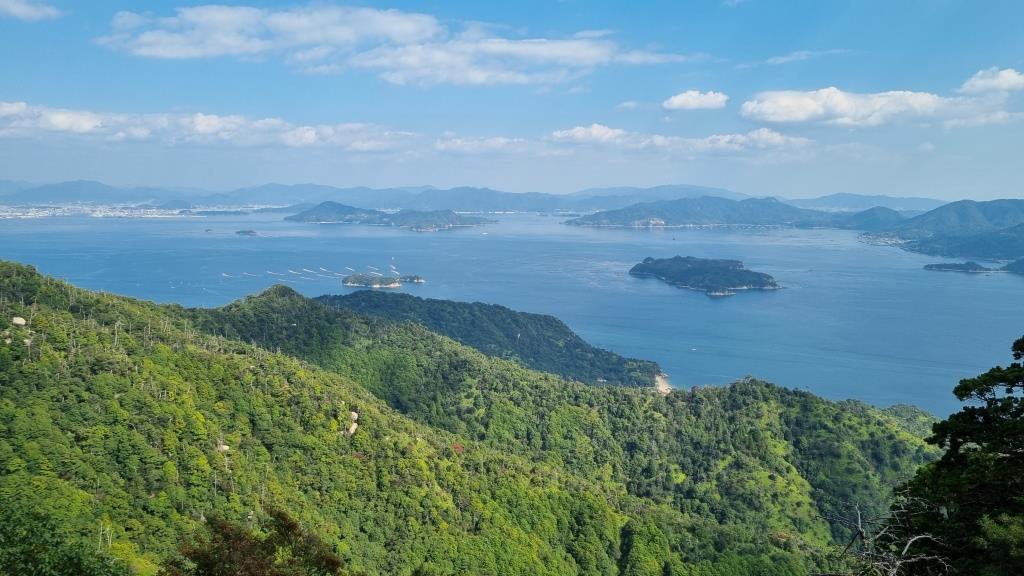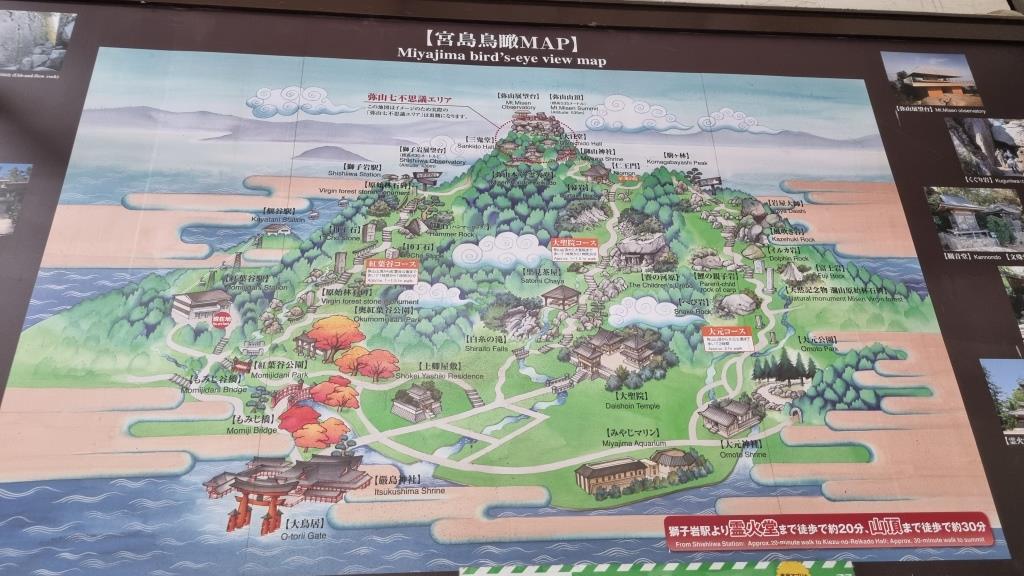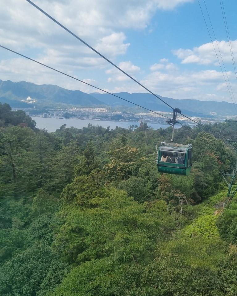 Eine sehr schöne Tempelanlage und mit dem Tori im Wasser auch ein bekanntes Wahrzeichen Japans. Wir gingen denn ein Stück den Berg hinauf zu einer Gondelbahn. Mit dieser fuhren wir zur ersten Station, dort stiegen wir um und fuhren mit einer kleinen Seilbahn auf den Mount Misen. Oben angekommen begaben wir uns auf eine ca. 30 Min. Wanderung den Hügel ganz hinauf zum höchsten Punkt auf 535 m.ü.M. Ein sehr schöner Aussichtspunkt wartete oben auf uns und wir konnten rundherum blicken.