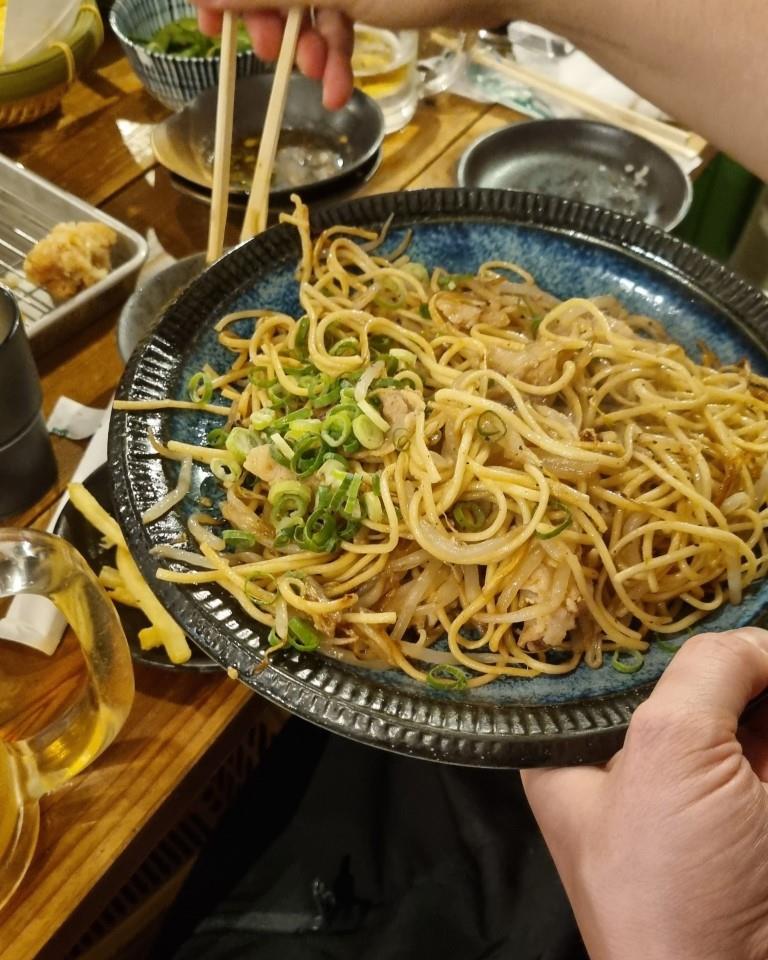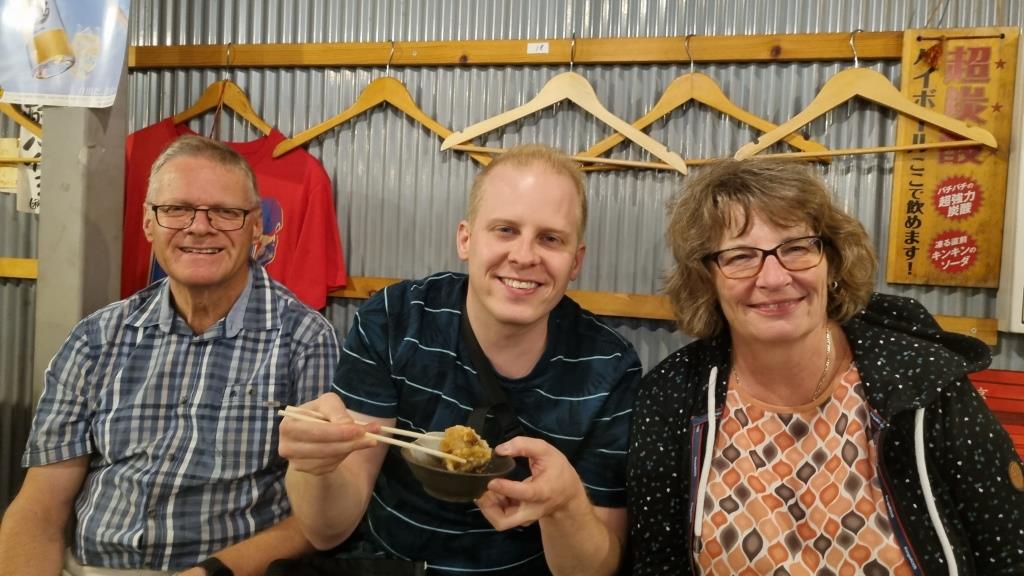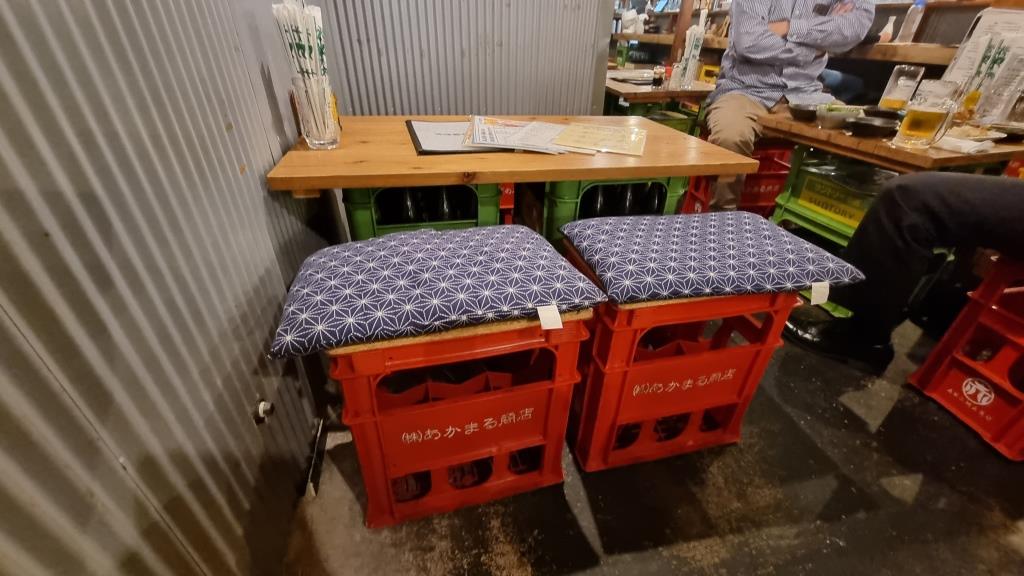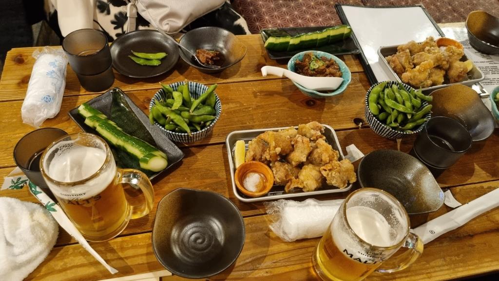 Zurück im Hotel hatten wir nur kurz Zeit uns frisch zu machen und schon ging das Programm weiter zum Abendessen. Diesmal in einer urigen Kneipe, mit sehr einfacher Einrichtung, ohne langes Anstehen. Gesessen sind wir auf Bierkisten und gegessen haben wir ausgezeichnete japanische Gerichte, wie Edamame, eingelegtes Gemüse, Tempura, Sobanudeln und mehr. Es war wieder alles sehr fein.