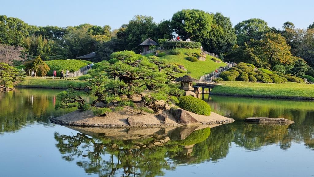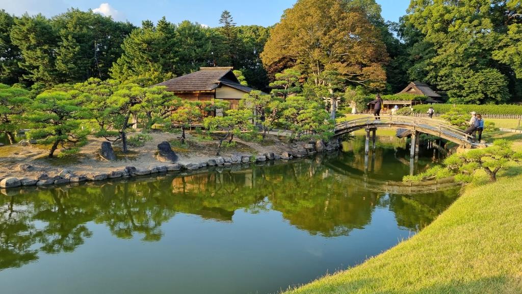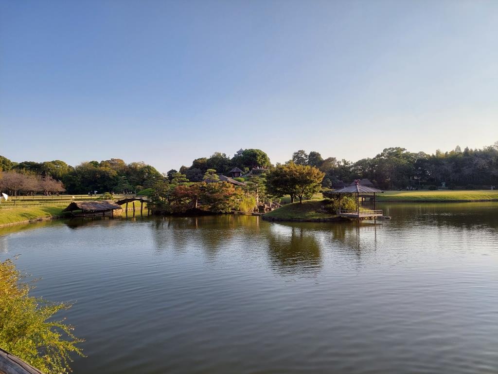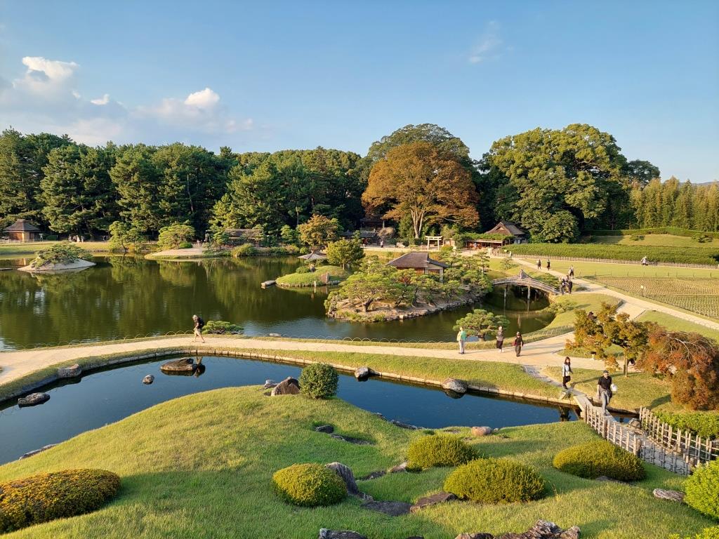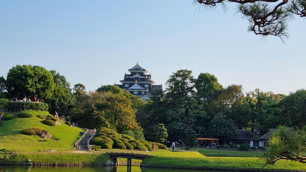 Im Anschluss fuhren wir mit dem Zug wieder zurück nach Okayama. Dort besuchten wir den Korakuen-Garten, einer der drei schönsten traditionellen Gärten Japans. Vom Bahnhof liefen wir etwa 20 Minuten zum Garten, der sich wirklich als sehr schön und weitläufig entpuppte. Das Wetter passte natürlich auch sehr gut.