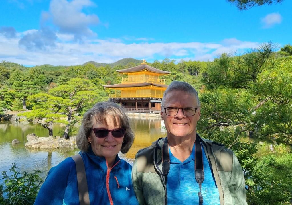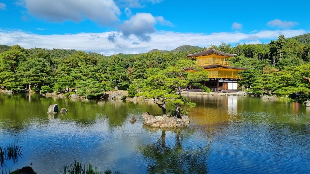 Nach dem Ausflug nach Nara kamen wir schon am Vorabend in Kyoto an. Nun galt es die alte Kaiserstadt mit ihren unwahrscheinlich vielen Sehenswürdigkeiten zu besichtigen. Frühmorgens nach dem Frühstück fuhren wir mit dem Bus zum schönsten und bekanntesten und dementsprechend gut besuchten Tempel von Kyoto dem goldenen Pavillion, Kinkakuji. Wir hatten noch Glück und mussten beim Eingang nicht lange warten und konnten das Gelände zügig betreten. Vor den Fotospots sammelten sich allerdings schon die vielen Besucher und man musste etwas anstehen um ein Foto ohne Menschen machen zu können.