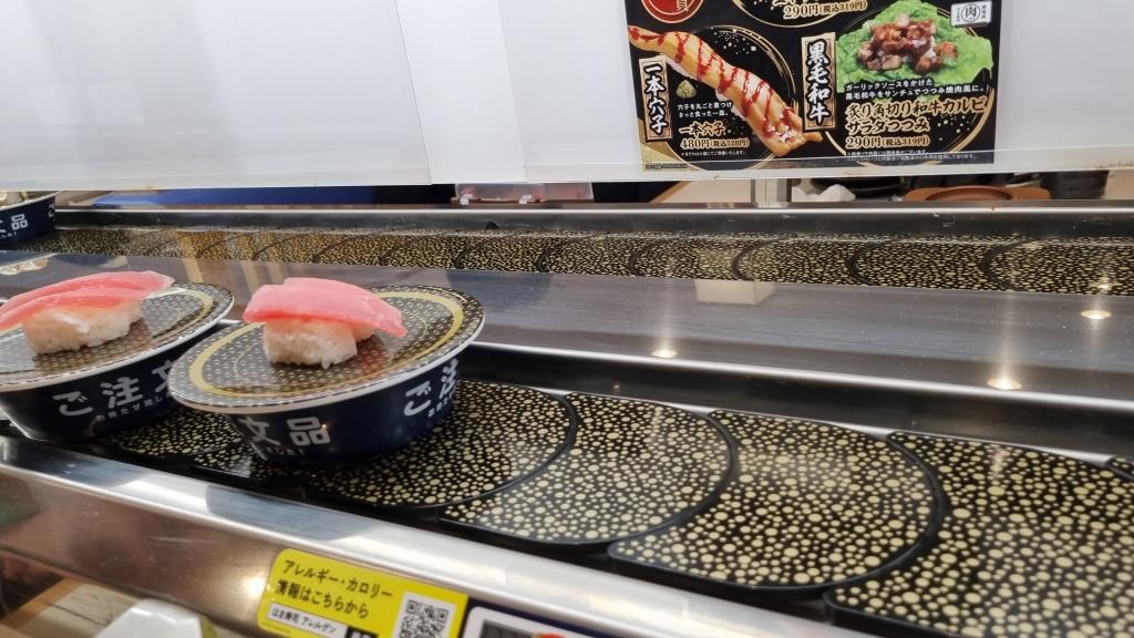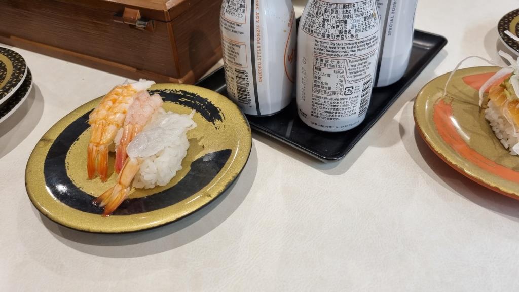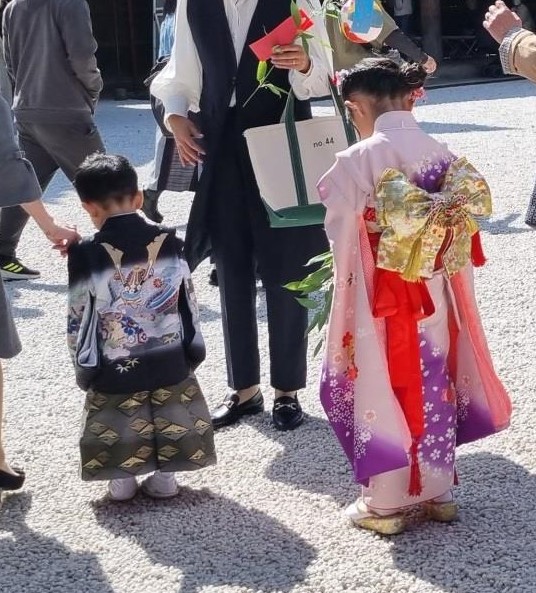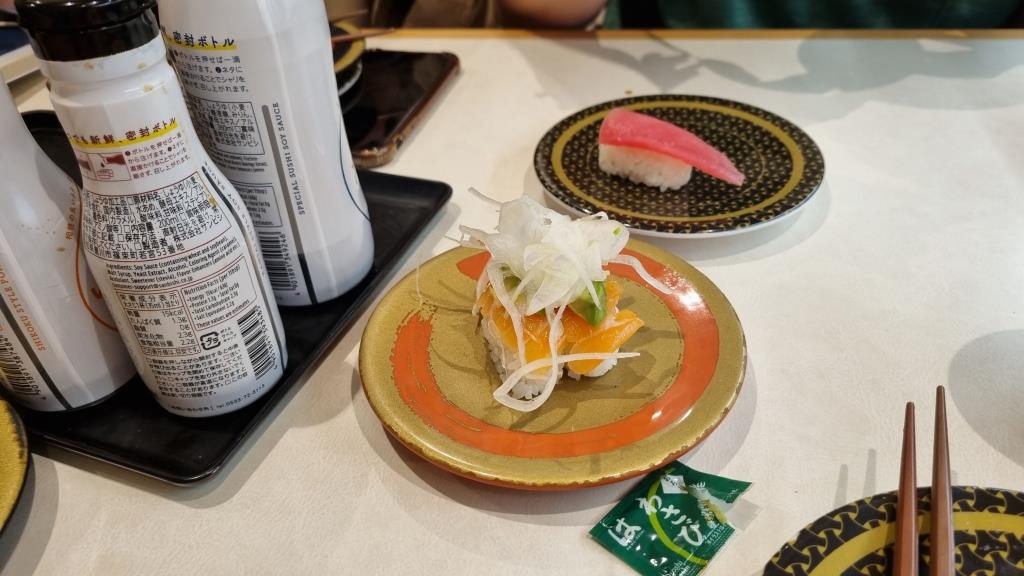 Danach spazierten wir weiter zum Kitano-Tenman-gu Schrein. Eine recht grosse Anlage mit vielen Gebäuden. Da es Samstag war sah man auch viele Einheimische in traditionellen Gewändern, auch Kinder, das sah richtig schön aus. Nach diesen Tempeleindrücken hatten wir etwas Hunger und unser Reiseleiter ging mit uns in ein Restaurant wo es einen Sushi-Train gab. Das war wirklich lustig. Man bestellte seine Sushi per Tablett am Tisch und wenn das Bestellte im Anmarsch war klingelte das Tablett und machte einen darauf aufmerksam, dass jetzt das bestellte Teil gleich ankommt. Im Vorbeifahren fischte man seinen Teller runter und genoss das wirklich sehr gut zubereitete Sushi bis es wieder klingelte und das nächste angebraust kam. Es gab nicht nur Fisch, Andi bestellte mal einen Hamburger-Sushi und sogar Vermicelles zum Dessert konnten bestellt werden.