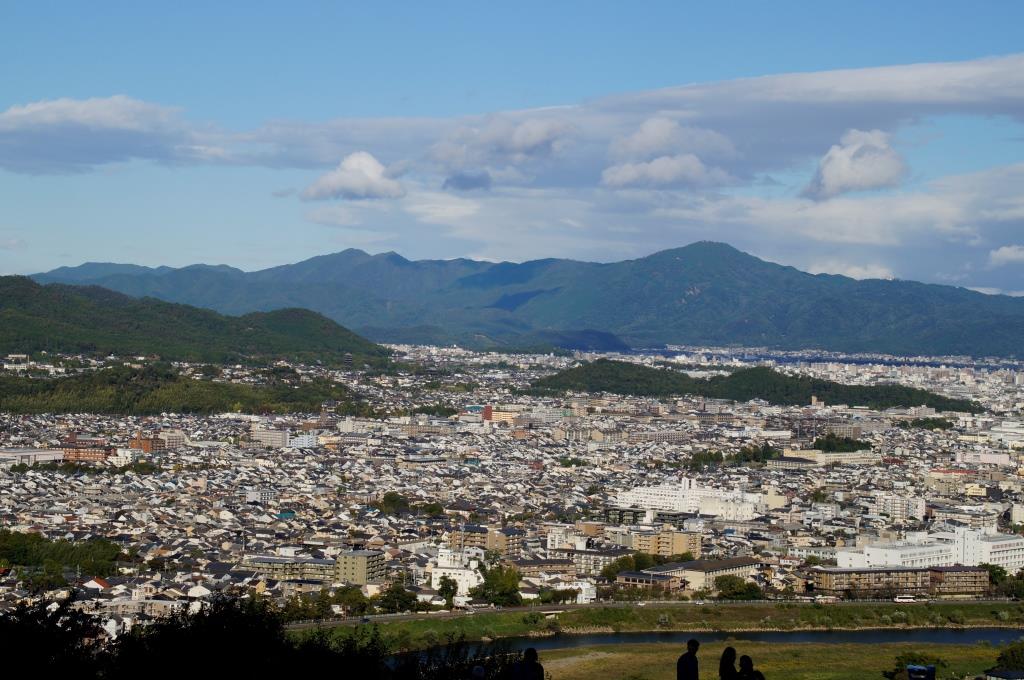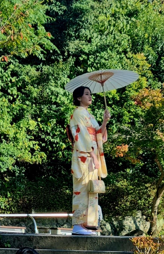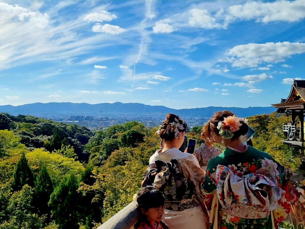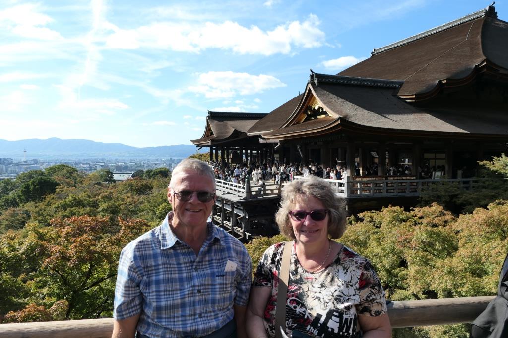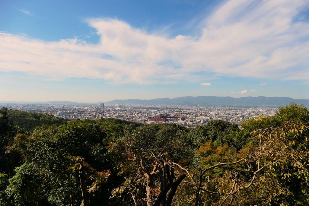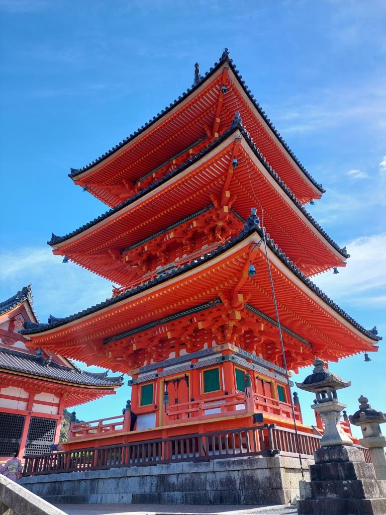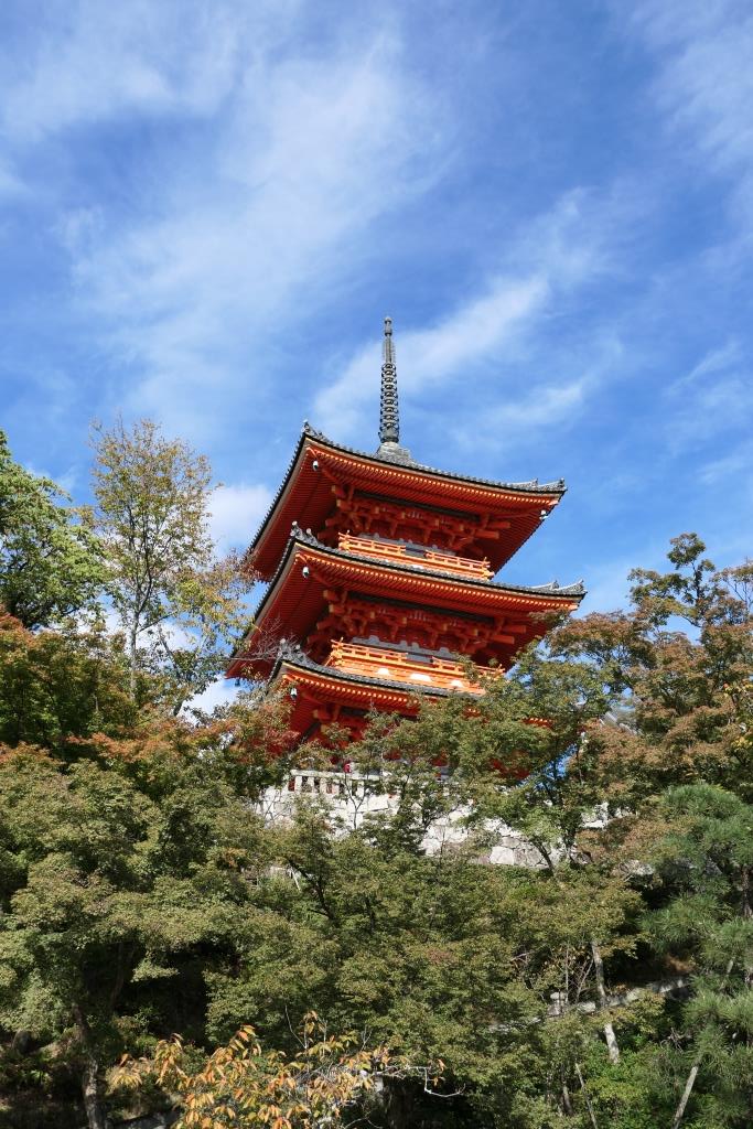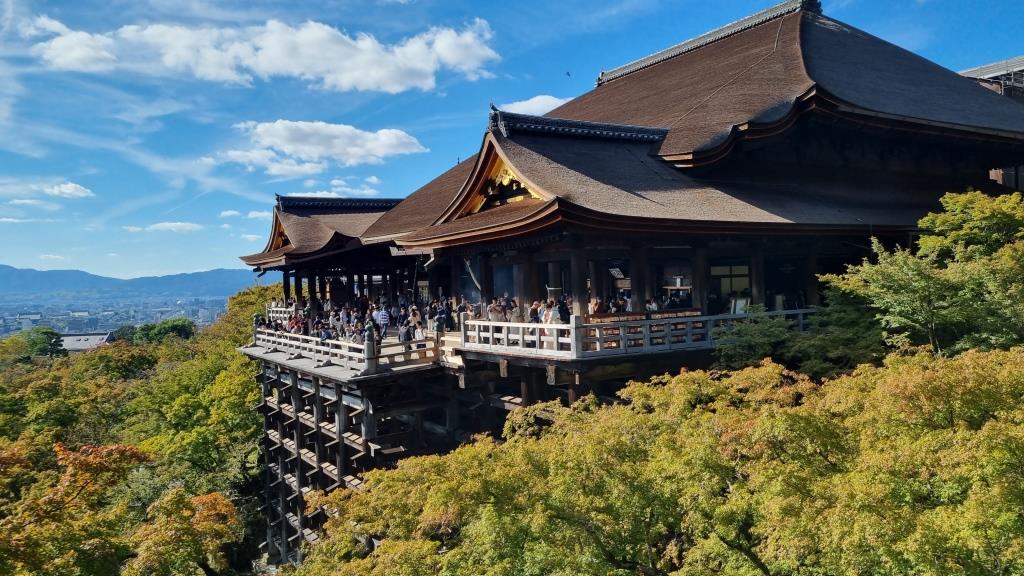Man lief eine enge Gasse hinauf zum Eingangstor dann immer wieder ein paar Treppen hoch bis man auf der grossen Holzterrasse stand und die herrliche Aussicht auf Kyoto geniessen konnte mit 100 anderen. Unterstützt von einer traditionellen japanischen Holzkonstruktion ohne Verwendung von Nägeln schwebt die Terrasse 13 Meter über dem Boden. Man lief dann weiter zum nächsten Aussichtspunkt dem Okunion. Auch von hier konnte man schöne Fotos machen von der Terrasse und Kyoto. Der Weg führte weiter in einen kleinen Wald und dann langsam hinunter zurück zum Eingang des Tempels. Von unten konnte man die imposante Holzkonstruktion der Terrasse deutlich sehen.