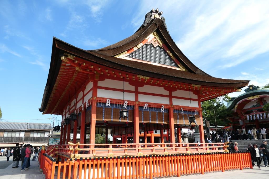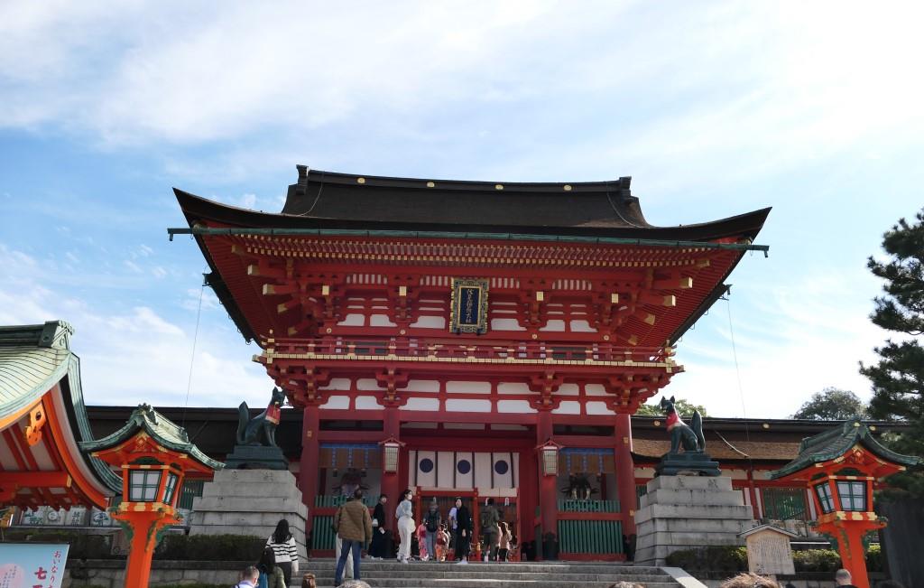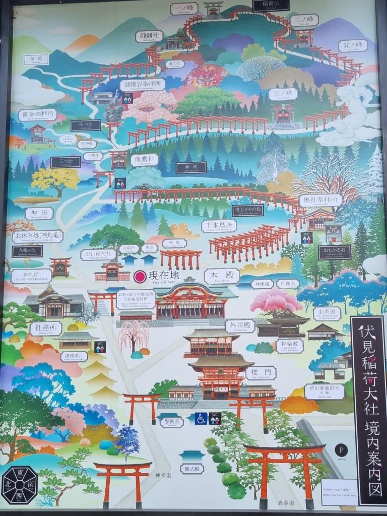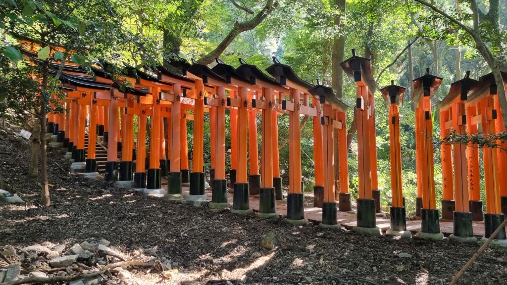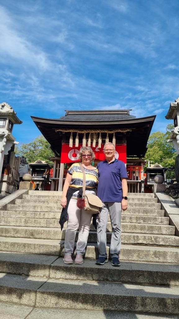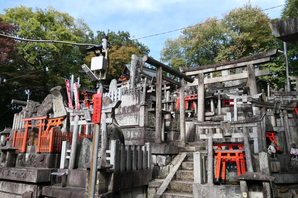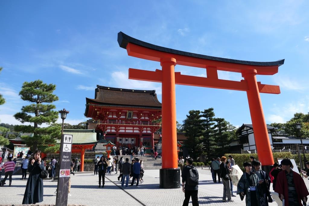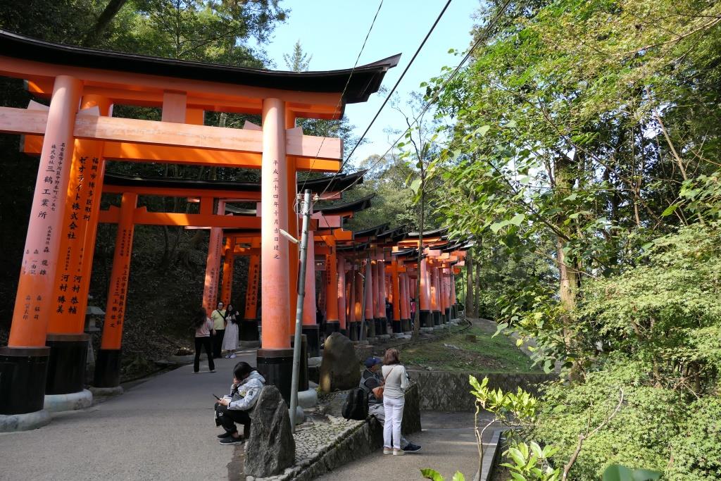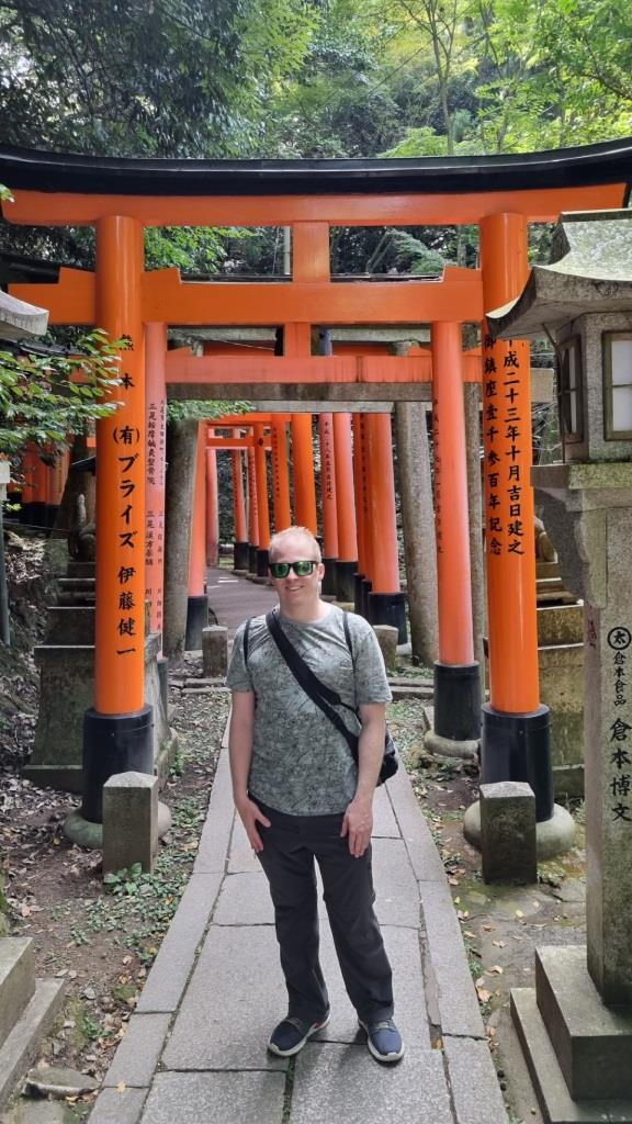 Am nächsten Morgen war wieder frühes Aufstehen angesagt, wie eigentlich immer in diesen Ferien. So besammelten wir uns nach dem Frühstück vor dem Eingang des Hotels und fuhren mit Bus und Zug in etwa 40 Minuten zum Fushimi Inari Taisha Schrein. Dieser Schrein ist bekannt als Schrein der Tausend Roten Tori. Bis zum Gipfel auf 233 m.ü.M. durchschreitet man einige Tori und viele Stufen. Wir konnten es uns nicht nehmen lassen und sind bis ganz hinauf gelaufen. Oben hatten wir eine schöne Aussicht auf Kyoto, dann ging es alles wieder hinunter. Wir brauchten etwa 2 1/4 Stunden rauf und runter mit vielen Fotostopps.