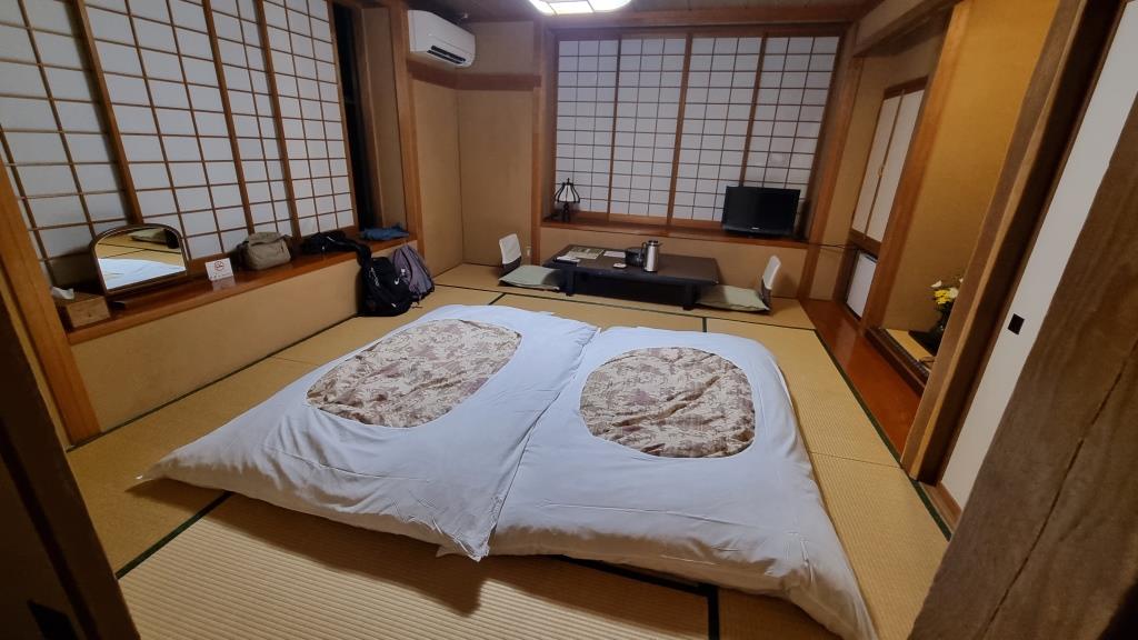 Das Kaiseki-Dinner war so lecker und alles so schön präsentiert. Wir waren restlos begeistert. Die japanische Küche hat uns überzeugt, wir haben ausnahmslos sehr gut gegessen während den ganzen 3 Wochen. Danach konnte man noch in den Onsen und da wir sowieso müde waren von der Wanderung sind wir auch früh in die kuscheligen Betten auf den Tatami Matten. Wir hatten auch hier wieder sehr gut geschlafen. In diesem Ryokan hatten wir auch eine Toilette und Waschgelegenheit im Zimmer.
