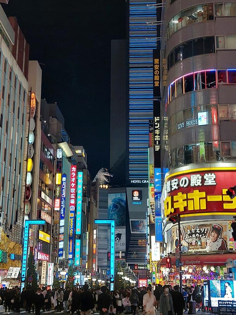 Wir ruhten uns im Zimmer kurz aus und dann ging es mit der Metro und zu Fuss durch die Megastadt. Als erstes schauten wir uns die bunt beleuchteten Hochhäuser von Shinjuku an. Es war schon alles für Halloween dekoriert und in Shinjuku schienen alle unterwegs zu sein. Wir assen in einem Kaufhauskomplex leckeres Tonkatsu und frittierte Crevetten und mischten uns dann unters Volk.