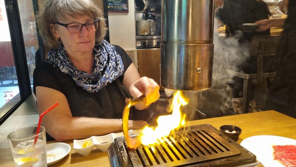 Vermutlich wäre an einem Wochentag noch mehr los an dieser Ecke, aber egal, wir waren dort. Leider hatten wir den Hachiko auch nicht von oben herab sehen können. Am Abend konnten wir alleine essen gehen so begaben wir uns vom Hotel zu Fuss nach Roppongi und fanden dort ein cooles Restaurant wo es leckeren Tischgrill gab.