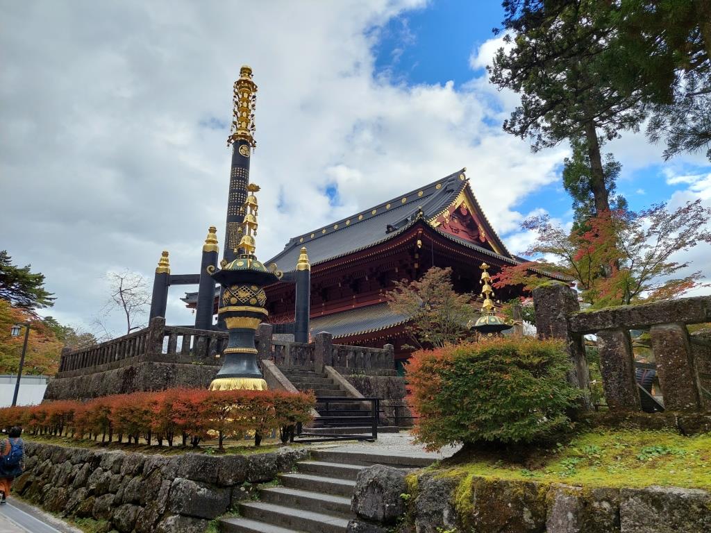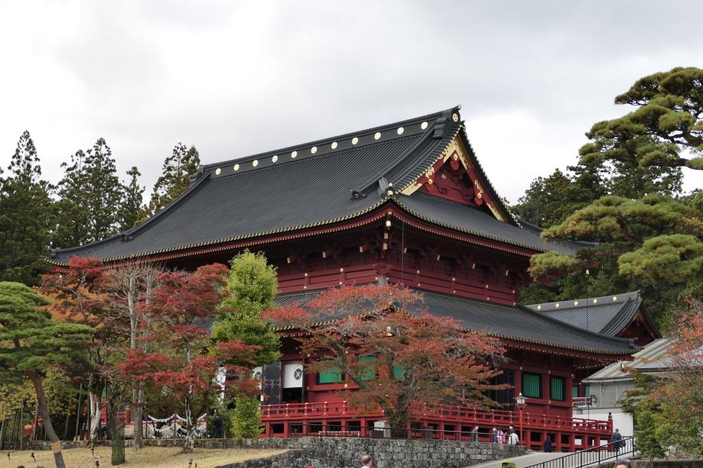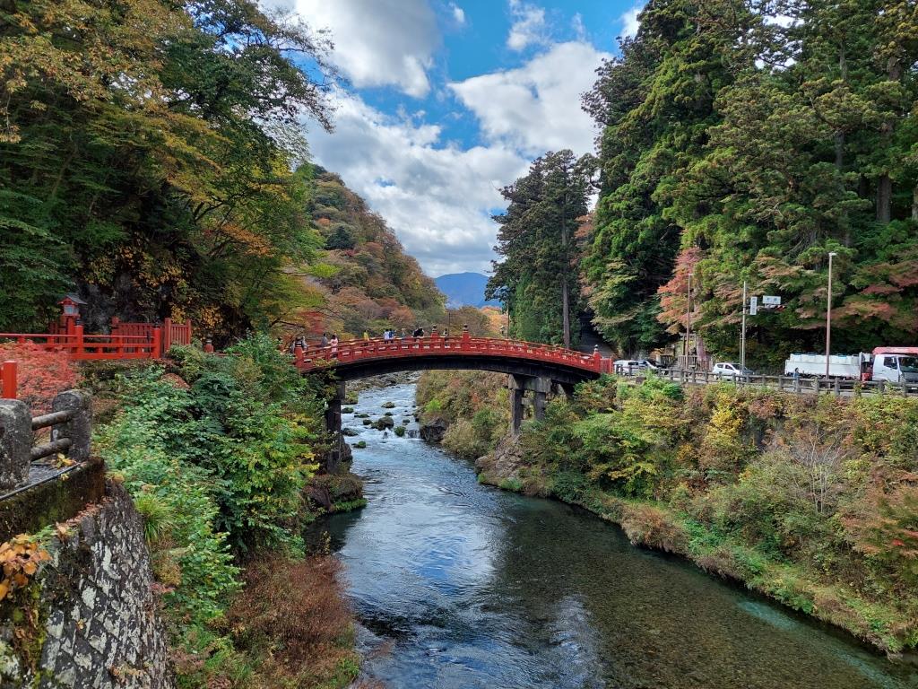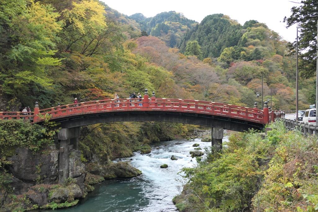 Am nächsten Morgen, nachdem wir wieder schlecht geschlafen hatten auf diesen harten Pritschen, ging es bereits früh los mit Metro und mit dem futuristischen Zug in 2 1/2 Stunden nach Nikko. Nikko ist die zentrale Stadt des Nationalparks Nikko und für den reich verzierten Toshogu Schrein bekannt. Dort befindet sich das Mausoleum von Tokugawa Ieyasu, dem Gründer des Tokugawa Shogunats, welches bis 1868 Japan beherrschte. Doch zuerst marschieren wir vom Bahnhof Nikko durch das Städtchen durch bis zur roten Shinkyo Brücke.