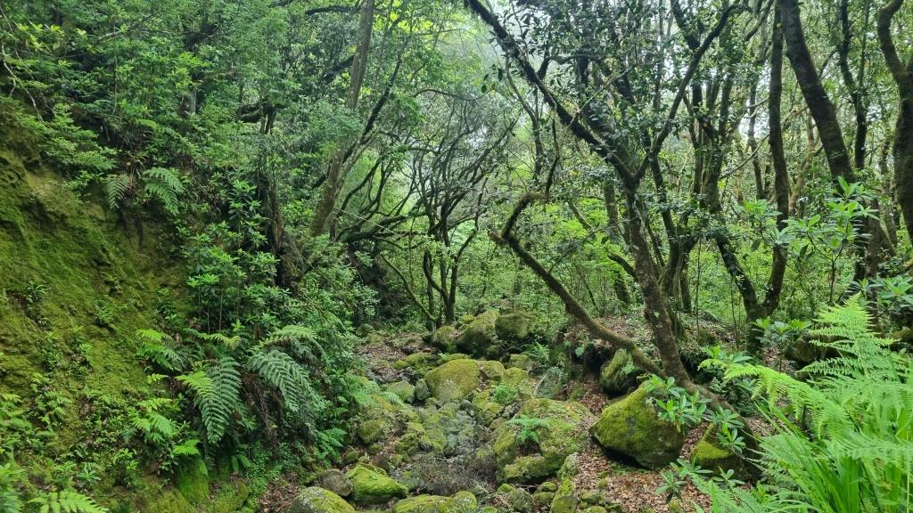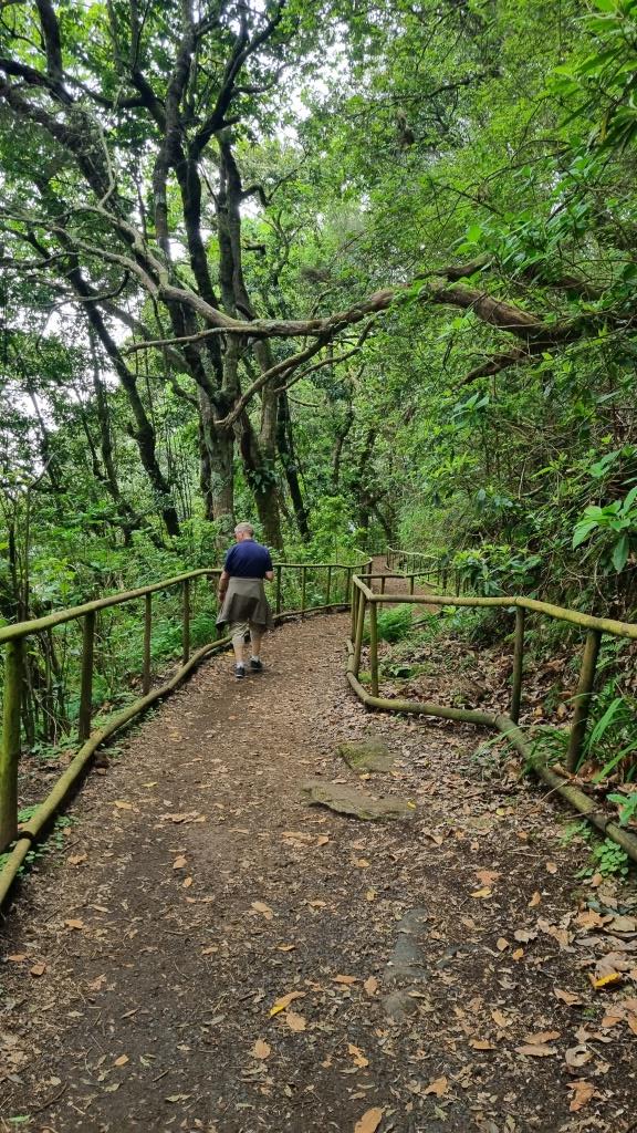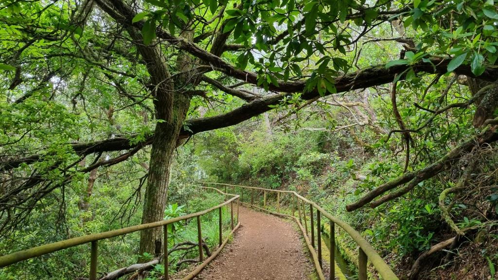 Von hier aus fahren wir zum Parque Florestal das Queimadas zum Camino para todos, eine Wanderung für alle. Eine schlechte Entscheidung wie wir nachher feststellen. Wir dachten hier hat es einen grossen Parkplatz, doch die Anfahrtsstrasse ist extrem schmal und wenn ein Auto entgegenkommt muss man schauen, dass man aneinander vorbeikommt. Die knapp 4 km ziehen sich. Immerhin hat es hier genügend Parkplätze. Vom Forsthaus Queimadas geht der „Weg für alle“ durch den wunderschönen Wald bis zum Pico Pedras. Der Weg ist sehr einfach, auch Kinderwagen und Rollstuhl geeignet und bietet einen wunderschönen Einblick in die Natur Madeiras. Ausserdem ist er nicht so überfüllt und somit noch idyllisch. Für den Hin- und Rückweg, von ca. 5,6 km brauchen wir etwa eine Stunde. In der Nähe des Pico Pedras kommt man zu einem kleineren Parkplatz, der jedoch von der Strasse her besser erschlossen ist als der beim Forsthaus.