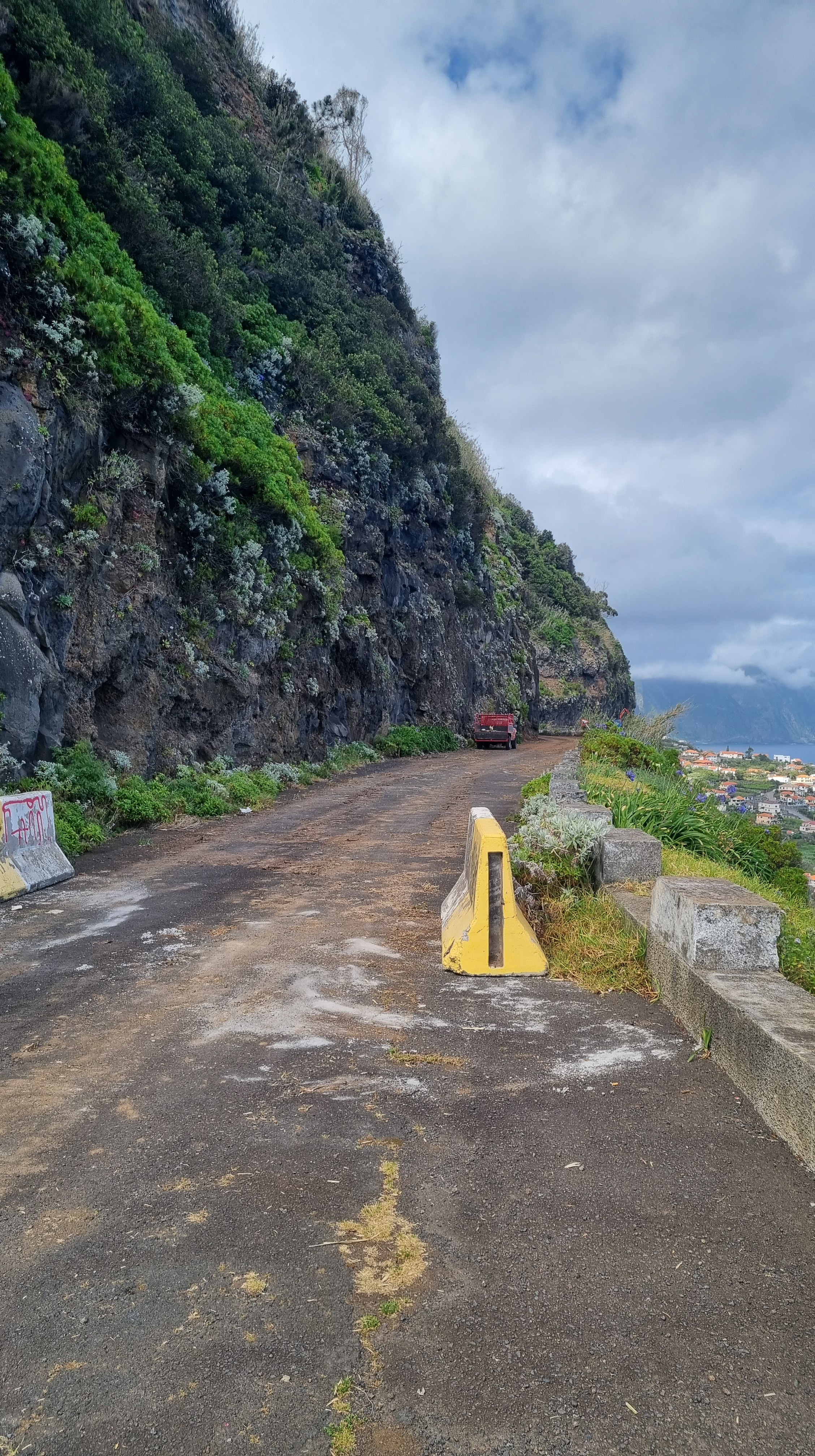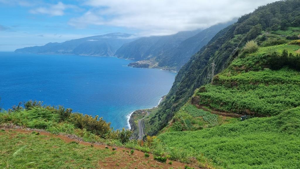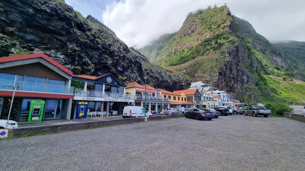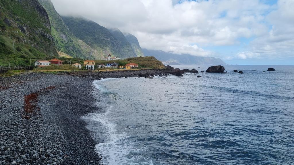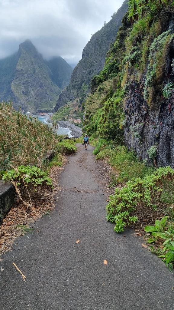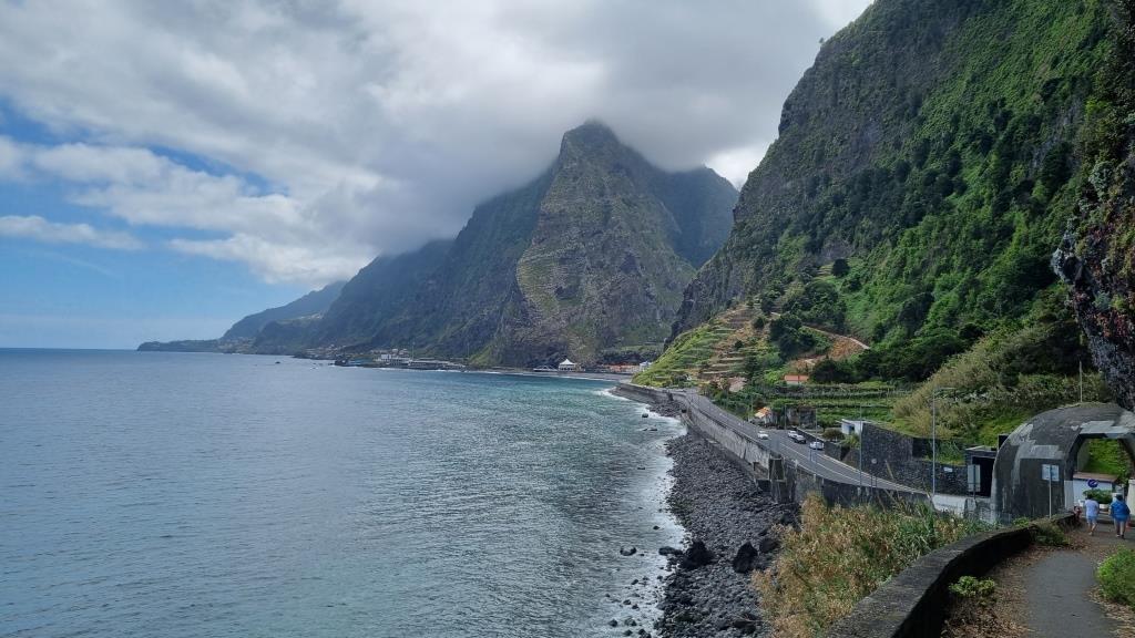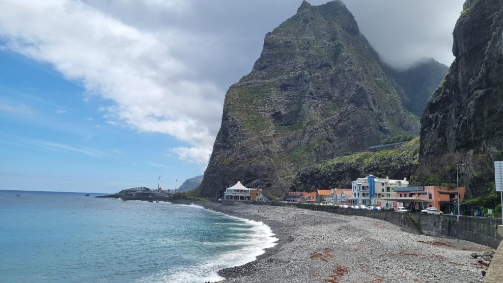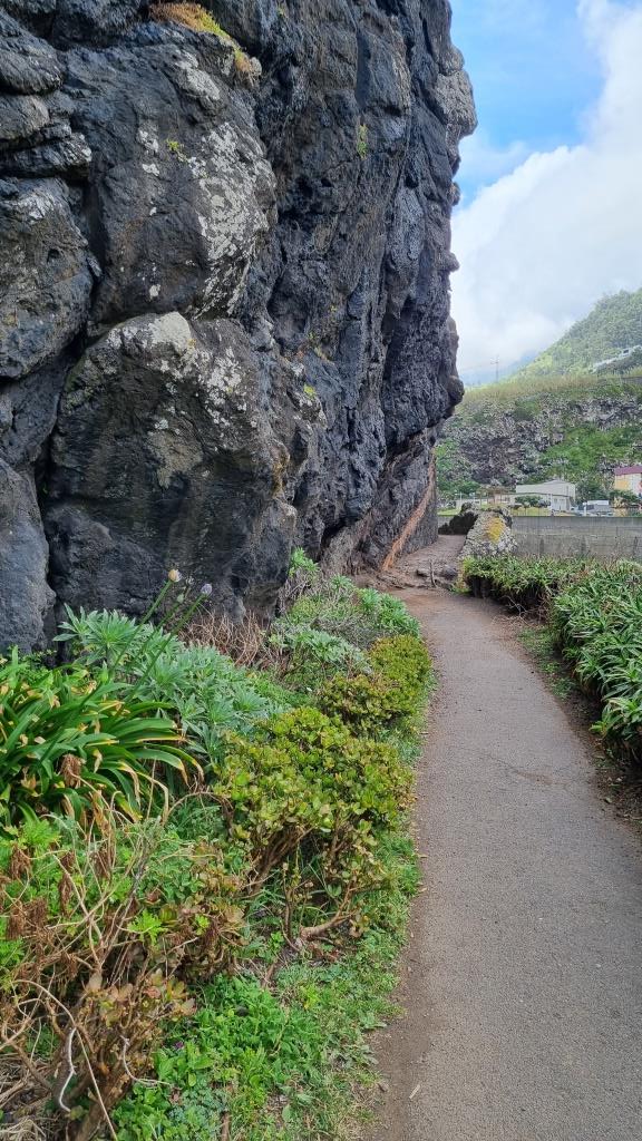 Die Promenade ist nett gemacht, hier im Norden hat es aber auch viel weniger Touristen als im Süden. Das Wetter ist sehr unbeständig und die Küste ist rauh, das Meer sehr wellig. Aber schön ist es trotzdem hier. Wir fahren im Anschluss weiter nach São Vicente. Dieser Ort ist etwas grösser, hier hat es ein paar Restaurants und einen schwarzen Kieselstrand. Wir spazieren bis zu einem Teilstück der alten Strasse. Dort gehen wir auf der gesperrten Strasse, auf welcher wir 1987 mit dem Bus entlang gefahren sind und staunen wie schnell sich die Natur alles zurückholt. Andi wird es auf der alten Strasse etwas mulmig, vor allem herrscht auch akute Steinschlaggefahr. Also drehen wir um, wir sind ja zu Fuss unterwegs, und laufen zurück zum Auto.