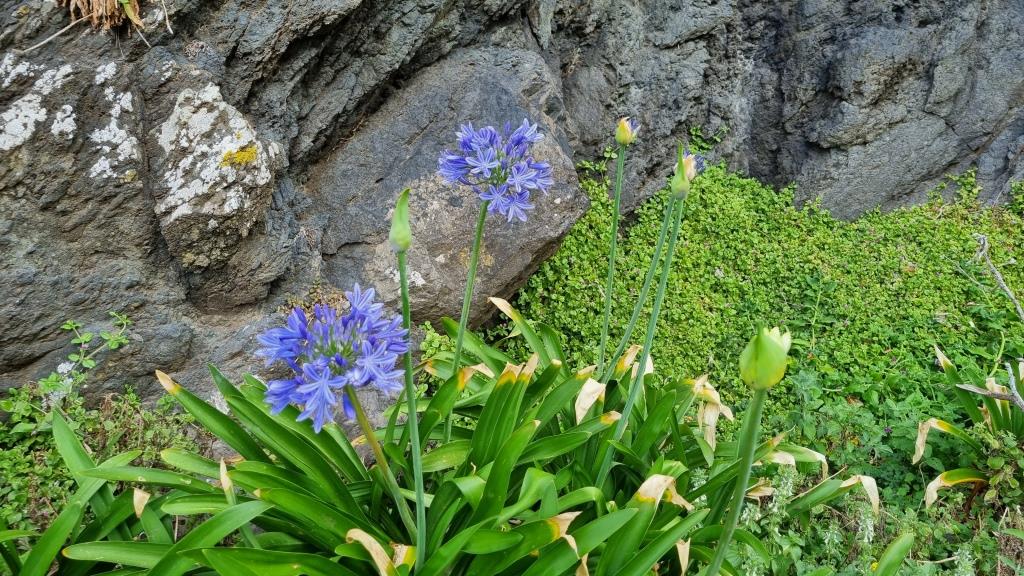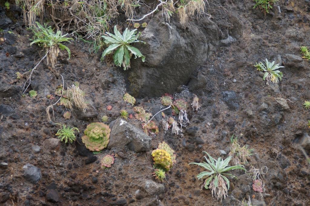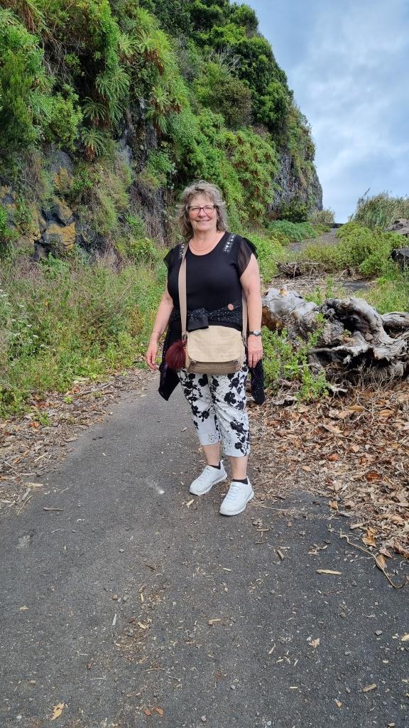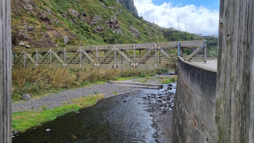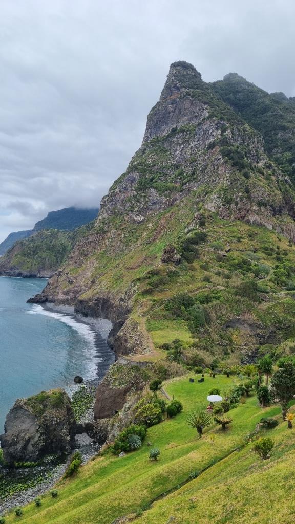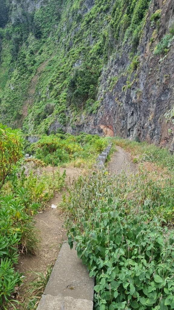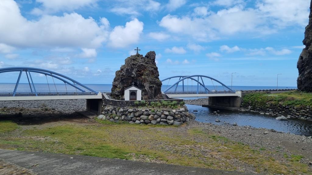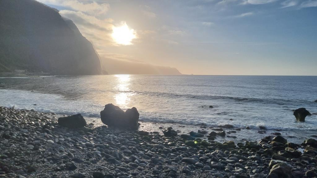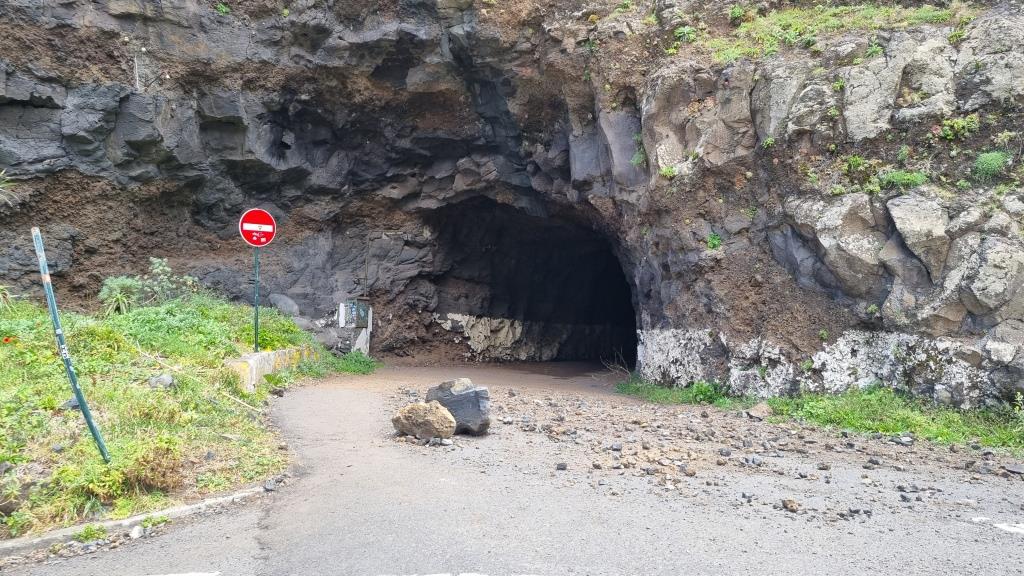 Die Promenade ist nett gemacht, hier im Norden hat es aber auch viel weniger Touristen als im Süden. Das Wetter ist sehr unbeständig und die Küste ist rauh, das Meer sehr wellig. Aber schön ist es trotzdem hier. Wir fahren im Anschluss weiter nach São Vicente. Dieser Ort ist etwas grösser, hier hat es ein paar Restaurants und einen schwarzen Kieselstrand. Wir spazieren bis zu einem Teilstück der alten Strasse. Dort gehen wir auf der gesperrten Strasse, auf welcher wir 1987 mit dem Bus entlang gefahren sind und staunen wie schnell sich die Natur alles zurückholt. Andi wird es auf der alten Strasse etwas mulmig, vor allem herrscht auch akute Steinschlaggefahr. Also drehen wir um, wir sind ja zu Fuss unterwegs, und laufen zurück zum Auto.