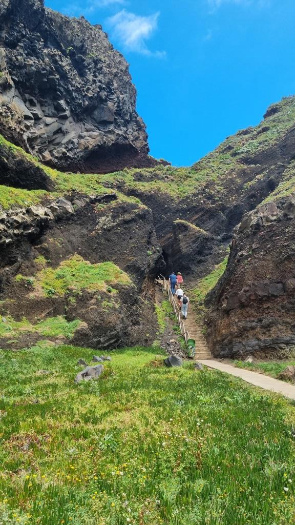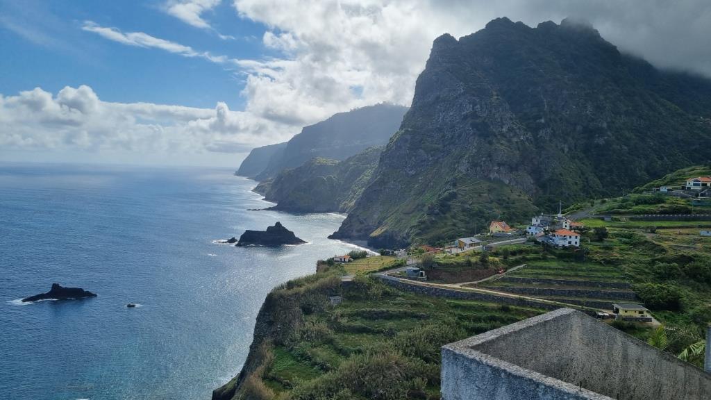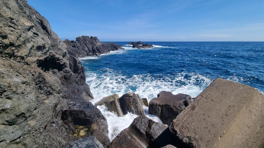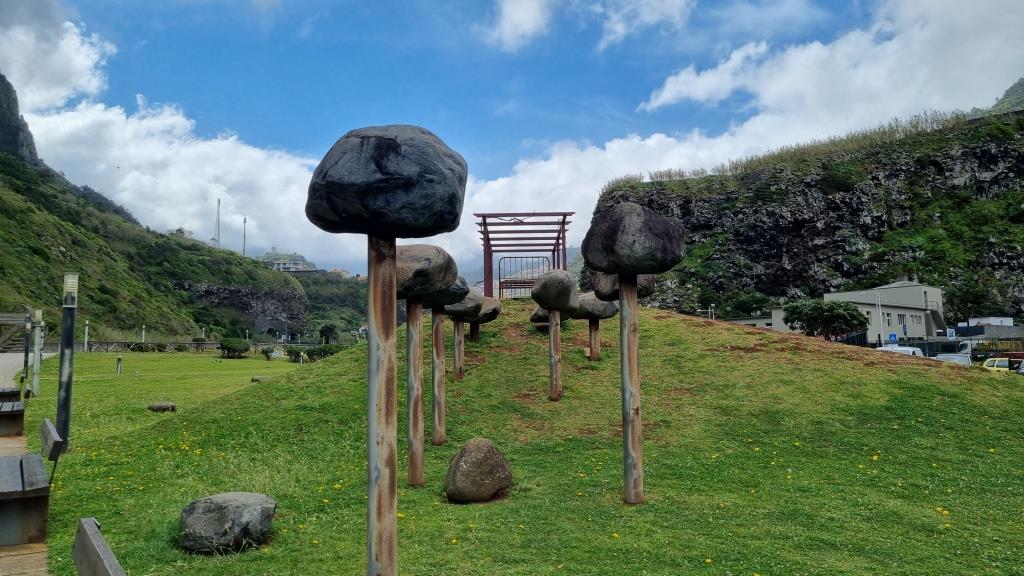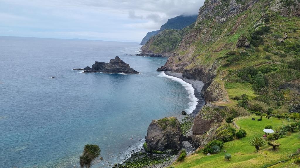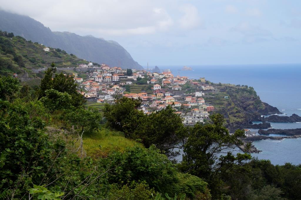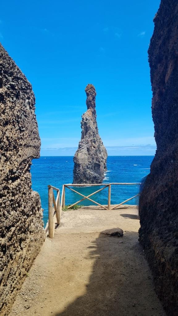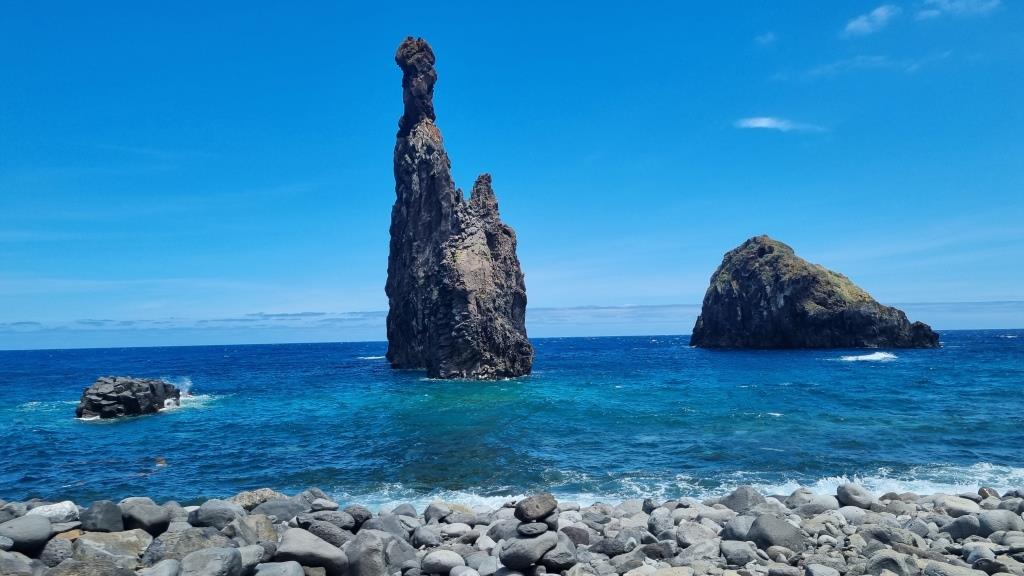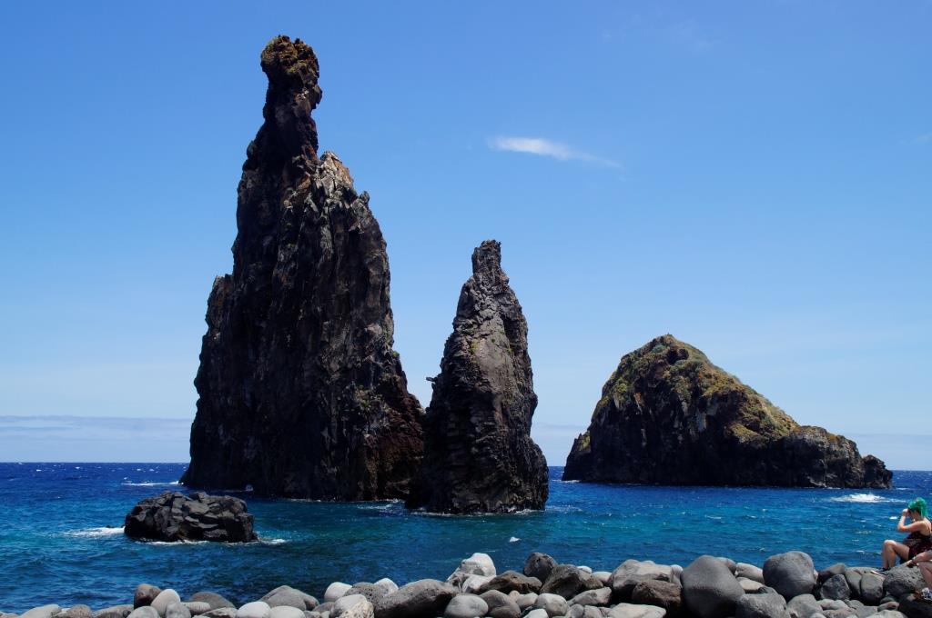 Von Seixal aus fahren wir weiter zu den Felsen von Ribeira da Janela. Auf der Nebenstrasse zum Parkplatz liegen ein paar Felsbrocken, somit getraut sich niemand zum grossen Parkplatz zu fahren und alle quetschen sich an den Strassenrand. Zu Fuss geht es dann zu den Aussichtspunkten um die markanten Felsen zu begutachten. Sehr eindrücklich.