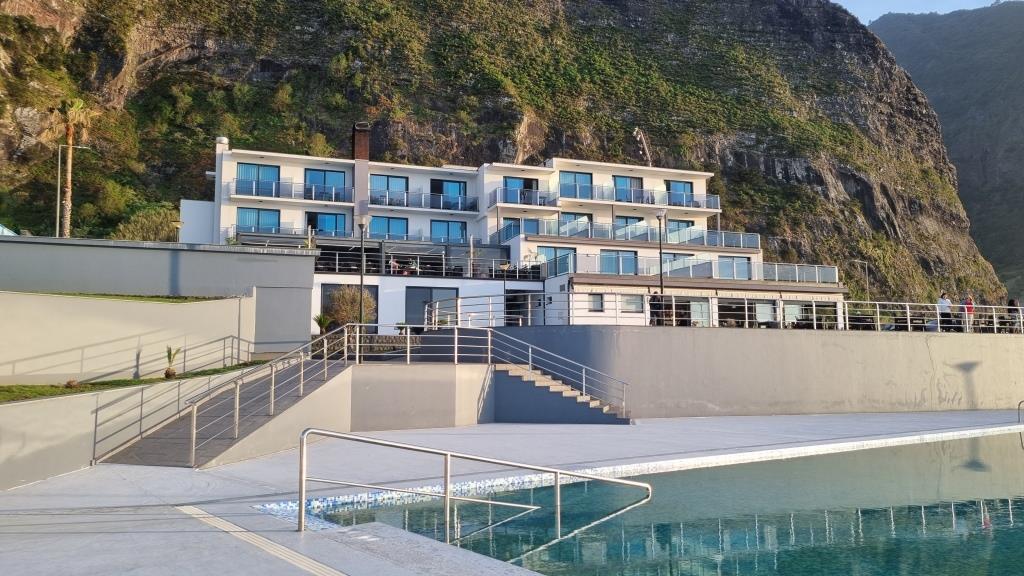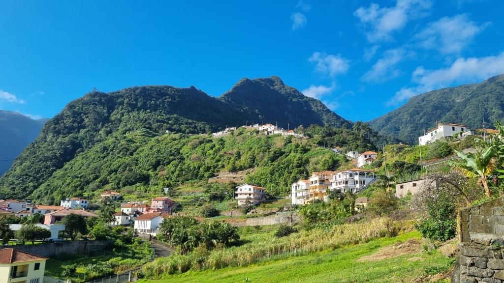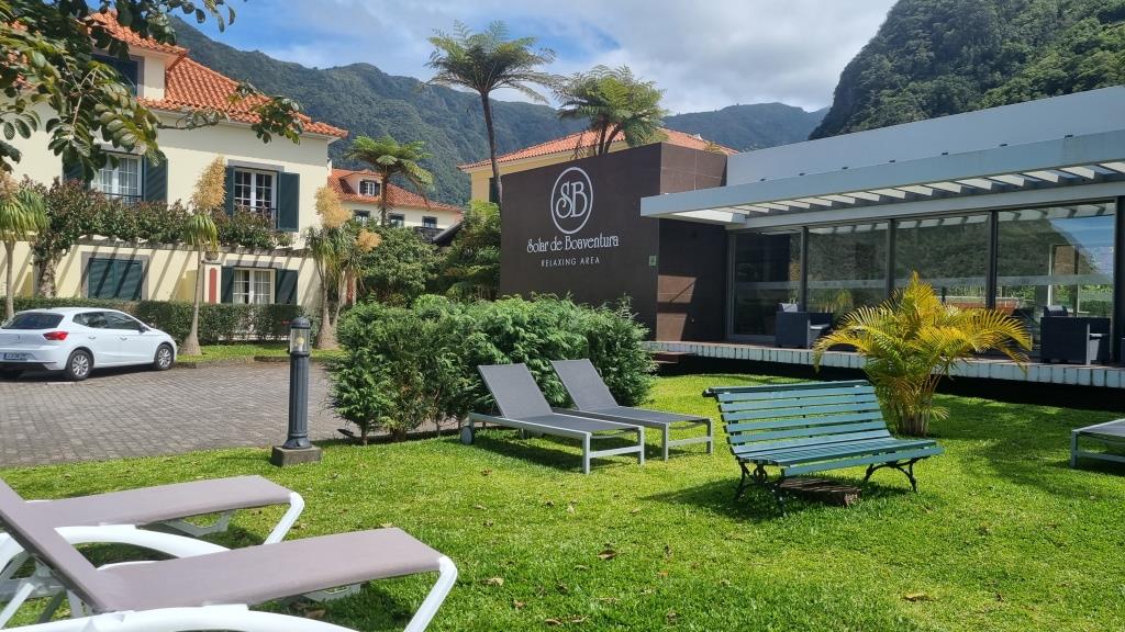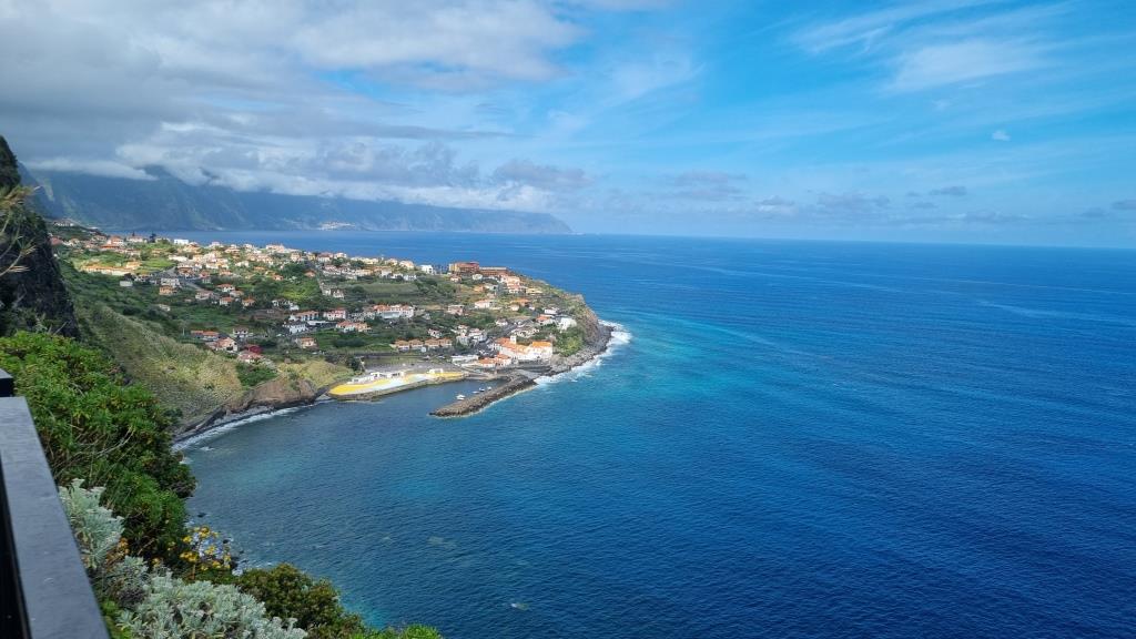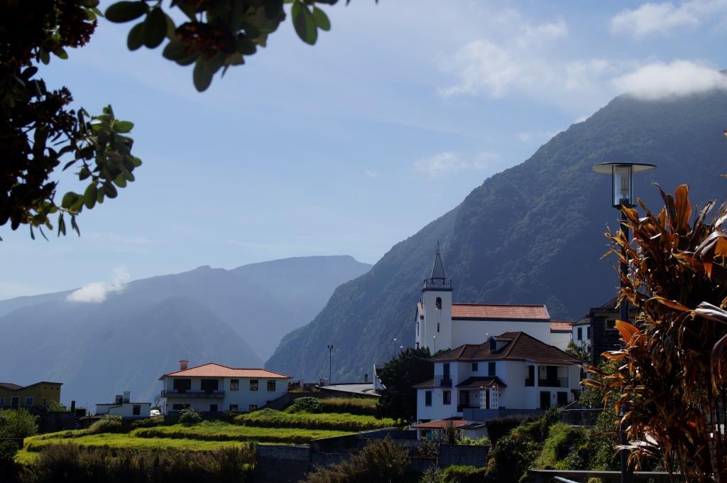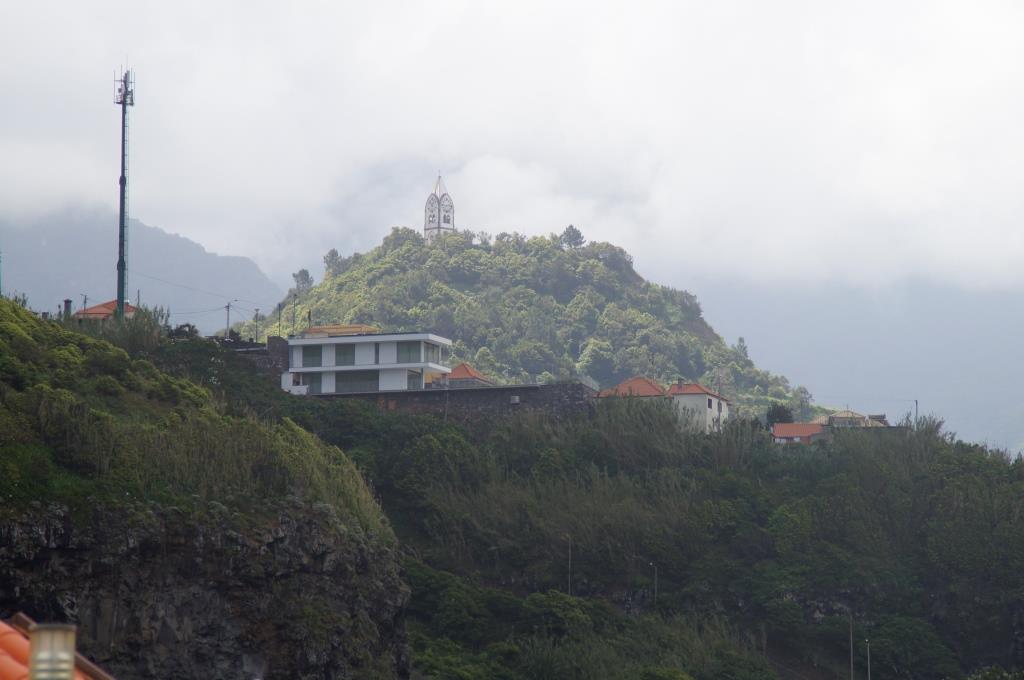 Das Hotel ist rustikal aber liebevoll eingerichtet, die Betten sind etwas schmal und die Matratzen etwas hart, das neue Schwimmbad ist sehr schön gemacht und der lauschige Garten lädt zum Verweilen ein. Nachdem wir uns eingerichtet haben machen wir uns auf den Weg hinunter zum Aussichtspunkt São Cristovão. Dort ist ein Restaurant, bei dem wir etwas essen möchten. Natürlich haben wir vergessen, es ist Sonntag, noch dazu Muttertag und alle Madeirenser gehen Mittagessen. Auf dem kleinen Restaurantparkplatz herrscht Chaos. Die Strasse hinunter ist sehr steil und eng und es ist schon kriminell beim Zuschauen wie die da aneinander vorbeikurven. Wir bekommen einen guten Parkplatz und auch ein Plätzchen im Restaurant. Leider eröffnet uns die Bedienung, die sich sehr viel Zeit liess bis sie uns berücksichtigte, dass das Restaurant in wenigen Minuten schliesst und wir leider nur etwas zu Trinken bestellen können. Na gut, wir trinken was, sehen uns die schöne Aussicht an, beschliessen jedoch nicht mehr runterzufahren, um an einem anderen Tag hier zu Abend essen.