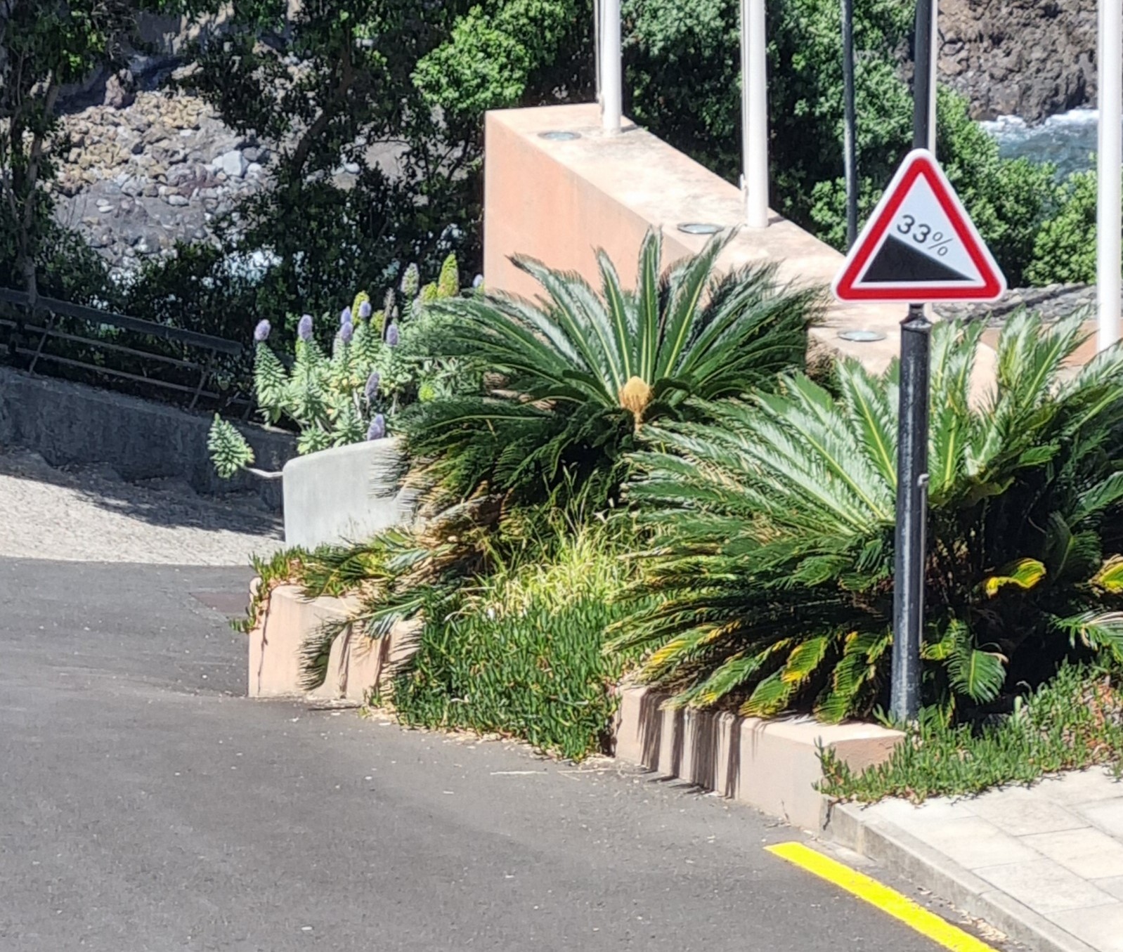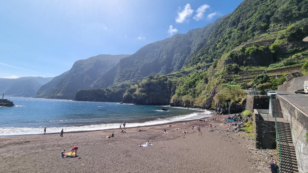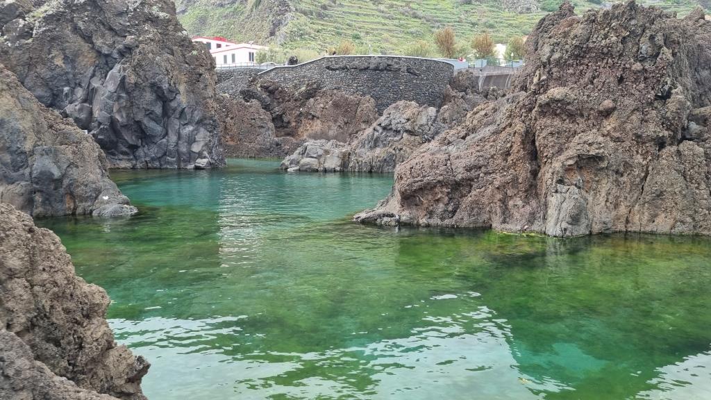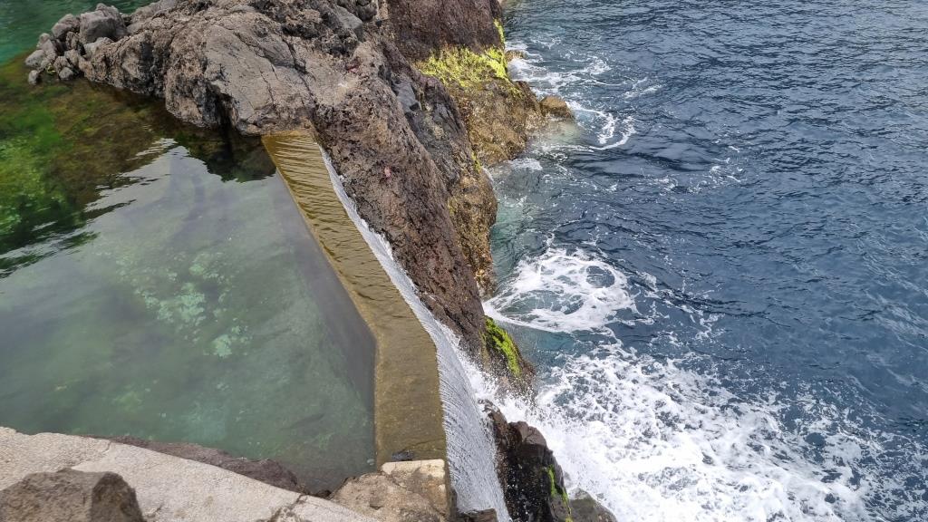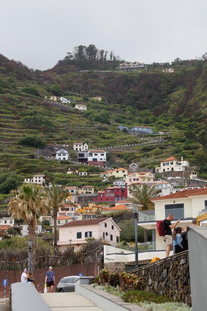 Am nächsten Morgen nach dem einfachen Frühstück fahren wir nach Seixal. Hier laufen wir hinunter zum schwarzen Strand und zum Meerwasserpool. Es hat sogar wenige Badende. Uns ist das Wasser noch zu kalt zum Baden. Wir laufen wieder hinauf ins Dorf Seixal und schauen uns den zweiten Meerwasserpool von oben aus an. Sieht schön aus, im Sommer bestimmt herrlich, hier zu planschen. Die Zufahrtsstrasse zum Parkplatz des Meerwasserpools zeigt eine Steigung von 33 % an. Na dann, viel Vergnügen. Wir bleiben lieber oben stehen.