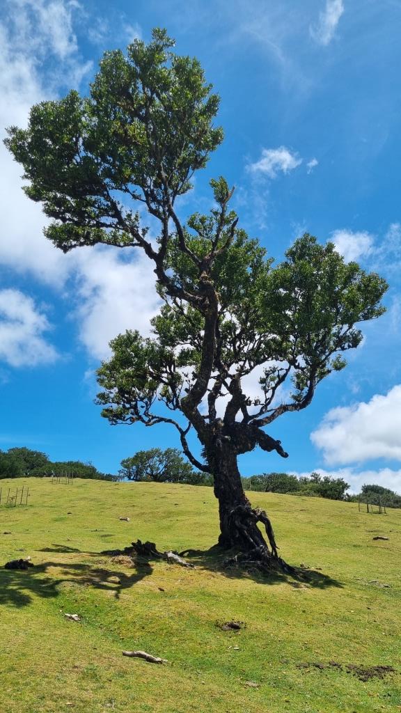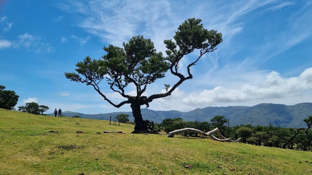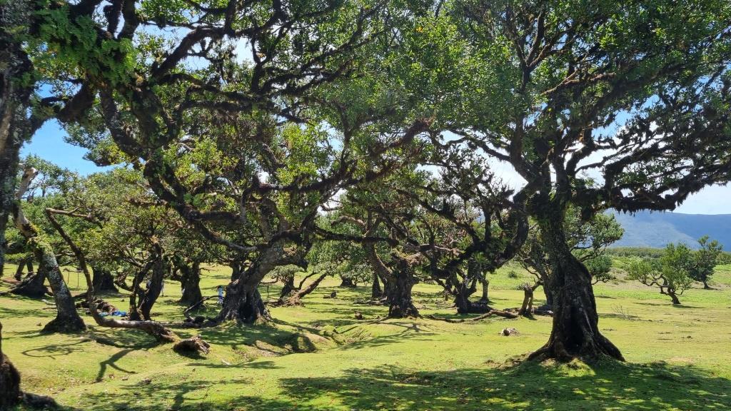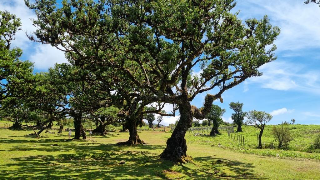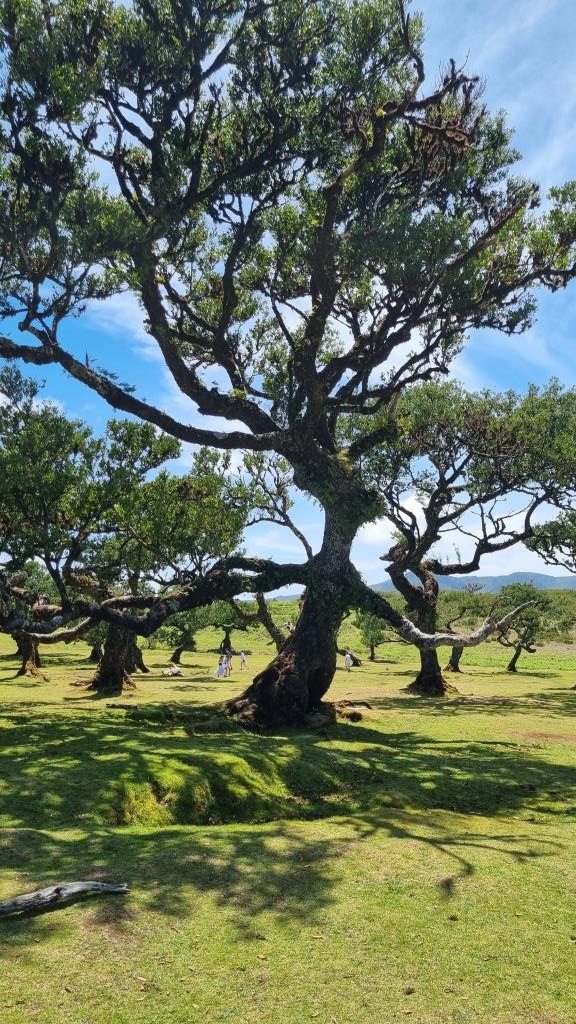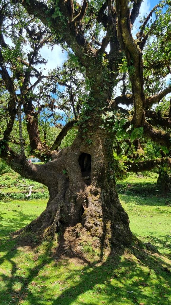 Das blaue Meer und die grüne, bergige Landschaft sehen schon toll aus. Weiter fahren wir zum Faialwald, einen Feenwald auf einer Hochebene. Wir sind gespannt. Es ist ein herrlicher, sonniger Tag, der Parkplatz beim Feenwald hat zum Glück noch genug Plätze frei. Wir spazieren einen Rundweg, vorbei an den bizarr anmutenden Lorbeerbäumen. Manche Bäume sehen aus wie knorrige Fabelfiguren mit Armen. Mit Nebel bestimmt noch eindrücklicher aber bei Sonnenschein natürlich auch sehr schön.
