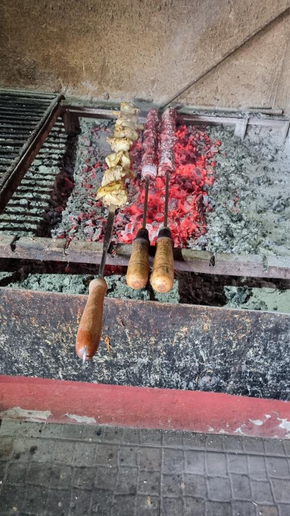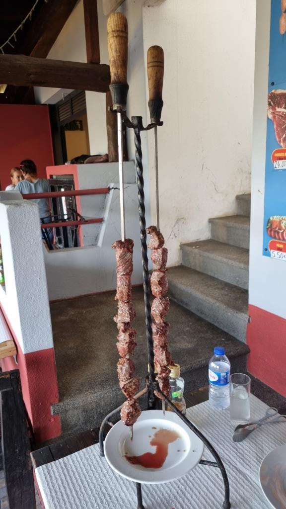 Nach diesem eindrücklichen Rundgang fahren wir wieder den selben Weg zurück zum Hotel und geniessen den Nachmittag im Garten und Hallenbad. Heute Abend wollen wir in der Churrascaria Brasa Viva vor São Vicente einen richtigen Espetada essen. Das Restaurant ist sehr einfach aber das Erlebnis wirklich toll. Der Fleischspiess wird auf einem Holzgrill gebraten und dann an den Tisch gehängt. Dazu gibt es gebratene Maiswürfel und Salat. Alles mega lecker und spannend zuzusehen wie der Spiess auf der heissen Hokzkohle brutzelt.